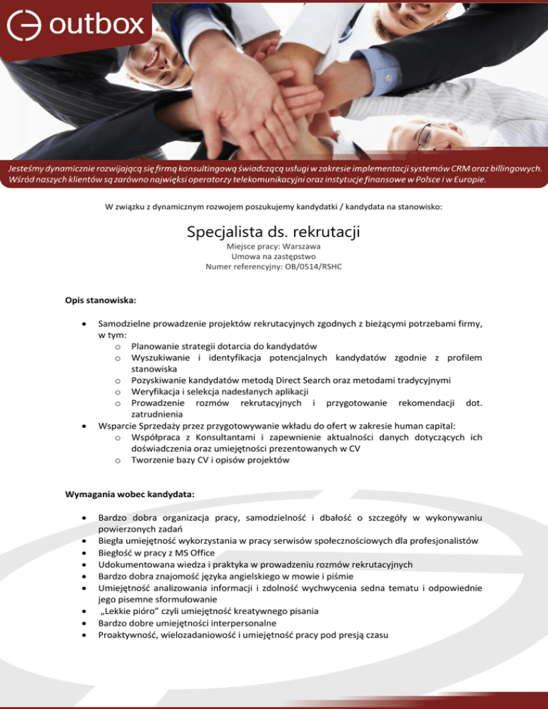 W związku z dynamicznym rozwojem poszukujemy kandydatki / kandydata na stanowisko: Specjalista ds. rekrutacji Miejsce pracy: Warszawa Umowa na zastępstwo Numer referencyjny: OB/0514/RSHC Opis stanowiska: Samodzielne prowadzenie projektów rekrutacyjnych zgodnych z bieżącymi potrzebami firmy, w tym: o Planowanie strategii dotarcia do kandydatów o Wyszukiwanie i identyfikacja potencjalnych kandydatów zgodnie z profilem stanowiska o Pozyskiwanie kandydatów metodą Direct Search oraz metodami tradycyjnymi o Weryfikacja i selekcja nadesłanych aplikacji o Prowadzenie rozmów rekrutacyjnych i przygotowanie rekomendacji dot. zatrudnienia Wsparcie Sprzedaży przez przygotowywanie wkładu do ofert w zakresie human capital: o Współpraca z Konsultantami i zapewnienie aktualności danych dotyczących ich doświadczenia oraz umiejętności prezentowanych w CV o Tworzenie bazy CV i opisów projektów Wymagania wobec kandydata: Bardzo dobra organizacja pracy, samodzielność i dbałość o szczegóły w wykonywaniu powierzonych zadań Biegła umiejętność wykorzystania w pracy serwisów społecznościowych dla profesjonalistów Biegłość w pracy z MS Office Udokumentowana wiedza i praktyka w prowadzeniu rozmów rekrutacyjnych Bardzo dobra znajomość języka angielskiego w mowie i piśmie Umiejętność analizowania informacji i zdolność wychwycenia sedna tematu i odpowiednie jego pisemne sformułowanie „Lekkie pióro” czyli umiejętność kreatywnego pisania Bardzo dobre umiejętności interpersonalne Proaktywność, wielozadaniowość i umiejętność pracy pod presją czasu Oferujemy: Możliwość aktywnego współuczestnictwa w rozwoju firmy Odpowiedzialną pracę w zgranym zespole o dużym doświadczeniu Profesjonalne środowisko pracy Dogodną lokalizację pracy Program sportowy (oferujemy kartę sportową) Prywatną opiekę medyczną wyślij swoje CV ze zdjęciem na adres [email protected] Prosimy o dołączenie do aplikacji klauzuli: „Wyrażam zgodę na przetwarzanie przez Outbox Sp. z o.o. z siedzibą w Warszawie przy ul. Puławskiej 182, moich danych osobowych zgodnie z ustawą z dnia 29 sierpnia 1997r. o ochronie danych osobowych (Dz. U. 2002, Nr 101, poz. 926 ze zm.) dla celów rekrutacyjnych teraz i w przyszłości. Jestem świadoma/y, że mam prawo dostępu do treści moich danych oraz ich poprawiania, a podanie danych jest dobrowolne.”