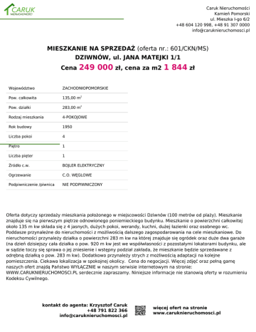 Caruk Nieruchomości Kamień Pomorski ul. Mieszka I-go 6/2 +48 604 120 998, +48 91 307 0000 [email protected] MIESZKANIE NA SPRZEDAŻ (oferta nr.: 601/CKN/MS) DZIWNÓW, ul. JANA MATEJKI 1/1 Cena 249 000 zł, cena za m2 1 844 zł Województwo ZACHODNIOPOMORSKIE Pow. całkowita 135,00 m2 Pow. działki 283,00 m2 Rodzaj mieszkania 4-POKOJOWE Rok budowy 1950 Liczba pokoi 4 Piętro 1 Liczba pięter 1 Źródło c.w. BOJLER ELEKTRYCZNY Ogrzewanie C.O. WĘGLOWE Podpiwniczenie /piwnica NIE PODPIWNICZONY Oferta dotyczy sprzedaży mieszkania położonego w miejscowości Dziwnów (100 metrów od plaży). Mieszkanie znajduje się na pierwszym piętrze odnowionego poniemieckiego budynku. Mieszkanie o powierzchni całkowitej około 135 m kw składa się z 4 jasnych, dużych pokoi, werandy, kuchni, dużej łazienki oraz osobnego wc. Poddasze przynależne do nieruchomości z możliwością dalszego zagospodarowania na cele mieszkaniowe. Do nieruchomości przynależy działka o powierzchni 283 m kw na której znajduje się ogródek oraz duże dwa garaże (na dzień dzisiejszy cała działka o pow. 920 m kw jest we współwłasności z pozostałymi lokatorami budynku, ale w sądzie toczy się sprawa o jej zniesienie i wstępny podział zakłada, że mieszkanie będzie sprzedawane z odrębną działką o pow. 283 m kw). Dodatkowo przynależy strych z możliwością adaptacji na kolejne pomieszczenia. Ciekawa lokalizacja w spokojnej okolicy. Cena do negocjacji. Więcej zdjęć oraz pełną gamę naszych ofert znajdą Państwo WYŁĄCZNIE w naszym serwisie internetowym na stronie: WWW.CARUKNIERUCHOMOSCI.PL serdecznie zapraszamy. Niniejsze informacje nie stanowią oferty w rozumieniu Kodeksu Cywilnego. kontakt do agenta: Krzysztof Caruk +48 791 822 366 [email protected] więcej ofert na stronie www.caruknieruchomosci.pl