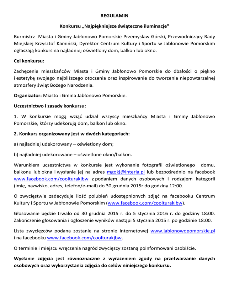 REGULAMIN Konkursu „Najpiękniejsze świąteczne iluminacje” Burmistrz Miasta i Gminy Jabłonowo Pomorskie Przemysław Górski, Przewodniczący Rady Miejskiej Krzysztof Kamiński, Dyrektor Centrum Kultury i Sportu w Jabłonowie Pomorskim ogłaszają konkurs na najładniej oświetlony dom, balkon lub okno. Cel konkursu: Zachęcenie mieszkańców Miasta i Gminy Jabłonowo Pomorskie do dbałości o piękno i estetykę swojego najbliższego otoczenia oraz inspirowanie do tworzenia niepowtarzalnej atmosfery świąt Bożego Narodzenia. Organizator: Miasto i Gmina Jabłonowo Pomorskie. Uczestnictwo i zasady konkursu: 1. W konkursie mogą wziąć udział wszyscy mieszkańcy Miasta i Gminy Jabłonowo Pomorskie, którzy udekorują dom, balkon lub okno. 2. Konkurs organizowany jest w dwóch kategoriach: a) najładniej udekorowany – oświetlony dom; b) najładniej udekorowane – oświetlone okno/balkon. Warunkiem uczestnictwa w konkursie jest wykonanie fotografii oświetlonego domu, balkonu lub okna i wysłanie jej na adres [email protected] lub bezpośrednio na facebook www.facebook.com/coolturakjbw z podaniem danych osobowych i rodzajem kategorii (imię, nazwisko, adres, telefon/e-mail) do 30 grudnia 2015r do godziny 12:00. O zwycięstwie zadecyduje ilość polubień udostępnionych zdjęć na facebooku Centrum Kultury i Sportu w Jabłonowie Pomorskim (www.facebook.com/coolturakjbw). Głosowanie będzie trwało od 30 grudnia 2015 r. do 5 stycznia 2016 r. do godziny 18:00. Zakończenie głosowania i ogłoszenie wyników nastąpi 5 stycznia 2015 r. po godzinie 18:00. Lista zwycięzców podana zostanie na stronie internetowej www.jablonowopomorskie.pl i na facebooku www.facebook.com/coolturakjbw. O terminie i miejscu wręczenia nagród zwycięzcy zostaną poinformowani osobiście. Wysłanie zdjęcia jest równoznaczne z wyrażeniem zgody na przetwarzanie danych osobowych oraz wykorzystania zdjęcia do celów niniejszego konkursu.