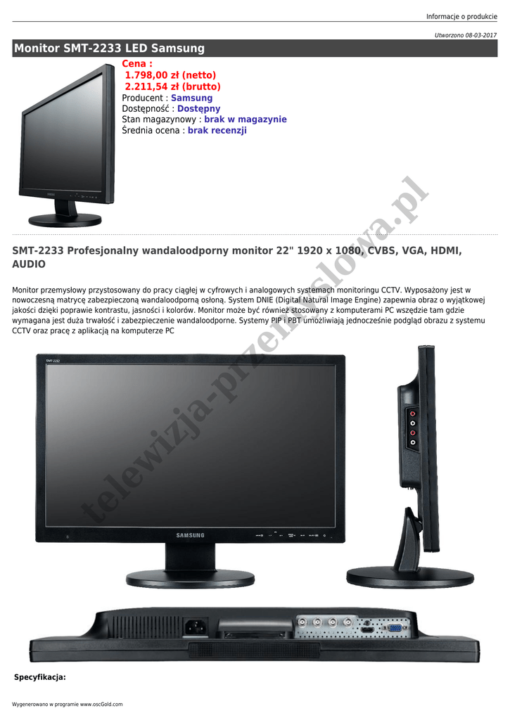 Informacje o produkcie Utworzono 08-03-2017 Monitor SMT-2233 LED Samsung Cena : 1.798,00 zł (netto) 2.211,54 zł (brutto) ze m ys lo w a. pl Producent : Samsung Dostępność : Dostępny Stan magazynowy : brak w magazynie Średnia ocena : brak recenzji SMT-2233 Profesjonalny wandaloodporny monitor 22" 1920 x 1080, CVBS, VGA, HDMI, AUDIO te le w iz ja -p r Monitor przemysłowy przystosowany do pracy ciągłej w cyfrowych i analogowych systemach monitoringu CCTV. Wyposażony jest w nowoczesną matrycę zabezpieczoną wandaloodporną osłoną. System DNIE (Digital Natural Image Engine) zapewnia obraz o wyjątkowej jakości dzięki poprawie kontrastu, jasności i kolorów. Monitor może być również stosowany z komputerami PC wszędzie tam gdzie wymagana jest duża trwałość i zabezpieczenie wandaloodporne. Systemy PIP i PBT umożliwiają jednocześnie podgląd obrazu z systemu CCTV oraz pracę z aplikacją na komputerze PC Specyfikacja: Wygenerowano w programie www.oscGold.com 1920 x 1080 Proporcje ekranu 16:9 Kąt widzenia 170°/160° Ilość kolorów 16,7 mln Jasność 250 cd/m2 Kontrast 1000:1 Czas reakcji matrycy 5 ms MTBF 30000 godzin (matryca) System PAL / NTSC Wejścia wizji 2 x BNC przelotowe Wejście RGB 1 (15 pin D-Sub / DVI) Wejście HDMI 1 (A) Wejście audio PC stereo 2 x RCA (2 wejścia stereo) Głośniki 2x1W Filtr 3D Comb tak Plug & Play VESA DPM Zabezpieczenia Szkło optyczne Konfiguracja OSD Wymiary 515 x 391,8 x 217,4 mm ( z podstawą ) Waga 5,18 kg VESA 100x100 mm Zasilanie 100..240 V AC Pobór mocy 24 W Temperatura pracy 0..40 °C -p r w iz ja le te pl Rozdzielczość a. 22 " (LED) ze m ys lo w Rozmiar matrycy Informacje o produkcie te le w iz ja -p r ze m ys lo w a. pl zadzwoń i zapytaj o rabat (22 672-36-36) (505-130-571) Wygenerowano w programie www.oscGold.com