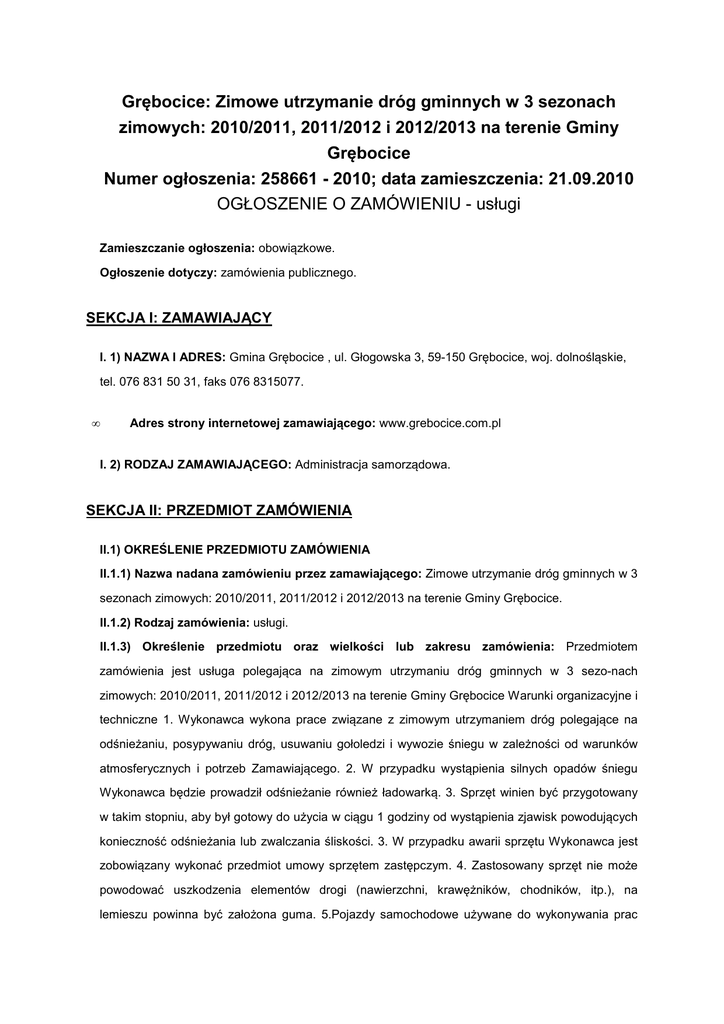 Grębocice: Zimowe utrzymanie dróg gminnych w 3 sezonach zimowych: 2010/2011, 2011/2012 i 2012/2013 na terenie Gminy Grębocice Numer ogłoszenia: 258661 - 2010; data zamieszczenia: 21.09.2010 OGŁOSZENIE O ZAMÓWIENIU - usługi Zamieszczanie ogłoszenia: obowiązkowe. Ogłoszenie dotyczy: zamówienia publicznego. SEKCJA I: ZAMAWIAJĄCY I. 1) NAZWA I ADRES: Gmina Grębocice , ul. Głogowska 3, 59-150 Grębocice, woj. dolnośląskie, tel. 076 831 50 31, faks 076 8315077. • Adres strony internetowej zamawiającego: www.grebocice.com.pl I. 2) RODZAJ ZAMAWIAJĄCEGO: Administracja samorządowa. SEKCJA II: PRZEDMIOT ZAMÓWIENIA II.1) OKREŚLENIE PRZEDMIOTU ZAMÓWIENIA II.1.1) Nazwa nadana zamówieniu przez zamawiającego: Zimowe utrzymanie dróg gminnych w 3 sezonach zimowych: 2010/2011, 2011/2012 i 2012/2013 na terenie Gminy Grębocice. II.1.2) Rodzaj zamówienia: usługi. II.1.3) Określenie przedmiotu oraz wielkości lub zakresu zamówienia: Przedmiotem zamówienia jest usługa polegająca na zimowym utrzymaniu dróg gminnych w 3 sezo-nach zimowych: 2010/2011, 2011/2012 i 2012/2013 na terenie Gminy Grębocice Warunki organizacyjne i techniczne 1. Wykonawca wykona prace związane z zimowym utrzymaniem dróg polegające na odśnieżaniu, posypywaniu dróg, usuwaniu gołoledzi i wywozie śniegu w zależności od warunków atmosferycznych i potrzeb Zamawiającego. 2. W przypadku wystąpienia silnych opadów śniegu Wykonawca będzie prowadził odśnieżanie również ładowarką. 3. Sprzęt winien być przygotowany w takim stopniu, aby był gotowy do użycia w ciągu 1 godziny od wystąpienia zjawisk powodujących konieczność odśnieżania lub zwalczania śliskości. 3. W przypadku awarii sprzętu Wykonawca jest zobowiązany wykonać przedmiot umowy sprzętem zastępczym. 4. Zastosowany sprzęt nie może powodować uszkodzenia elementów drogi (nawierzchni, krawężników, chodników, itp.), na lemieszu powinna być założona guma. 5.Pojazdy samochodowe używane do wykonywania prac przy odśnieżaniu dróg i zwalczaniu śliskości zimowej powinny być wyposażone w ostrzegawcze sygnały świetlne błyskowe barwy żółtej. 6.Zakup i składowanie materiałów służących zimowemu utrzymaniu dróg leży po stronie Wykonawcy i wliczony jest w koszt usługi. 7.Wywóz nadmiaru piasku po zakończonej akcji zimowego utrzymania dróg leży po stronie Wykonawcy. 8.Wykonawca decyduje o rozpoczęciu posypywania i odśnieżania dróg w uzgodnieniu z Zamawiającym. Wykonawca rozpocznie pracę bez zbędnej zwłoki. 9.Wykonawca wyznaczy osoby odpowiedzialne za wykonywanie usług w zakresie zimowego utrzymania dróg i ulic, wyposażoną w środki łączności zapewniające możliwość kontaktu przez całą dobę. 10.Zamawiający zastrzega sobie prawo do zwiększenia ilości dróg objętych usługą zimowego utrzymania dróg w całym okresie trwania zamówienia. Szczegółowy opis zadania: 1. Odśnieżanie dróg gminnych 1)Przedmiot zamówienia obejmuje utrzymanie dróg gminnych publicznych i wewnętrznych na terenie Gminy Grębocice w niżej wymienionych miejscowościach: -Grębocice: ul. Wspólna, Krótka, Kościelna, Spółdzielcza (do owczarni i oczyszczalni), Kolejowa, Zielona, Działkowa, Szkolna, Wąska, Cicha, Polna, Parkowa część Legnickiej na odcinku od drogi powiatowej koło ogrodów działkowych; -Retków od drogi powiatowej do osiedla; -Kwielice na odcinkach od drogi powiatowej w kierunku do Jaczewa i Kurowa (do granicy gminy) i łączące je rozwidlenia; -Ogorzelec droga za świetlicą; -Obiszów odcinek od drogi powiatowej do kościoła, za przystankiem i do posesji nr 28; od drogi powiatowej przy posesji nr 33 do 36; -Duża Wólka - droga wewnętrzna od drogi powiatowej, koło wigwamu, leśniczówki i do przystanku oraz do drogi powiatowej w kierunku Świnina; -Świnino - od kapliczki do kościoła; -Bieńków - od zatoczki autobusowej do posesji nr 8; -Wilczyn - pętla do drogi powiatowej przy posesji nr 6; -Czerńczyce - od drogi powiatowej do bloków do posesji nr 20; -Bucze - od powiatowej do Szymocina; -Szymocin - przez wieś polbrukowa i żużlowa do drogi powiatowej; Żabice - droga nowa polbrukowa łącząca drogi powiatowe (Żabice - Piersna i Szymocin -Żabice) i równoległa do niej (do domków jednorodzinnych); -Rzeczyca - od drogi powiatowej koło szkoły i leśniczówki, do drogi na Orsk; -Trzęsów - nowa z kostki polbrukowej przy remizie i boisku, pętla łącząca drogi wojewódzkie; -Krzydłowice - rozwidlenia od drogi powiatowej; -Grodziszcze rozwidlenia od drogi powiatowej, do Proszyc (żużlowa); -Grodowiec - od drogi powiatowej koło plebani, do Żukowa (do granicy gminy); -Stara Rzeka - nowa polbrukowa koło starej świetlicy, koło nowej świetlicy; Załącznik graficzny przedstawiający sieć dróg objętych przedmiotem zamówienia dostępny w formie papierowej w siedzibie Zamawiającego. Zaleca się, aby wykonawca dokonał wizji lokalnej w terenie przy udziale pracownika Urzędu Gminy, a także zdobył, na swoją własną odpowiedzialność i ryzyko, wszelkie dodatkowe informacje, które mogą być konieczne do przygotowania oferty oraz zawarcia umowy i realizacji zamówienia. Koszty dokonania wizji lokalnej w terenie poniesie wykonawca 2) Pozostałe drogi gminne wg potrzeb zgłaszanych przez Zamawiającego. 3) Szerokość odśnieżania jezdni powinna obejmować 90% jej szerokości łącznie z zatokami autobusowymi. 4) Przy wykonaniu odśnieżania niedopuszczalne jest zsypywanie śniegu na drogi boczne, skrzyżowania i wjazdy, śnieg powinien być usunięty na pobocze. 5) Wykonawca zobowiązany jest do rozpoczęcia pracy od godz. 5.00 (przez 7 dni w tygodniu) a w szczególnych przypadkach (długotrwałe zamiecie i opady śniegu) - do rozpoczęcia odśnieżania w trakcie w/w zjawisk na każde żądanie (telefoniczne) przez zamawiającego, oraz w przypadkach szczególnie uzasadnionych do usuwania śliskości nawierzchni - po uzgodnieniu z Zamawiającym. Kolejno
