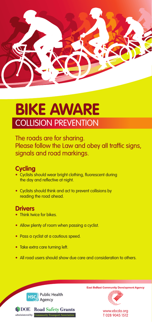 BIKE AWARE COLLISION PREVENTION The roads are for sharing. Please follow the Law and obey all traffic signs, signals and road markings. Cycling • Cyclists should wear bright clothing, fluorescent during the day and reflective at night. • Cyclists should think and act to prevent collisions by reading the road ahead. Drivers • Think twice for bikes. • Allow plenty of room when passing a cyclist. • Pass a cyclist at a cautious speed. • Take extra care turning left. • All road users should show due care and consideration to others. www.ebcda.org T 028 9045 1512 Bikeway wschód Bike świadomość Zapobieganie wypadkom Drogi są do wymiany. Należy postępować zgodnie z Prawenn i stosuowod się do wszystkich znaków drogowych, sygnałów i znaków drogowych. Kolarstwo • Rowerzyści powinni nosić jasne ubrania, najlepiej odblaskowe w oziek i w nocy. • Rowerzyści powinni myśleć i działać, by zapobiegać kolizjom poprzez obserwowanie drogi. Kierowcó • Pomyśl dwa razy za siebie i za kierujacego rowerem. • Pozostew odpowiednioa ilosc miejsca dle rowerzystow. • Dostosuj wiasciwa predkosc do kierujacych rowerami. • Należy zachować szczególną ostrożność skiacajac w lewo. • Wszyscy użytkownicy dróg powinni wykazać należytą ostroznosc olbajac o siebie i o innyds kierujgcycls. www.ebcda.org T 028 9045 1512