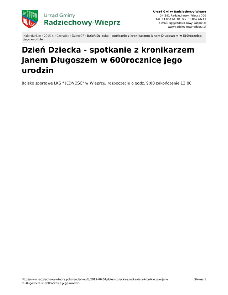 Urząd Gminy Radziechowy-Wieprz 34-381 Radziechowy, Wieprz 700 tel. 33 867 66 10, fax. 33 867 66 13 e-mail: [email protected] www.radziechowy-wieprz.pl Kalendarium › 2015 r. › Czerwiec › Dzień 07 › Dzień Dziecka - spotkanie z kronikarzem Janem Długoszem w 600rocznicę jego urodzin Dzień Dziecka - spotkanie z kronikarzem Janem Długoszem w 600rocznicę jego urodzin Boisko sportowe LKS " JEDNOŚĆ" w Wieprzu, rozpoczecie o godz. 9:00 zakończenie 13:00 http://www.radziechowy-wieprz.pl/kalendarium/d,2015-06-07/dzien-dziecka-spotkanie-z-kronikarzem-jane m-dlugoszem-w-600rocznice-jego-urodzin Strona 1