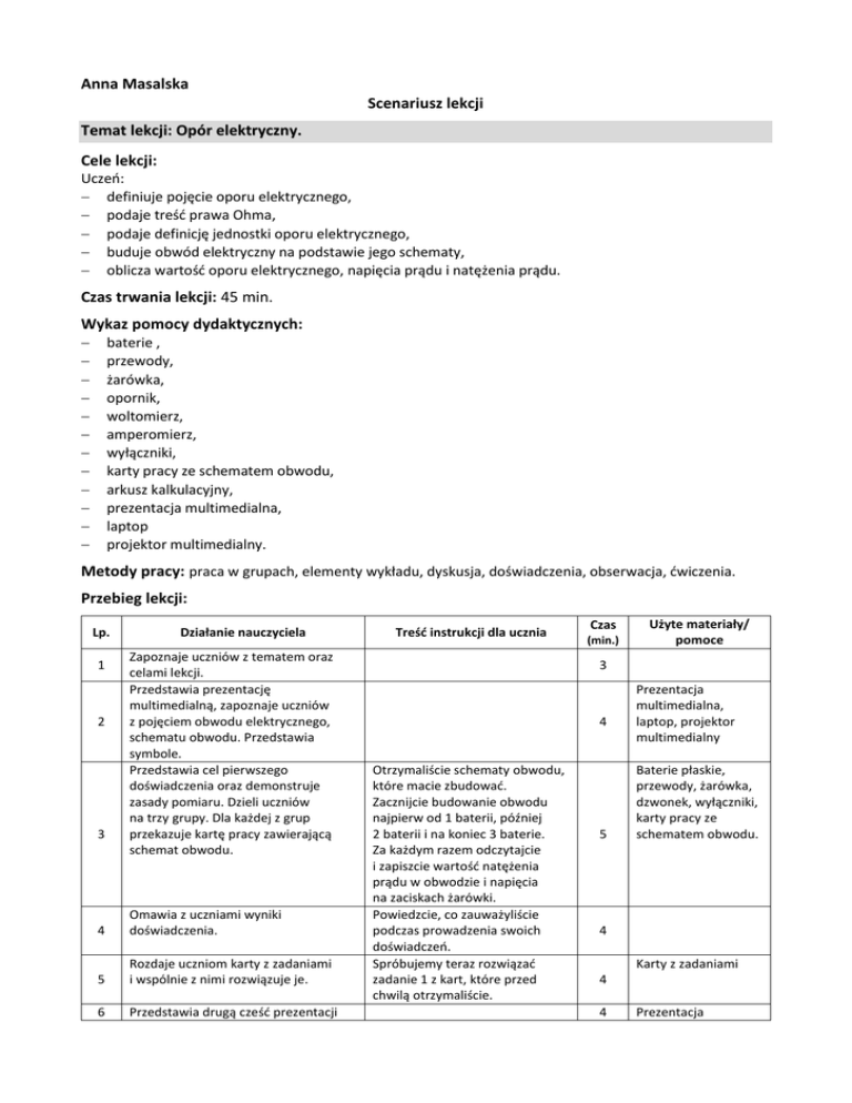Anna Masalska Scenariusz lekcji Temat lekcji: Opór elektryczny