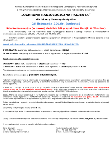 Komisja Kształcenia oraz Komisja Stomatologiczna Dolnośląskiej Rady Lekarskiej wraz z firmą Pozytron radiologia medyczna zapraszają na kurs radiologiczny z zakresu: „OCHRONA RADIOLOGICZNA PACJENTA” dla lekarzy i lekarzy dentystów 26 listopada 2016r. (sobota) Sala Konferencyjna (w dawnej siedzibie DIL przy al. Jana Matejki 6, Wrocław) Kurs przeznaczony jest dla wszystkich osób wykonujących badania i zabiegi lecznicze z wykorzystaniem promieniowania jonizującego LST, LR, LMN, LRZ, LIX, FT, PMN, LRT. Szkolenie zostanie przeprowadzone zgodnie z programem określonym w Rozporządzeniu Ministra Zdrowia z dnia 18 lutego 2011 r. Koszt szkolenia dla członków DOLNOŚLĄSKIEJ IZBY LEKARSKIEJ: I WARIANT: materiały szkoleniowe + koszt egzaminu= 290zł II WARIANT: materiały szkoleniowe + koszt egzaminu + repetytorium*= 420zł Koszt szkolenia dla pozostałych osób: I WARIANT: 300zł mat. szkoleniowe + 140zł koszt egzaminu = 440zł II WARIANT: 300zł mat. szkoleniowe + 140zł koszt egzaminu + 130zł repetytorium* = 570zł *(w dniu egzaminu planowane są Za szkolenie przyznane jest 3 godzinne warsztaty podsumowujące) 7 punktów edukacyjnych. Materiały szkoleniowe wraz z informacją organizacyjną zostaną udostępnione wszystkim uczestnikom w wersji on-line po dokonaniu rejestracji. Uprzejmie prosimy o dokładne zapoznanie się z przesłanymi materiałami, które są podstawą do zdania egzaminu. W dniu 26.11.2016 r. w godz. 9.00 – 12.00 dla osób chcących ugruntować swoją wiedzę planowane jest 3 godzinne repetytorium w formie wykładu powtórzeniowego, który obejmuje przesłane uczestnikom materiały szkoleniowe. Udział w repetytorium gwarantuje wniesienie opłaty zgodnie z II WARIANTEM szkolenia. Osoby, które nie chcą uczestniczyć w repetytorium proszone są o dokładne zapoznanie się z przesłanymi materiałami oraz wniesienie opłaty zgodnie z I WARIANTEM szkolenia. Prosimy o przybycie na egzamin na godz. 12.00. Planowane zakończenie egzaminu wraz z ogłoszeniem wyników oraz wręczeniem certyfikatów około godz. 14.30. Opłaty za szkolenie i egzamin uczestnik będzie zobowiązany zapłacić indywidualnie na wskazany w potwierdzeniu rejestracji numer konta. Otrzymany certyfikat jest ważny przez 5 lat. W przypadku zbyt małej liczby uczestników, organizatorzy zastrzegają sobie możliwość zmiany terminu egzaminu. Osoby zainteresowane wzięciem udziału w szkoleniu proszone są o rejestrację na stronie www.pozytron.pl/lista-szkole W przypadku pytań proszę o kontakt telefoniczny lub mailowy: Daria Stempin tel.: + 48 505 440 173 e-mail: [email protected] Martyna Jankowiak-Guzior tel.: + 48 502 268 684 e-mail: [email protected]