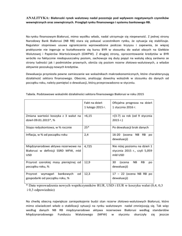 ANALITYKA: Białoruski rynek walutowy nadal pozostaje pod wpływem negatywnych czynników wewnętrznych oraz zewnętrznych. Przegląd rynku finansowego i systemu bankowego RB. Na rynku finansowym Białorusi, mimo wysiłku władz, nadal utrzymuje się niepewność. Z jednej strony Narodowy Bank Białorusi (NB RB) stara się pokazać uczestnikom rynku, że sytuacja się stabilizuje. Regulator stopniowo usuwa ograniczenia wprowadzone podczas kryzysu i zapewnia, że więcej praktycznie nie ingeruje w kształtowanie się kursu BYR w stosunku do walut obcych na Giełdzie Walutowej i Papierów Wartościowych (GWPW). Z drugiej strony, oprocentowanie kredytów w BYR wróciło na faktycznie niedopuszczalny poziom, zachowuje się duży popyt na walutę obcą zarówno ze strony ludności jak i podmiotów prawnych, obniża się poziom rezerw złotowo-walutowych, a władze aktywnie poszukują nowych kredytów. Dewaluacja przyniosła pewne zamieszanie we wskaźnikach makroekonomicznych, które charakteryzują działalność sektora finansowego. Obecnie, analizując dowolny wskaźnik w stosunku do danych od początku roku, należy pamiętać o dewaluacji, którą przeprowadzono w styczniu. Tabela. Podstawowe wskaźniki działalności sektora finansowego Białorusi w roku 2015 Fakt na dzień 1 lutego 2015 r. Oficjalna prognoza na dzień 1 stycznia 2016 r. Zmiana wartości koszyka z 3 walut na +6,15 dzień 09.01.2015*, % +(3-7) za rok (od 9 stycznia 2015 r.) Stopa redyskontowa, w % rocznie 25* Po dewaluacji brak danych Inflacja, w % od początku roku 2,4 16-20 (ocena NB RB po dewaluacji) Międzynarodowe aktywa rezerwowe na 4,725 Białorusi w definicji SSRD MFW, mld USD Nie niżej poziomu na dzień 1 stycznia 2015 r., czyli 5,059 mld USD Przyrost szerokiej masy pieniężnej od 12,9 początku roku, % 30 (ocena dewaluacji) Przyrost wymagań bankowych gospodarki od początku roku, % 17 – 22 (ocena NB RB po dewaluacji) od 12,3 NB RB po * Data wprowadzenia nowych współczynników RUR, USD i EUR w koszyku walut (0,4, 0,3 i 0,3 odpowiednio) Na chwilę obecną największe zaniepokojenie budzi stan rezerw złotowo-walutowych Białorusi, które mimo oświadczeń władz o stabilizacji sytuacji na rynku walutowym nadal zmniejszają się. Tak więc według danych NB RB międzynarodowe aktywa rezerwowe Białorusi według standardów Międzynarodowego Funduszu Walutowego (MFW) w styczniu skurczyły się jeszcze o 334,4 mln USD, czyli o 6,6%. W tym rezerwy walutowe spadły do 373,5 mln USD, czyli o 13%. Zdaniem regulatora "spadek rezerw walutowych w styczniu 2015 r. był częściowo spowodowany całościową spłatą wewnętrznych i zewnętrznych zobowiązań w walucie obcej przez Rząd oraz NB RB". KUPOWANO MNIEJ WALUTY Warto zauważyć, że brak dostępności waluty na początku stycznia br., jak również zwiększenie normy obowiązkowej odsprzedaży wpływów walutowych, przyczyniły się do obniżenia zakupu netto waluty obcej przez osoby fizyczne oraz prawne. Wg danych regulatora, w styczniu 2015 roku na krajowym rynku walutowym podmioty gospodarcze (rezydenci) kupiły łącznie 66,9 mln USD netto po 450-ciu mln USD w grudniu 2014 r. Zakup walut obcych netto przez osoby fizyczne w styczniu br. wyniósł wg NB RB 37,2 mln USD w porównaniu do 328,1 mln USD w grudniu ubiegłego roku. Nierezydenci z kolei sprzedali w styczniu 18,2 mln USD netto w porównaniu do 35,9 mln USD w poprzednim miesiącu (z wyłączeniem transakcji zgodnie z Porozumieniem w sprawie wprowadzenia i stosowania w Unii Celnej procedury rejestracji i dystrybucji ceł). Wkrótce możemy oczekiwać na częściową zamianę na walutę depozytów rublowych, które zostały otwarte w drugiej połowie grudnia 2014 r. - początku stycznia 2015 r. z powodu braku waluty. Dewaluacja wprowadziła pewne trudności do analizy masy pieniężnej (MP). Zatem masa pieniężna w rublach (M2*) w styczniu spadła o 9,6% do 82,2 bilionów BYR na dzień 1 lutego. O 2,3% do 12,3 mld USD spadł komponent walutowy MP. Jednakże całkowita wielkość MP w styczniu 2015 r. wzrosła o 12,9% do 227,3 bilionów BYR na dzień 1 lutego. Innymi słowy, jeśli weźmiemy pod uwagę tylko dynamikę masy pieniężnej w rublach, sytuacja może być oceniona pozytywnie, ponieważ zmniejszenie w obiegu BYR powinno mieć pozytywny wpływ na ograniczenie tempa inflacji i zmniejszenie presji na kurs walutowy. Z drugiej zaś strony, jeśli rozpatrzymy całą dynamikę MP (właśnie tak robi NB RB przy tworzeniu wskaźników prognozowych), to otrzymany wzrost o 12,9% w ciągu zaledwie jednego miesiąca przy prognozie rocznej na poziomie 30% wygląda zagrażająco. DEPOZYTY W BYR POKAZUJĄ NIEWIELKI WZROST Można zauważyć, że w styczniu ustał odpływ depozytów w walucie BYR z banków krajowych. Wg danych NB RB po spadku o 14,6% w grudniu 2014 r., w styczniu 2015 r. depozyty terminowe wzrosły o 4,7% (o 1,3 biliona BYR) do 28,5 bilionów BYR na dzień 1 lutego. Zbywalne depozyty, po spadku w grudniu do 10,6%, w styczniu skurczyły się o 7,5% (o 0,9 bilionów BYR) do 11,5 bilionów BYR. Tak więc, w styczniu sumarycznie depozyty w BYR odnotowały niewielki przyrost. W styczniu tego roku odnotowano niewielki odpływ depozytów walutowych. Według NB RB, terminowe depozyty w BYR oraz depozyty na żądanie w pierwszym miesiącu roku zmniejszyły się o 2% do 7,9 mld USD na dzień 1 lutego br. Wg innego scenariusza rozwijała się sytuacja z depozytami w walucie BYR osób prawnych. Ogólne zmniejszenie pozostałości BYR na kontach przedsiębiorstw za styczeń 2015 r. wyniosło 24,1%, - czyli 8,8 bilionów BYR. Może to świadczyć o tym, że przedsiębiorstwa w rygorystycznych warunkach kredytowania zostały zmuszone do wydania swoich własnych środków. Innym czynnikiem, który mógł przyczynić się do pozbycia się pozostałości BYR na rachunkach, są zwiększone oczekiwania dewaluacyjne, mimo już zaistniałej deprecjacji BYR. Potwierdzać może to fakt, że resztki na kontach waluto