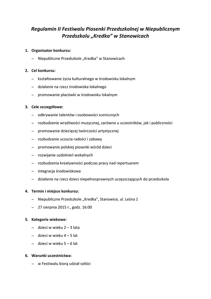 Regulamin II Festiwalu Piosenki Przedszkolnej w Niepublicznym Przedszkolu „Kredka” w Stanowicach 1. Organizator konkursu: − Niepubliczne Przedszkole „Kredka” w Stanowicach 2. Cel konkursu: − kształtowanie życia kulturalnego w środowisku lokalnym − działanie na rzecz środowiska lokalnego − promowanie placówki w środowisku lokalnym 3. Cele szczegółowe: − odkrywanie talentów i osobowości scenicznych − rozbudzenie wrażliwości muzycznej, zarówno u uczestników, jak i publiczności − promowanie dziecięcej twórczości artystycznej − rozbudzanie uczucia radości i zabawy − promowanie polskiej piosenki wśród dzieci − rozwijanie uzdolnień wokalnych − rozbudzenia kreatywności podczas pracy nad repertuarem − integracja środowiskowa − działanie na rzecz dzieci niepełnosprawnych uczęszczających do przedszkola 4. Termin i miejsce konkursu: − Niepubliczne Przedszkole „Kredka”, Stanowice, ul. Leśna 1 − 27 sierpnia 2015 r., godz. 16:00 5. Kategorie wiekowe: − dzieci w wieku 2 – 3 lata − dzieci w wieku 4 – 5 lat − dzieci w wieku 5 – 6 lat 6. Warunki uczestnictwa: − w Festiwalu biorą udział soliści − uczestnicy zgłaszają swój udział w Festiwalu w terminie do 30 czerwca 2015 r. − zgłoszenie kandydata jest równoznaczne z akceptacją regulaminu Festiwalu − każdy wykonawca prezentuje jeden utwór z akompaniamentem, podkładem muzycz-‐ nym lub a cappella − każdy uczestnik prezentuje jedną piosenkę o dowolnej tematyce 7. Kryteria oceny: a) Organizator powołuje Komisję Konkursową, która oceniać będzie: − dobór repertuaru dostosowany do wieku − muzykalność − walory głosowe − estetyka i dostosowanie ubioru do prezentowanego utworu − inscenizacja ruchowa − ogólny wyraz artystyczny (mile widziane wykorzystanie instrumentów) − osobowość sceniczną uczestnika b) Komisja Konkursowa ocenia występ uczestnika według ww. kryteriów c) dla zwycięzców z każdej kategorii przewidziano pamiątkową statuetkę d) wszyscy uczestnicy naszego Festiwalu otrzymują dyplomy i drobne nagrody rzeczowe e) w trakcie przerwy Festiwalowej, podczas obrad Komisji Konkursowej, zorganizowana zostanie loteria fantowa, z której dochód zostanie przeznaczony na rzecz dzieci nie-‐ pełnosprawnych z naszego przedszkola. 8. Przygotowanie uczestników: − Rodzice 9. Uwagi końcowe: − sprawy nie ujęte w regulaminie rozstrzyga jury i organizator − każdego wykonawcę zapraszamy z rodzicem bądź opiekunem − zgłoszenia uczestnictwa i wszelkie informacje pod tel. 513021811 lub osobiście w pla-‐ cówce w godzinach 8:00 – 15:00 Oprac. Joanna Kuś, Edyta Olichwer