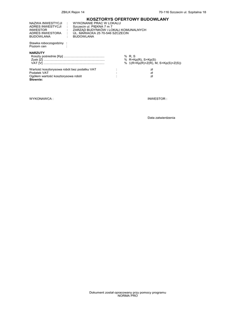 ZBILK Rejon 14 70-116 Szczecin ul. Szpitalna 18 KOSZTORYS OFERTOWY BUDOWLANY NAZWA INWESTYCJI ADRES INWESTYCJI INWESTOR ADRES INWESTORA BUDOWLANA : : : : : WYKONANIE PRAC W LOKALU Szczecin ul. PIĘKNA 7 m 7 ZARZĄD BUDYNKÓW i LOKALI KOMUNALNYCH UL. MARIACKA 25 70-546 SZCZECIN BUDOWLANA Stawka roboczogodziny : Poziom cen : NARZUTY Koszty pośrednie [Kp] ............................................ Zysk [Z] .................................................................. VAT [V] .................................................................. Wartość kosztorysowa robót bez podatku VAT Podatek VAT Ogółem wartość kosztorysowa robót Słownie: WYKONAWCA : % R, S % R+Kp(R), S+Kp(S) % Σ(R+Kp(R)+Z(R), M, S+Kp(S)+Z(S)) : : : zł zł zł INWESTOR : Data zatwierdzenia Dokument został opracowany przy pomocy programu NORMA PRO PIĘKNA 7 m 7 budowlany inwestorski 2 Lp. Podstawa Opis jm Wykonanie niezbędnych prac w lokalu PIĘKNA 7 m 7 1 KNR 4-01 Dopasowanie skrzydeł drzwiowych wewnętrz0903-01 nych, zewnętrznych i balkonowych polskich, skrzynkowych i półskrzynkowych obmiar = 4szt. -- R -robocizna 0.79r-g/szt. Razem koszty bezpośrednie: Jednostkowe koszty bezpośrednie: Cena jednostkowa: 2 KNR 4-01 Wymiana klamek z szyldami 0919-20 obmiar = 4szt. 1* 1* -- R -robocizna 0.53r-g/szt. -- R -robocizna 0.88r-g/szt. -- M -Zamki drzwiowe wpuszczane zwykłe 1szt/szt. 3* materiały pomocnicze 8%(od M) Razem koszty bezpośrednie: Jednostkowe koszty bezpośrednie: Cena jednostkowa: 4 KNR 4-01 Mycie po robotach malarskich okien zespolo1215-04 nych Krotność = 2 obmiar = 5.168m2 -- R -robocizna 0.28*2=0.56r-g/m2 -- M -materiały pomocnicze 25%(od R) Razem koszty bezpośrednie: Jednostkowe koszty bezpośrednie: Cena jednostkowa: 5 KNR 4-01 Mycie po robotach malarskich drzwi 1215-02 Krotność = 2 obmiar = 17.600m2 2* 2.1200 szt 4.0000 % 8.0000 r-g 3.5200 szt 4.0000 % 8.0000 m2 r-g 2.8941 % 25.0000 m2 -- R -robocizna 0.164*2=0.328r-g/m2 -- M -materiały pomocnicze 25%(od R) Razem koszty bezpośrednie: Jednostkowe koszty bezpośrednie: Cena jednostkowa: 6 KNR 4-01 Mycie po robotach podłóg drewnianych panele 1215-07 obmiar = 38.7m2 2* -- R --2- Norma PRO Wersja 4.18a r-g szt. 2* 1* 3.1600 szt. -- M -okucia stolarskie do otworów drzwiowych (klamki z szyldami) 1szt/szt. 3* materiały pomocnicze 8%(od M) Razem koszty bezpośrednie: Jednostkowe koszty bezpośrednie: Cena jednostkowa: 3 KNR 4-01 Wymiana zamków wpuszczanych zwykłych 0919-24 obmiar = 4szt. 1* szt. r-g 2* 1* Nakłady r-g 5.7728 % 25.0000 m2 Koszt jedn. R M S PIĘKNA 7 m 7 budowlany inwestorski 2 Lp. Podstawa 1* Opis jm robocizna 0.067r-g/m2 -- M -materiały pomocnicze 25%(od R) Razem koszty bezpośrednie: Jednostkowe koszty bezpośrednie: Cena jednostkowa: 7 KNR 4-01 Wykucie z muru kratek wentylacyjnych, 0354-13 obmiar = 2szt. 2* r-g 2.5929 % 25.0000 szt. -- R -robocizna 0.12r-g/szt. Razem koszty bezpośrednie: Jednostkowe koszty bezpośrednie: Cena jednostkowa: 8 kalk. własna wymiana osprzętu pieca obmiar = 1szt. 1* r-g -- M -ryczałt za wymianę osprzętu pieca 1szt/szt. Razem koszty bezpośrednie: Jednostkowe koszty bezpośrednie: Cena jednostkowa: 9 KNR-AL 01 Montaż czujek pożarowych-tlenku węgla 0401-07 obmiar = 1szt. szt -- R -robocizna 2.67r-g/szt. r-g -- M -czujnik tlenku węgla szt 1szt/szt. Razem koszty bezpośrednie: Jednostkowe koszty bezpośrednie: Cena jednostkowa: 10 KNR 4-01 Rozebranie ścianek działowych z łat i rygli m2 0427-05 (PŁYTY GIPSOWE W ŁAZIENCE pokrywająca rury) obmiar = 2.05*2.82 = 5.781m2 -- R -robocizna r-g 0.39r-g/m2 Razem koszty bezpośrednie: Jednostkowe koszty bezpośrednie: Cena jednostkowa: 11 KNR 2-17 Przewody wentylacyjne z blachy stalowej, pros- m2 0101-02 tokątne, typ A/I o obwodzie do 600 mm - udział kształtek do 35 % 14*14 CM (wg projektu i opinii kominiarskiej) obmiar = 1.512m2 1* 2* 3* 4* 5* -- R -robocizna 2.3*0.955=2.1965r-g/m2 -- M -przewody (prostki) wentylacyjne prostokątne typ A/I z blachy stalowej ocynkowanej o obwodzie do 600 mm 0.75m2/m2 kształtki wentylacyjne prostokątne typ A/I z blachy stalowej ocynkowanej o obwodzie do 600 mm 0.28m2/m2 podpory kanałów (przewodów) wentylacyjnych typ A o obwodzie do 600 mm 0.43szt./m2 uszczelki gumowe do przewodów wentylacyjnych prostokątnych o obwodzie do 600 mm 3.1szt./m2 -3- Norma PRO Wersja 4.18a 1.0000 szt. 2* 1* 0.2400 szt. 1* 1* Nakłady 2.6700 1.0000 2.2546 r-g 3.3211 m2 1.1340 m2 0.4234 szt. 0.6502 szt. 4.6872 Koszt jedn. R M S PIĘKNA 7 m 7 budowlany inwestorski 2 Lp. Podstawa 6* 7* Opis jm śruby stalowe zgrubne z łbem sześciokątnym z kg gwintem na całej długości z nakrętkami i podkładkami M8 o dlug.do 50 mm 0.54kg/m2 materiały pomocnicze % 0.5%(od M) -- S -samochód dostawczy 0.9 t m-g 0.08m-g/m2 Razem koszty bezpośrednie: Jednostkowe koszty bezpośrednie: Cena jednostkowa: 12 NNRNKB (z.XI) okładziny jednowarstwowe z płyt m2 202 2028-04 gipsowo-kartonowych Rigips na rusztach metalowych mocowanych bezpośrednio do stropu (OBUDOWA PRZEWODU WENTYLACYJNEGO Z ŁAZIENKI) obmiar = 1.512m2 8* 1* 2* 3* 4* 5* 6* 7* 8* -- R -robocizna 1.79r-g/m2 r-g -- M -płyty gipsowo-kartonowe Rigips (dostawca: m2 RIG) 1.04m2/m2 profil kapeluszowy m 1.53m/m2 wkręty (dostawca: FEL) szt. 15.3szt./m2 łączniki rozporowe kpl. szt. 6.2szt./m2 masa szpachlowa - sucha mieszanka (dostaw- kg ca: ATL) 0.47kg/m2 taśma spoinowa m 1.73m/m2 materiały pomocnicze % 1.5%(od M) -- S -wyciąg m-g 0.045m-g/m2 10* środek transportowy m-g 0.013m-g/m2 Razem koszty bezpośrednie: Jednostkowe koszty bezpośrednie: Cena jednostkowa: 13 KNR 2-02 Tynki (gładzie) jednowarstw.wewn.gr.3 mm z m2 2009-02 gipsu szpachlow.wyk.ręcz.na ścianach na podłożu z tynku (łazienka) obmiar = 2.82*2.05 = 5.781m2 9* 1* 2* 3* 4* -- R -robocizna 0.2426r-g/m2 0.5000 0.1210 2.7065 1.5725 2.3134 23.1336 9.3744 0.7106 2.6158 1.5000 0.0680 0.0197 1.4025 t 0.0189 m3 0.0123 % 1.5000 m-g 0.0231 m-g 0.1156 m-g 0.0185 -4- Norma PRO Wersja 4.18a 0.8165 r-g -- M -Gips budowlany 