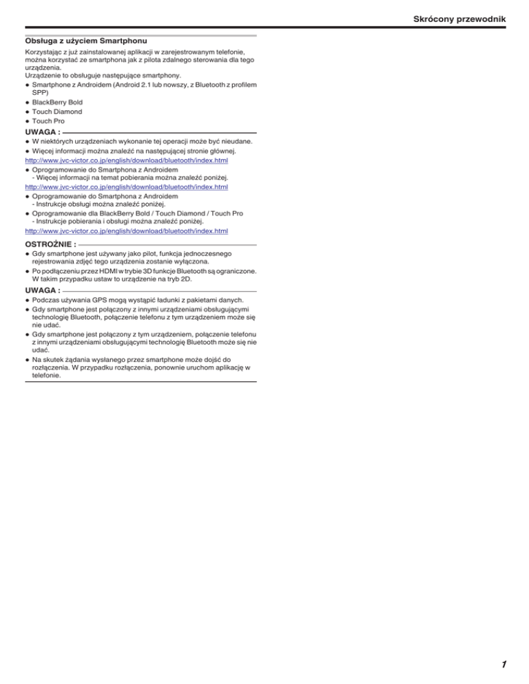 Skrócony przewodnik Obsługa z użyciem Smartphonu Korzystając z już zainstalowanej aplikacji w zarejestrowanym telefonie, można korzystać ze smartphona jak z pilota zdalnego sterowania dla tego urządzenia. Urządzenie to obsługuje następujące smartphony. 0 Smartphone z Androidem (Android 2.1 lub nowszy, z Bluetooth z profilem SPP) 0 BlackBerry Bold 0 Touch Diamond 0 Touch Pro UWAGA : W niektórych urządzeniach wykonanie tej operacji może być nieudane. Więcej informacji można znaleźć na następującej stronie głównej. http://www.jvc-victor.co.jp/english/download/bluetooth/index.html 0 Oprogramowanie do Smartphona z Androidem - Więcej informacji na temat pobierania można znaleźć poniżej. http://www.jvc-victor.co.jp/english/download/bluetooth/index.html 0 Oprogramowanie do Smartphona z Androidem - Instrukcje obsługi można znaleźć poniżej. 0 Oprogramowanie dla BlackBerry Bold / Touch Diamond / Touch Pro - Instrukcje pobierania i obsługi można znaleźć poniżej. http://www.jvc-victor.co.jp/english/download/bluetooth/index.html 0 0 OSTROŻNIE : 0 0 Gdy smartphone jest używany jako pilot, funkcja jednoczesnego rejestrowania zdjęć tego urządzenia zostanie wyłączona. Po podłączeniu przez HDMI w trybie 3D funkcje Bluetooth są ograniczone. W takim przypadku ustaw to urządzenie na tryb 2D. UWAGA : 0 0 0 0 Podczas używania GPS mogą wystąpić ładunki z pakietami danych. Gdy smartphone jest połączony z innymi urządzeniami obsługującymi technologię Bluetooth, połączenie telefonu z tym urządzeniem może się nie udać. Gdy smartphone jest połączony z tym urządzeniem, połączenie telefonu z innymi urządzeniami obsługującymi technologię Bluetooth może się nie udać. Na skutek żądania wysłanego przez smartphone może dojść do rozłączenia. W przypadku rozłączenia, ponownie uruchom aplikację w telefonie. 1