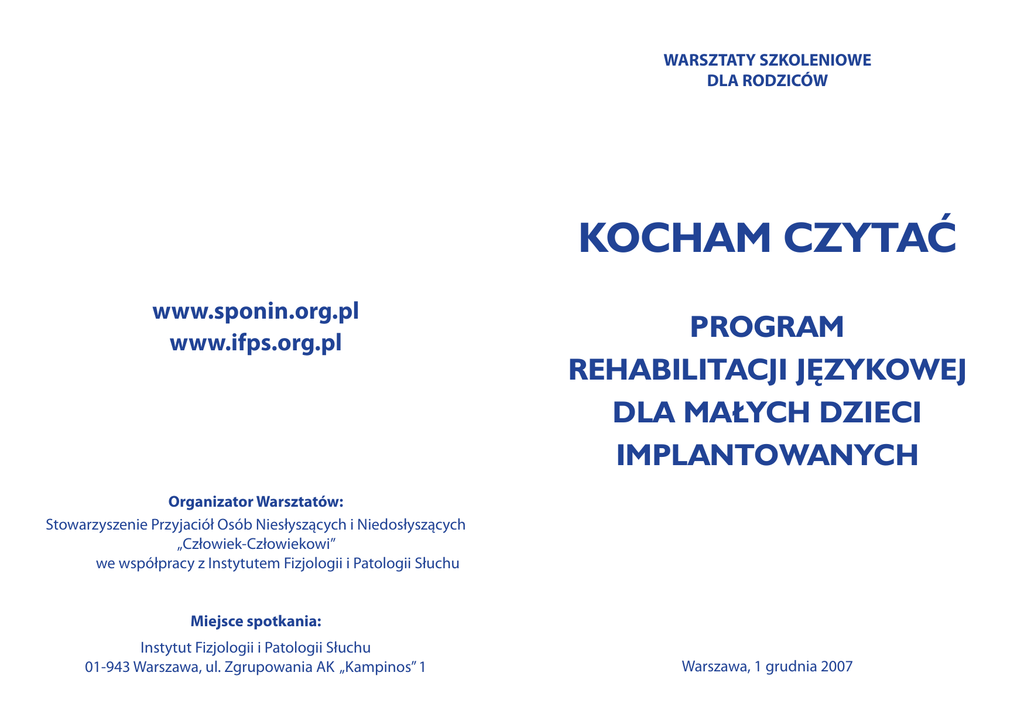 WARSZTATY SZKOLENIOWE DLA RODZICÓW KOCHAM CZYTAĆ www.sponin.org.pl www.ifps.org.pl PROGRAM REHABILITACJI JĘZYKOWEJ DLA MAŁYCH DZIECI IMPLANTOWANYCH Organizator Warsztatów: Stowarzyszenie Przyjaciół Osób Niesłyszących i Niedosłyszących „Człowiek-Człowiekowi” we współpracy z Instytutem Fizjologii i Patologii Słuchu Miejsce spotkania: Instytut Fizjologii i Patologii Słuchu 01-943 Warszawa, ul. Zgrupowania AK „Kampinos” 1 Warszawa, 1 grudnia 2007 PROGRAM WARSZTATÓW 10.30 – 10.45 Słowo wstępne do uczestników Warsztatów dr med. Joanna Szuchnik Instytut Fizjologii i Patologii Słuchu 10.45 – 14.00 prof. dr hab. Jagoda Cieszyńska Akademia Pedagogiczna w Krakowie – Mózgowa organizacja funkcji językowych – Etapy nauki czytania metodą sylabową z zastosowaniem programu autorskiego Kocham czytać – Zastosowanie wczesnej nauki czytania w pracy nad kształtowaniem systemu językowego dzieci z zaburzonym słuchem – kształtowanie kompetencji językowej – Minimalizacja systemu gramatycznego języka polskiego – kształtowanie kompetencji komunikacyjnej – Ćwiczenia kompetencji kulturowej (percepcji wzrokowej, percepcji słuchowej, procesów kategoryzacji, pamięci symultanicznej i sekwencyjnej Podczas zajęć zostaną pokazane nagrania zajęć z dziećmi oraz pomoce dydaktyczne i podręcznik dla rodziców 14.00 – 14.45 Przerwa obiadowa 14.45 – 16.00 Dyskusja