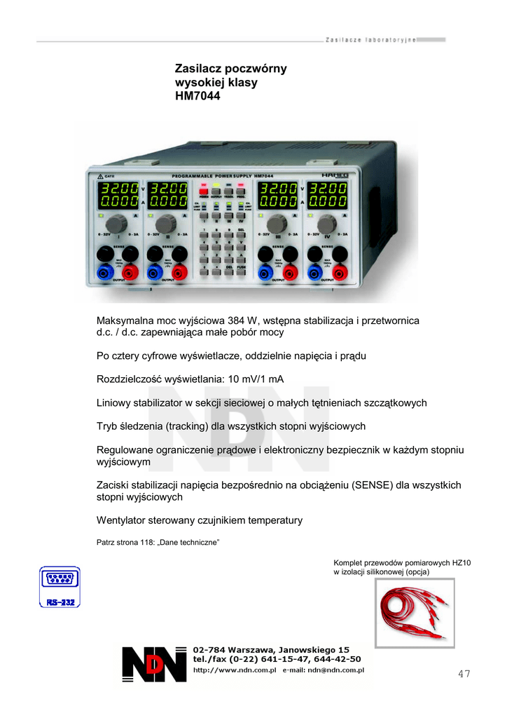 Zasilacz poczwórny wysokiej klasy HM7044 Zasilacze: 4 x 0 - 32 V/0 – 3 A Maksymalna moc wyjściowa 384 W, wstępna stabilizacja i przetwornica d.c. / d.c. zapewniająca małe pobór mocy Po cztery cyfrowe wyświetlacze, oddzielnie napięcia i prądu Rozdzielczość wyświetlania: 10 mV/1 mA Liniowy stabilizator w sekcji sieciowej o małych tętnieniach szczątkowych Tryb śledzenia (tracking) dla wszystkich stopni wyjściowych Regulowane ograniczenie prądowe i elektroniczny bezpiecznik w każdym stopniu wyjściowym Zaciski stabilizacji napięcia bezpośrednio na obciążeniu (SENSE) dla wszystkich stopni wyjściowych Wentylator sterowany czujnikiem temperatury Patrz strona 118: „Dane techniczne” Komplet przewodów pomiarowych HZ10 w izolacji silikonowej (opcja) 47 HM7042-5 Zasilacz laboratoryjny potrójny Opis produktu: strona 46 Wyjścia 2 x 0 - 32 V i 0 … 5,5 V: Kanał I + III (32 V) Zakres regulacji napięcia: przyciski włączania i wyłączania zasilacza, przetwornica impulsowa poprzedzająca stabilizator liniowy, wyjścia pływające do pracy równoległej i szeregowej, ogranicznik prądowy i bezpiecznik elektroniczny. 2 x 0 - 32 V, regulacja ciągła dwoma pokrętłami (zgrubna, dokładna) ≤ 100 µVskut. [3 Hz - 300 kHz] maks. 2 A 0 - 2 A, regulacja ciągła (pokrętłem) Tętnienia napięcia: Prąd wyjściowy: Ogranicznik prądowy, elektroniczny bezpiecznik: Czas powrotu [po zmianie obciążenia 10% -90%]: 80 µs w zakresie ±1 mV wartości znamionowej 30 µs w zakresie ±10 mV wartości znamionowej 00 µs w zakresie ±100 mV wartości znamionowej Maks. odchylenie spowodowane przepięciami przejściowymi: typowo 17 mV Czas powrotu [obciążenia bazowe 50%, zmiana obciążenia 10%]: 30 µs w zakresie ±1 mV wartości znamionowej 0,5 µs w zakresie ±10 mV wartości znamionowej 00 µs w zakresie ±100 mV wartości znamionowej maks. odchylenie spowodowane przepięciami przejściowymi: typowo 17 mV Wyświetlacz: Wskaźnik 7-segmentowy LED: 32,00 V [4 cyfry] / 2,000 A [4 cyfry] Rozdzielczość: 0,01 V / 1 mA Dokładność wyświetlania: ±3 cyfry - napięcie / ±4 cyfry - prąd Dioda LED: sygnalizuje ograniczenie prądowe Kanał II (5,5 V) Zakres regulacji napięcia: 0 - 5,5 V regulacja ciągła pokrętłem Tętnienia napięcia: ≤ 100 µVskut. [3 Hz - 300 kHz] Prąd wyjściowy: maks. 5 A Ogranicznik prądowy, 0 - 5 A, regulacja ciągła pokrętłem elektroniczny bezpiecznik: Czas powrotu [po zmianie obciążenia 10% -90%]: 80 µs w zakresie ±1 mV wartości znamionowej 10 µs w zakresie ±10 mV wartości znamionowej typowo 170 mV Maks. odchylenie spowodowane przepięciami przejściowymi: Czas powrotu [obciążenia bazowe 50%, zmiana obciążenia 10%]: 30 µs w zakresie ±1 mV wartości znamionowej 15 µs w zakresie ±10 mV wartości znamionowej 00 µs w zakresie ±100 mV wartości znamionowej Maks. odchylenie spowodowane przepięciami przejściowymi: typowo 60 mV Wyświetlacz: Wskaźnik 7-segmentowy LED: 5,50 V [3 cyfry] / 5,00 A [3 cyfry] Rozdzielczość: 0,01 V/10 mA Dokładność wyświetlania: ±3 cyfry - napięcie / ±1 cyfra - prąd Dioda LED: sygnalizuje aktywne ograniczenie prądowe Maksymalne wartości znamionowe Maksymalne dopuszczalne napięcie doprowadzane do wyjść (wł. / wył.): Napięcie o odwróconej polaryzacji: maks. 0,4 V Prąd w przeciwnym kierunku: maks. 5 A Napięcie względem ziemi: maks. 150 V Dane dodatkowe Klasa ochronności: Zasilanie sieciowe: Bezpiecznik sieciowy: I zgodnie z EN61010-1 115 V / 230 V ±10%, 50 / 60 Hz 115 V: 2 x 5 A, szybki, 5 x 20 mm 230 V: 2 x 2,5 A, szybki, 5 x 20 mm Pobór mocy: maks. 330 VA / 250 W Zakres temperatur pracy: od 0°C do +40°C Zakres temperatur składowania: od -20°C do +70°C Maks. wilgotność względna: < 80% [bez kondensacji] Wymiary (dł. x szer. wys.) 285 x 90 x 389 mm Masa: ok. 7,4 kg Wartości wyżej podane a nie zawierające tolerancji są wartościami jedynie orientacyjnymi i odzwierciedlają parametry "średniego" wyrobu. Temperatura odniesienia: 23°C ±2°C. Producent zastrzega sobie prawo do wprowadzania zmian bez powiadomienia. Akcesoria standardowe: przewód sieciowy i instrukcja obsługi. Akcesoria dodatkowe: przewody pomiarowe HZ10, zestaw do montażu w regale modułu 19 cali HZ42. HM7044 Wysokiej klasy zasilacz laboratoryjny poczwórny Opis produktu: strona 47 Dane techniczne identyczne dla wyjść: I, II, III i IV Źródło stałonapięciowe Zakres ustawania napięcia: 0-32 V d.c. Rozdzielczość: 10 mV, długość wyświetlacza: 4 cyfry Dokładność ustawiania: ±5 cyfr Tętnienia i szumy: < 1 mVskut. - stabilizacja napięcia Ustawienie prądu: 5 mA - 3 A Rozdzielczość: 1 mA, długość wyświetlacza: 4 cyfry Dokładność ustawiania: ±8 cyfr Tętnienia i szumy: < 1 mVskut. /100 µA - stabilizacja prądu Praca w połączeniu równoległym Napięcie wyjściowe: 32 V maks. 12 A maks. przy pracujących czterech wyjściach Prąd wyjściowy: Moc wyjściowa: 384 W maks. Praca w połączeniu szeregowym 128 V maks. przy pracujących czterech wyjściach Napięcie wyjściowe: Prąd wyjściowy: 3 A maks Moc wyjściowa: 384 W maks. Tryb śledzenia (tracking) Śledzenie napięcia przy pracujących maksymalnie czterech wyjściach Bezpiecznik elektroniczny Ustawianie prądu: 5 mA - 3 A; wybór bezpiecznika dla każdego wyjścia Liczba bezpieczników: 4 Programowanie wyłączenia wyjścia Programowanie wartości granicznej prądu dla jednego wyjścia, możliwość odłączenia przyciskiem od obciążenia maksymalnie czterech wyjść. Wyświetlacz ze wskaźnikami siedmiosegmentowymi Osiem wyświetlaczy długości 4 cyfry - wyświetlanie napięcia i prądu Wskaźniki typu LED Sygnalizacja: włączenia wyjścia, włączenia ograniczenia prądowego, włączenia bezpiecznika elektronicznego (po 3 diody LED na wyjście) Interfejs Szeregowy interfejs do połączenia z komputerem PC Czas przetwarzania rozkazu: 100 ms aż do momentu gdy napięcie osiągnie poziom cyfrowy transmisji Informacje ogólne Rezy