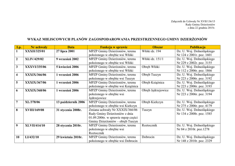 Załącznik do Uchwały Nr XVII/136/15 Rady Gminy Dzierżoniów z dnia 22 grudnia 2015r. WYKAZ MIEJSCOWYCH PLANÓW ZAGOSPODAROWANIA PRZESTRZENNEGO GMINY DZIERŻONIÓW Lp. 1 Nr uchwały XXXII/325/01 Data 27 lipca 2001 2 XLIV/429/02 9 wrzesień 2002 3 XXXVI/335/06 5 kwiecień 2006 4 XXXIX/366/06 1 wrzesień 2006 5 XXXIX/367/06 1 wrzesień 2006 6 XXXIX/368/06 1 wrzesień 2006 7 XL/378/06 13 październik 2006 8 XVIII/169/08 31 stycznia 2008r. 9 XLVII/414/10 28 stycznia 2010r. 10 LI/432/10 29 kwietnia 2010r. Funkcja w sprawie MPZP Gminy Dzierżoniów, terenu położonego w obrębie wsi Włóki MPZP Gminy Dzierżoniów, terenu położonego w obrębie wsi Włóki MPZP Gminy Dzierżoniów, terenu położonego w obrębie wsi Włóki MPZP Gminy Dzierżoniów, terenu położonego w obrębie wsi Tuszyn MPZP Gminy Dzierżoniów, terenu położonego w obrębie wsi Książnica MPZP Gminy Dzierżoniów, terenu położonego w obrębie wsi Jędrzejowice MPZP Gminy Dzierżoniów, terenu położonego w obrębie wsi Kiełczyn Zmiana uchwały Nr XXXIX/366/06 Rady Gminy Dzierżoniów z dnia 01.09.2006r. w sprawie mpzp części Gminy Dzierżoniów – obręb Tuszyn MPZP Gminy Dzierżoniów, terenu położonego w obrębie wsi Roztocznik MPZP Gminy Dzierżoniów, terenu położonego w obrębie wsi Dobrocin Obszar Włóki dz. 194 Włóki dz. 151/1 Obręb Włóki Obręb Tuszyn Obręb Książnica Obręb Jędrzejowice Obręb Kiełczyn Tuszyn Publikacja Dz. U. Woj. Dolnośląskiego Nr 124 z 2001r. poz. 1601 Dz. U. Woj. Dolnośląskiego Nr 229 z 2002r. poz. 3155 Dz. U. Woj. Dolnośląskiego Nr 112 z 2006r. poz. 1866 Dz. U. Woj. Dolnośląskiego Nr 223 z 2006r. poz. 3192 Dz. U. Woj. Dolnośląskiego Nr 223 z 2006r. poz. 3193 Dz. U. Woj. Dolnośląskiego Nr 223 z 2006r. poz. 3194 Dz. U. Woj. Dolnośląskiego Nr 275 z 2006r. poz. 4179 Dz. U. Woj. Dolnośląskiego Nr 134 z 2008r. poz. 1585 Roztocznik Dz. U. Woj. Dolnośląskiego Nr 84 z 2010r. poz.1278 Dobrocin Dz. U. Woj. Dolnośląskiego Nr 148 z 2010r. poz. 2329 Lp. 11 Nr uchwały III/17/10 Data 21 grudnia 2010r. 12 III/18/10 21 grudnia 2010r. 13 VIII/51/11 31 marca 2011r. 14 XVII/117/11 24 listopada 2011r. 15 XXI/148/12 29 marca 2012r. 16 XXXIX/289/13 27 czerwca 2013r. 17 XVI/122/15 26 listopada 2015r. 18 XVI/123/15 26 listopada 2015r. Funkcja w sprawie MPZP Gminy Dzierżoniów, terenu położonego w obrębie wsi Nowizna MPZP Gminy Dzierżoniów, terenu położonego w obrębie wsi Mościsko MPZP Gminy Dzierżoniów, terenu położonego w obrębie wsi Uciechów Zmiana uchwały Nr XXXIX/366/06 Rady Gminy Dzierżoniów z dnia 01.09.2006r. w sprawie mpzp części Gminy Dzierżoniów – obręb Tuszyn MPZP w sprawie uchwalenia zmiany miejscowego planu zagospodarowania przestrzennego wsi Nowizna MPZP w sprawie uchwalenia miejscowego planu zagospodarowania przestrzennego wsi Piława Dolna MPZP w sprawie uchwalenia miejscowego planu zagospodarowania przestrzennego MPZP OWIESNO MPZP w sprawie uchwalenia miejscowego planu zagospodarowania przestrzennego MPZP OSTROSZOWICE Obszar Nowizna Mościsko Uciechów Tuszyn Publikacja Dz. U. Woj. Dolnośląskiego Nr 53 z 2011r. poz. 699 Dz. U. Woj. Dolnośląskiego Nr 53 z 2011r. poz. 700 Dz. U. Woj. Dolnośląskiego Nr 191 z 2011r. poz. 3304 Dz. U. Woj. Dolnośląskiego Poz. 103 z dnia 13.01.2012r. Nowizna Dz. U. Woj. Dolnośląskiego Poz. 1749 z dnia 11.05.2012r. Piława Dolna Dz. U. Woj. Dolnośląskiego Poz. 4337 z dnia 15.07.2013r. Owiesno Dz. U. Woj. Dolnośląskiego Poz. Ostroszowice Dz. U. Woj. Dolnośląskiego Poz.