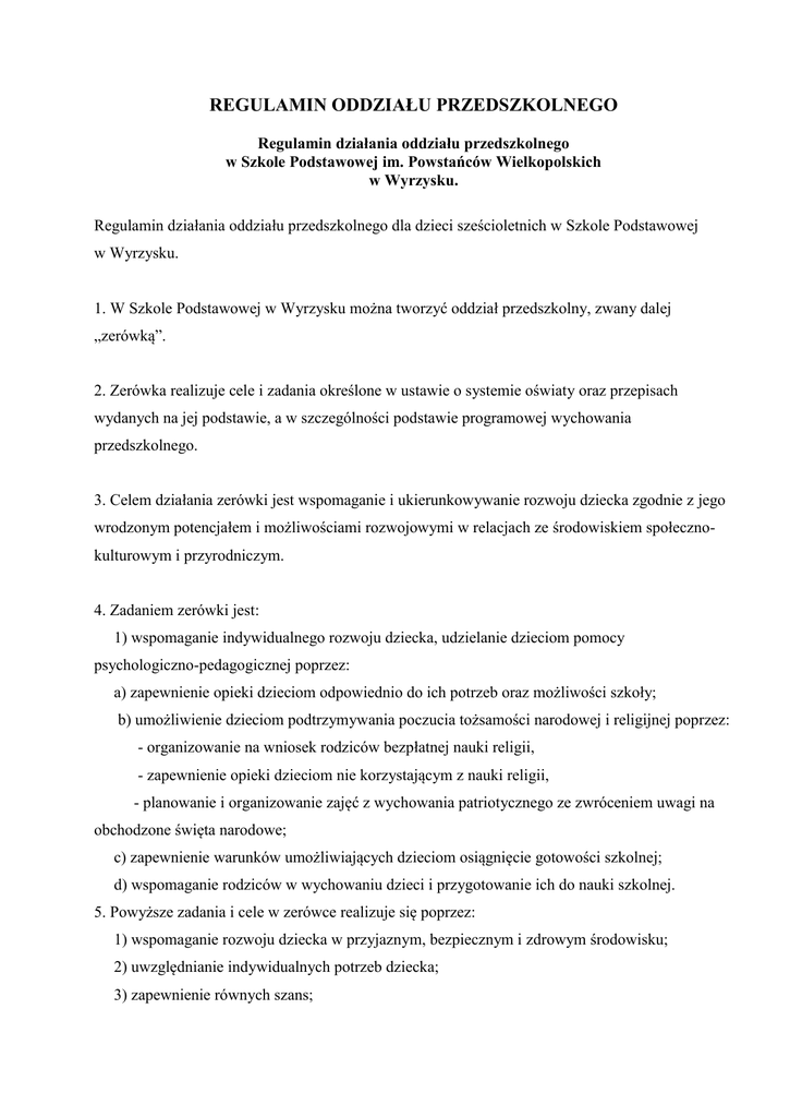 REGULAMIN ODDZIAŁU PRZEDSZKOLNEGO Regulamin działania oddziału przedszkolnego w Szkole Podstawowej im. Powstańców Wielkopolskich w Wyrzysku. Regulamin działania oddziału przedszkolnego dla dzieci sześcioletnich w Szkole Podstawowej w Wyrzysku. 1. W Szkole Podstawowej w Wyrzysku można tworzyć oddział przedszkolny, zwany dalej „zerówką”. 2. Zerówka realizuje cele i zadania określone w ustawie o systemie oświaty oraz przepisach wydanych na jej podstawie, a w szczególności podstawie programowej wychowania przedszkolnego. 3. Celem działania zerówki jest wspomaganie i ukierunkowywanie rozwoju dziecka zgodnie z jego wrodzonym potencjałem i możliwościami rozwojowymi w relacjach ze środowiskiem społecznokulturowym i przyrodniczym. 4. Zadaniem zerówki jest: 1) wspomaganie indywidualnego rozwoju dziecka, udzielanie dzieciom pomocy psychologiczno-pedagogicznej poprzez: a) zapewnienie opieki dzieciom odpowiednio do ich potrzeb oraz możliwości szkoły; b) umożliwienie dzieciom podtrzymywania poczucia tożsamości narodowej i religijnej poprzez: - organizowanie na wniosek rodziców bezpłatnej nauki religii, - zapewnienie opieki dzieciom nie korzystającym z nauki religii, - planowanie i organizowanie zajęć z wychowania patriotycznego ze zwróceniem uwagi na obchodzone święta narodowe; c) zapewnienie warunków umożliwiających dzieciom osiągnięcie gotowości szkolnej; d) wspomaganie rodziców w wychowaniu dzieci i przygotowanie ich do nauki szkolnej. 5. Powyższe zadania i cele w zerówce realizuje się poprzez: 1) wspomaganie rozwoju dziecka w przyjaznym, bezpiecznym i zdrowym środowisku; 2) uwzględnianie indywidualnych potrzeb dziecka; 3) zapewnienie równych szans; 4) umacnianie wiary we własne siły i możliwości osiągania sukcesu; 5) motywowanie do osiągania celów 6) stwarzanie warunków do rozwijania samodzielności i podejmowania odpowiedzialności za siebie i za najbliższe otoczenie; 7) rozwijanie wrażliwości moralnej a) dostrzeganie dobra, prawdy i piękna w swoim postępowaniu i postępowaniu innych, b) traktowanie swoich potrzeb na równi z potrzebami innych, c) wyrażanie własnych myśli i przeżyć; 8) kształtowanie umiejętności obserwowania zjawisk zachodzących w środowisku przyrodniczym, społecznym, kulturowym i technicznym; 9) rozbudzanie ciekawości poznawczej; 10) zachęcanie do aktywności badawczej; 11) rozwijanie wrażliwości estetycznej (plastycznej, muzycznej i ruchowej); 12) tworzenie warunków do rozwoju wyobraźni. 6. W zerówce sprawuje się opiekę nad dziećmi, dostosowując metody i sposoby oddziaływań do wieku dziecka i jego możliwości rozwojowych, potrzeb środowiskowych z uwzględnieniem istniejących warunków lokalowych. W szczególności: 1) dzieci są odbierane od rodziców (prawnych opiekunów) lub od osób upoważnionych przez nauczyciela i pracownika obsługi, a następnie przeprowadzane do sali, w której odbywają się zajęcia 2) przez cały czas pobytu w szkole dzieci znajdują się pod opieką nauczyciela odpowiedzialnego za nie 3) dzieci mogą korzystać ze świetlicy szkolnej po zakończeniu zajęć. Na świetlicę dzieci odprowadzane są przez nauczyciela, 4) dzieci odbierane są przez rodziców (prawnych opiekunów) lub osoby upoważnione, 7. Przyprowadzanie i odbierania dzieci z zerówki może odbywać się na poniższych zasadach: 1) dziecko może być przyprowadzane do zerówki i odbierane z niej tylko przez osobę mogącą zapewnić pełne bezpieczeństwo (osoba pełnoletnia, sprawna fizycznie), 2) rodzice mogą upoważnić na piśmie, do przyprowadzania i odbierania dziecka z zerówki osobę, która jest w stanie zapewnić dziecku pełne bezpieczeństwo, 3) rodzice lub osoby upoważnione przyprowadzają dziecko lub odbierają bezpośrednio w obecności nauczyciela odpowiedzialnego za dziecko, 4) osoba odbierająca dziecko nie może być pod wpływem alkoholu. W innym przypadku nauczyciel powiadamia o tym fakcie drugiego rodzica, by ten odebrał dziecko 5) nauczyciel nie może wydać dziecka osobie trzeciej na telefoniczną prośbę rodziców. Wymagana jest pisemna zgoda złożona osobiście przez rodziców (prawnych opiekunów) u dyrektora szkoły lub nauczyciela odpowiedzialnego za dziecko, 6) rodzice (prawni opiekunowie) przyjmują odpowiedzialność prawną za bezpieczeństwo dziecka odebranego z zerówki przez upoważnioną przez nich osobę, 7) o godzinach przyprowadzania i odbierania dzieci rodzice są informowani na początku roku szkolnego. Godziny te określa ramowy rozkład dnia pracy zerówki, 8) rodzice zobowiązani są przestrzegać godzin przyprowadzania i odbierania dzieci 9) w czasie zajęć poza szkołą( spacery, wycieczki, wyjazdy na konkursy i tym podobne) dzieci znajdują się pod opieką nauczyciela. 8. W uzasadnionych przypadkach (oboje rodziców pracują) dziecko może korzystać z opieki w świetlicy szkolnej. 9. Liczba dzieci w oddziale zerowym nie może przekraczać 25. 10. Praca wychowawczo-dydaktyczna i opiekuńcza prowadzona jest na podstawie programów wychowania przedszkolnego. 11. Organizację pracy zerówki określa ramowy rozkład dnia ustalony przez dyrektora szkoły na wniosek Rady Pedagogicznej, z uwzględnieniem zasad ochrony zdrowia i higieny oraz oczekiwań rodziców (prawnych opiekunów). 12. Na podstawie ramowego rozkładu dnia nauczyciel, któremu powierzono opiekę nad danym oddziałem ustala dla tego oddziału szczegółowy rozkład dnia z uwzględnieniem potrzeb i zainteresowań dzieci. 13. Ramowy rozkład dnia określa godziny, między innymi: 1) schodzenia się i rozchodzenia dzieci, 2) posiłków, 3) zajęć, spacerów i zajęć dodatkowych. 14. Ramowy rozkład dnia może być modyfikowany w zależności od pory roku i potrzeb rodziców. 15. Zerówka czynna jest 5 godzin, w dni robocze, od poniedziałku do piątku. Czas przeznaczony na realizację podstawy programowej wychowania przedszkolnego w oddziale zerowym nie może być krótszy ni