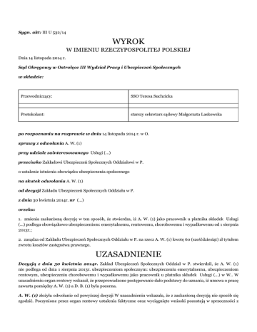 Sygn. akt: III U 532/14 WYROK W IMIENIU RZECZYPOSPOLITEJ POLSKIEJ Dnia 14 listopada 2014 r. Sąd Okręgowy w Ostrołęce III Wydział Pracy i Ubezpieczeń Społecznych w składzie: Przewodniczący: SSO Teresa Suchcicka Protokolant: starszy sekretarz sądowy Małgorzata Laskowska po rozpoznaniu na rozprawie w dniu 14 listopada 2014 r. w O. sprawy z odwołania A. W. (1) przy udziale zainteresowanego Usługi (...) przeciwko Zakładowi Ubezpieczeń Społecznych Oddziałowi w P. o ustalenie istnienia obowiązku ubezpieczenia społecznego na skutek odwołania A. W. (1) od decyzji Zakładu Ubezpieczeń Społecznych Oddziału w P. z dnia 30 kwietnia 2014r. nr (...) orzeka: 1. zmienia zaskarżoną decyzję w ten sposób, że stwierdza, iż A. W. (1) jako pracownik u płatnika składek Usługi (...) podlega obowiązkowo ubezpieczeniom: emerytalnemu, rentowemu, chorobowemu i wypadkowemu od 1 sierpnia 2013r.; 2. zasądza od Zakładu Ubezpieczeń Społecznych Oddziału w P. na rzecz A. W. (1) kwotę 60 (sześćdziesiąt) zł tytułem zwrotu kosztów zastępstwa prawnego. UZASADNIENIE Decyzją z dnia 30 kwietnia 2014r. Zakład Ubezpieczeń Społecznych Oddział w P. stwierdził, że A. W. (1) nie podlega od dnia 1 sierpnia 2013r. ubezpieczeniom społecznym: ubezpieczeniu emerytalnemu, ubezpieczeniom rentowym, ubezpieczeniu chorobowemu i wypadkowemu jako pracownik u płatnika składek Usługi (...) w W.. W uzasadnieniu organ rentowy wskazał, że przeprowadzone postępowanie dało podstawy do uznania, iż umowa o pracę zawarta pomiędzy A. W. (1) a D. B. (1) była pozorna. A. W. (1) złożyła odwołanie od powyższej decyzji W uzasadnieniu wskazała, że z zaskarżoną decyzją nie sposób się zgodzić. Poczynione przez organ rentowy ustalenia faktyczne oraz wyciągnięte wnioski pozostają w sprzeczności z materiałem dowodowym zgromadzonym w postępowaniu, a nadto są sprzeczne z zasadami logicznego rozumowania, wiedzy oraz doświadczenia życiowego. W odpowiedzi na odwołanie organ rentowy wniósł o oddalenie odwołania w całości wskazując, że zawarta umowa o pracę pomiędzy A. W. (1) a D. B. (1) miała charakter czynności pozornych. Jej celem nie było faktyczne zatrudnienie i świadczenie pracy lecz uzyskanie świadczeń z ubezpieczenia społecznego i jako taka nie rodzi skutków prawnych zgodnie z art.58 § 1 Kodeksu cywilnego. Postanowieniem z dnia 17 czerwca 2014r. Sąd wezwał do udziału w sprawie w charakterze zainteresowanego D. B. (1) prowadzącego działalność gospodarczą pod nazwą Usługi (...). Sąd ustalił i zważył, co następuje: Zaskarżoną decyzją z dnia 30.04.2014r. Oddział ZUS w P. Inspektorat w O. stwierdził, że odwołująca A. W. (1) jako pracownik u płatnika składek Usługi (...) nie podlega obowiązkowo ubezpieczeniom: emerytalnemu, rentowym, chorobowemu i wypadkowemu od dnia 1 sierpnia 2013r. Decyzja ZUS była poprzedzona następującymi ustaleniami organu rentowego: z dniem 08.10.2013r. odwołująca stała się niezdolna do pracy i wystąpiła z wnioskiem o wypłatę zasiłku chorobowego. W celu ustalenia prawidłowości zgłoszenia do ubezpieczeń społecznych, Oddział ZUS przeprowadził postępowanie kontrolne. W trakcie przesłuchania płatnik składek D. B. (1) podał, że postanowił zatrudnić pracownika ze względu na problemy rodzinne i zdrowotne księgowej K. B. (1) zatrudnionej w wymiarze ¼ etatu, która nosiła się z zamiarem zakończenia pracy z końcem 2013r. Z polecenia byłej pracownicy A. W. (2) do płatnika zgłosiła się w sprawie zatrudnienia odwołująca A. W. (1). Według zeznań D. B. (1) do podpisania umowy o pracę przez strony doszło w dniu 01.08.2013r. w miejscu zamieszkania księgowej K. B. (1) na ulicy (...) w W., która była obecna przy podpisywaniu umowy. Umowa o pracę została zawarta na czas określony od 01.08.2013r. do 31.08.2014r. na stanowisku księgowej, w wymiarze pełnego etatu z wynagrodzeniem 2500,00 zł. Zdaniem organu rentowego odwołująca A. W. (1) nie posiadała odpowiednich kwalifikacji do pracy na stanowisku księgowej zgodnie z zawartą umową o pracę. Nie pracowała nigdy na stanowisku księgowej i kadrowej, posiadała doświadczenie zawodowe jako sprzedawca. Zdaniem ZUS A. W. (1) nie świadczyła pracy na rzecz D. B. (1) zgodnie z umową o pracę, która była zawarta na stanowisko księgowej w pełnym wymiarze czasu pracy, tj. 8 godzin. Praca ta nie była świadczona w siedzibie firmy, lecz w prywatnym mieszkaniu księgowej K. B. (1) zatrudnionej jedynie na 1/4 etatu. Płatnik składek D. B. (1) bezpośrednio nie zlecał pracy A. W. (1), ani nie nadzorował jej w żaden sposób. Zatrudnienie A. W. (1) w pełnym wymiarze czasu pracy z wynagrodzeniem 2500,00 zł bez doświadczenia zawodowego, w sytuacji gdy księgowa jest zatrudniona na 1/4 etatu z niskim wynagrodzeniem budzi podejrzenie - w ocenie organu rentowego - do chęci korzystania z zasiłku chorobowego, a następnie macierzyńskiego od tej podstawy. D. B. (1) zatrudniając A. W. (1) będącą w ciąży był świadomy długotrwałej nieobecności w pracy z powodu korzystania ze świadczeń z ubezpieczenia chorobowego, a co za tym idzie, że nie będzie mogła zastąpić K. B. (1) na stanowisku księgowej w przypadku, gdyby rzeczywiście postanowiła ona odejść z pracy z końcem 2013r. Ponadto z protokołu pokontrolnego jednoznacznie wynika, ze A. W. (1) nie świadczyła pracy na stanowisku księgowej na rzecz D. B. (1), a jedynie przyuczała się do wykonywania pracy na stanowisku księgowej. W związku z powyższym Oddział ZUS uznał, że zawarta umowa o pracę pomiędzy A. W. (1) a D. B. (1) miała charakter czynności pozornych. Jej celem nie było faktyczne zatrudnienie i świadczenie pracy lecz uzyskanie świadczeń z ubezpieczenia społecznego i jako taka nie rodzi skutków prawnych zgodnie z art.58 § 1 Kodeksu cywilnego. W związku z powyższym, Oddział ZUS w dniu 30.04.2014r. wydał przedmiotową decyzję, w której stwier