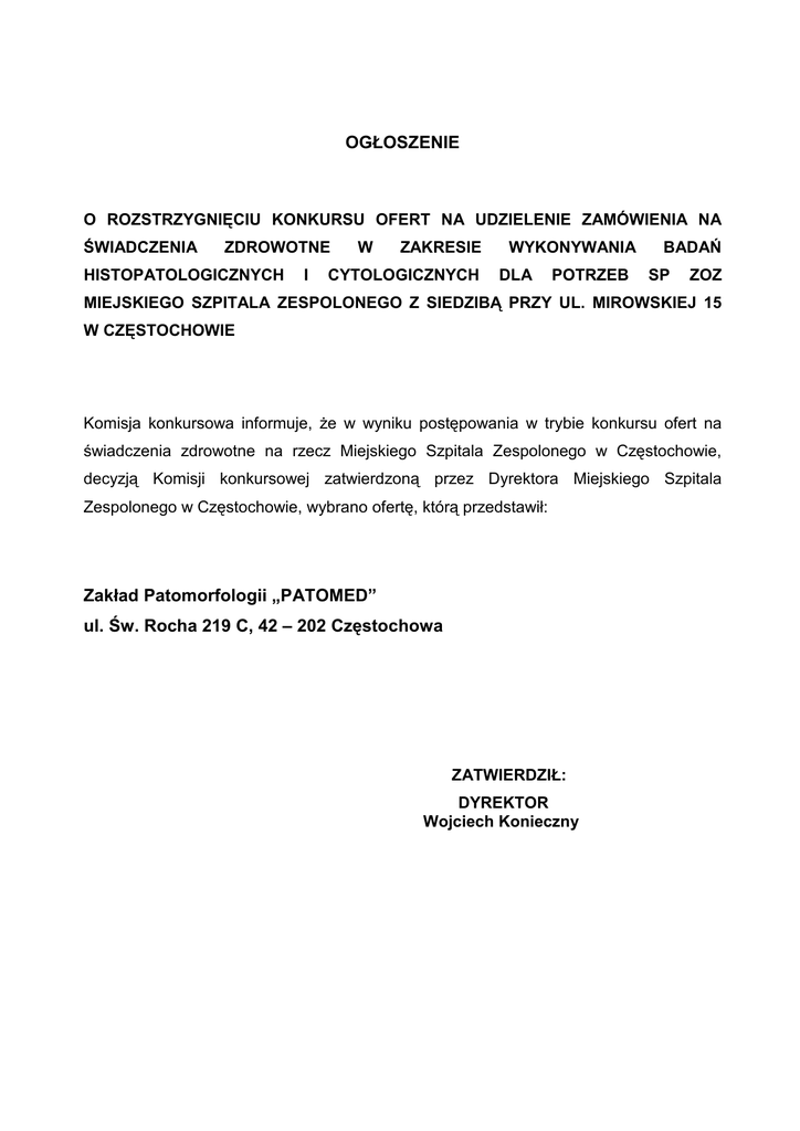 OGŁOSZENIE O ROZSTRZYGNIĘCIU KONKURSU OFERT NA UDZIELENIE ZAMÓWIENIA NA ŚWIADCZENIA ZDROWOTNE HISTOPATOLOGICZNYCH I W ZAKRESIE CYTOLOGICZNYCH WYKONYWANIA DLA POTRZEB BADAŃ SP ZOZ MIEJSKIEGO SZPITALA ZESPOLONEGO Z SIEDZIBĄ PRZY UL. MIROWSKIEJ 15 W CZĘSTOCHOWIE Komisja konkursowa informuje, że w wyniku postępowania w trybie konkursu ofert na świadczenia zdrowotne na rzecz Miejskiego Szpitala Zespolonego w Częstochowie, decyzją Komisji konkursowej zatwierdzoną przez Dyrektora Miejskiego Szpitala Zespolonego w Częstochowie, wybrano ofertę, którą przedstawił: Zakład Patomorfologii „PATOMED” ul. Św. Rocha 219 C, 42 – 202 Częstochowa ZATWIERDZIŁ: DYREKTOR Wojciech Konieczny
