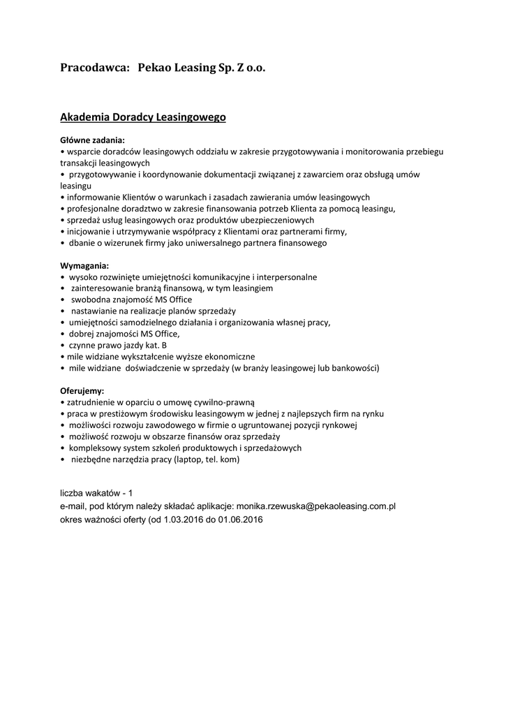 Pracodawca: Pekao Leasing Sp. Z o.o. Akademia Doradcy Leasingowego Główne zadania: • wsparcie doradców leasingowych oddziału w zakresie przygotowywania i monitorowania przebiegu transakcji leasingowych • przygotowywanie i koordynowanie dokumentacji związanej z zawarciem oraz obsługą umów leasingu • informowanie Klientów o warunkach i zasadach zawierania umów leasingowych • profesjonalne doradztwo w zakresie finansowania potrzeb Klienta za pomocą leasingu, • sprzedaż usług leasingowych oraz produktów ubezpieczeniowych • inicjowanie i utrzymywanie współpracy z Klientami oraz partnerami firmy, • dbanie o wizerunek firmy jako uniwersalnego partnera finansowego Wymagania: • wysoko rozwinięte umiejętności komunikacyjne i interpersonalne • zainteresowanie branżą finansową, w tym leasingiem • swobodna znajomość MS Office • nastawianie na realizacje planów sprzedaży • umiejętności samodzielnego działania i organizowania własnej pracy, • dobrej znajomości MS Office, • czynne prawo jazdy kat. B • mile widziane wykształcenie wyższe ekonomiczne • mile widziane doświadczenie w sprzedaży (w branży leasingowej lub bankowości) Oferujemy: • zatrudnienie w oparciu o umowę cywilno-prawną • praca w prestiżowym środowisku leasingowym w jednej z najlepszych firm na rynku • możliwości rozwoju zawodowego w firmie o ugruntowanej pozycji rynkowej • możliwość rozwoju w obszarze finansów oraz sprzedaży • kompleksowy system szkoleń produktowych i sprzedażowych • niezbędne narzędzia pracy (laptop, tel. kom) liczba wakatów - 1 e-mail, pod którym należy składać aplikacje: [email protected] okres ważności oferty (od 1.03.2016 do 01.06.2016