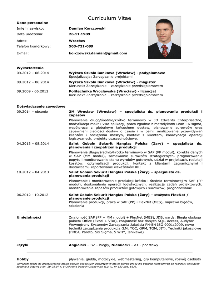 Curriculum Vitae Dane personalne Imię i nazwisko: Damian Korczowski Data urodzenia: 26.11.1989 Adres: Wrocław Telefon komórkowy: 503-721-089 E-mail: [email protected] Wykształcenie 09.2012 – 06.2014 Wyższa Szkoła Bankowa (Wrocław) - podyplomowe Specjalizacja: Zarządzanie projektami 09.2012 – 06.2014 Wyższa Szkoła Bankowa (Wrocław) - magister Kierunek: Zarządzanie – zarządzanie przedsiębiorstwem 09.2009 - 06.2012 Politechnika Wrocławska (Wrocław) - licencjat Kierunek: Zarządzanie – zarządzanie przedsiębiorstwem Doświadczenie zawodowe 09.2014 – obcenie 3M Wrocław (Wrocław) – specjalista ds. planowania produkcji i zapasów Planowanie długo/średnio/krótko terminowo w JD Edwards EnterpriseOne, modyfikacja makr i VBA aplikacji, praca zgodnie z metodykami Lean i 6-sigma, współpraca z globalnym łańcuchem dostaw, planowanie surowców oraz zapewnieni ciągłości dostaw o czasie i w pełni, analizowanie przewidywań klientów i obciążenia maszyn, kontakt z klientem, koordynacja operacji logistycznych, projekty oszczędnościowe, 04.2013 – 08.2014 Saint Gobain Sekurit Hanglas Polska planowania i zaopatrzenia produkcji (Żary) – specjalista ds. Planowanie długo/średnio/krótko terminowo w SAP (PP moduł), korekta danych w SAP (MM moduł), zamawianie surowców strategicznych, prognozowanie popytu i monitorowanie stanu wyrobów gotowych, udział w projektach, redukcji kosztów, optymalizacji produkcji, kontakt z klientami zagranicznymi i dostawcami, raportowanie wskaźników KPI 10.2012 – 04.2013 Saint Gobain Sekurit Hanglas Polska (Żary) – specjalista ds. planowania produkcji Planowanie i monitorowanie produkcji krótko i średnio terminowej w SAP (PP moduł), doskonalenie operacji logistycznych, realizacja zadań projektowych, monitorowanie zapasów produktów gotowych i surowców, prognozowanie 06.2012 - 10.2012 Saint Gobain Sekurit Hanglas Polska (Żary) – stażysta FlexNet / planowanie produkcji Planowanie produkcji, praca w SAP (PP) i FlexNet (MES), naprawa błędów, szkolenia Umiejętności Znajomość SAP (PP + MM moduł) + FlexNet (MES), JDEdwards, Biegła obsługa pakietu Office (Excel + VBA), znajomość baz danych SQL, Access, Audytor Wewnętrzny Systemów Zarządzania Jakością PN-EN ISO 9001:2009, nowe techniki zarządzania produkcją (LM, TOC, QRM, TQM, JIT), Techniki jakościowe (FMEA, Pareto, Six Sigma, 5 WHY, Ishikawa) Języki Angielski – B2 – biegły, Niemiecki – A1 - podstawy Hobby pływanie, giełda, motocykle, webmastering, gry komputerowe, rozwój osobisty Wyrażam zgodę na przetwarzanie moich danych osobowych zawartych w mojej ofercie pracy dla potrzeb niezbędnych do realizacji rekrutacji zgodnie z Ustawą z dn. 29.08.97 r. o Ochronie Danych Osobowych (Dz. U. nr 133 poz. 883).