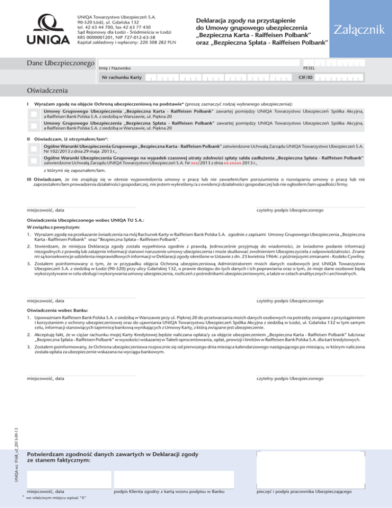 UNIQA Towarzystwo Ubezpieczeń S.A. 90-520 Łódź, ul. Gdańska 132 tel. 42 63 44 700, fax 42 63 77 430 Sąd Rejonowy dla Łodzi - Śródmieścia w Łodzi KRS 0000001201, NIP 727-012-63-58 Kapitał zakładowy i wpłacony: 220 308 282 PLN Dane Ubezpieczonego Deklaracja zgody na przystąpienie do Umowy grupowego ubezpieczenia „Bezpieczna Karta - Raiffeisen Polbank” oraz „Bezpieczna Spłata - Raiffeisen Polbank” Imię i Nazwisko Załącznik PESEL Nr rachunku Karty CIF/ID Oświadczenia I Wyrażam zgodę na objęcie Ochroną ubezpieczeniową na podstawie* (proszę zaznaczyć rodzaj wybranego ubezpieczenia): Umowy Grupowego Ubezpieczenia „Bezpieczna Karta - Raiffeisen Polbank” zawartej pomiędzy UNIQA Towarzystwo Ubezpieczeń Spółka Akcyjna, a Raiffeisen Bank Polska S.A. z siedzibą w Warszawie, ul. Piękna 20 Umowy Grupowego Ubezpieczenia „Bezpieczna Spłata - Raiffeisen Polbank” zawartej pomiędzy UNIQA Towarzystwo Ubezpieczeń Spółka Akcyjna, a Raiffeisen Bank Polska S.A. z siedzibą w Warszawie, ul. Piękna 20 II Oświadczam, iż otrzymałem/łam*: Ogólne Warunki Ubezpieczenia Grupowego „Bezpieczna Karta - Raiffeisen Polbank” zatwierdzone Uchwałą Zarządu UNIQA Towarzystwo Ubezpieczeń S.A. Nr 102/2013 z dnia 29 maja 2013 r., Ogólne Warunki Ubezpieczenia Grupowego na wypadek czasowej utraty zdolności spłaty salda zadłużenia „Bezpieczna Spłata - Raiffeisen Polbank” zatwierdzone Uchwałą Zarządu UNIQA Towarzystwo Ubezpieczeń S.A. Nr xxx/2013 z dnia xx xxxxx 2013 r., z którymi się zapoznałem/łam. III Oświadczam, że nie znajduję się w okresie wypowiedzenia umowy o pracę lub nie zawarłem/łam porozumienia o rozwiązaniu umowy o pracę lub nie zaprzestałem/łam prowadzenia działalności gospodarczej, nie jestem wykreślony/a z ewidencji działalności gospodarczej lub nie ogłosiłem/łam upadłości firmy. czytelny podpis Ubezpieczonego miejscowość, data Oświadczenia Ubezpieczonego wobec UNIQA TU S.A.: W związku z powyższym: 1. Wyrażam zgodę na przekazanie świadczenia na mój Rachunek Karty w Raiffeisen Bank Polska S.A. zgodnie z zapisami Umowy Grupowego Ubezpieczenia „Bezpieczna Karta - Raiffeisen Polbank” oraz ”Bezpieczna Spłata – Raiffeisen Polbank”. 2. Stwierdzam, że niniejsza Deklaracja zgody została wypełniona zgodnie z prawdą. Jednocześnie przyjmuję do wiadomości, że świadome podanie informacji niezgodnych z prawdą lub zatajenie informacji stanowi naruszenie umowy ubezpieczenia i może skutkować zwolnieniem Ubezpieczyciela z odpowiedzialności. Znane mi są konsekwencje udzielenia nieprawidłowych informacji w Deklaracji zgody określone w Ustawie z dn. 23 kwietnia 1964r. z późniejszymi zmianami - Kodeks Cywilny. 3. Zostałem poinformowany o tym, że w przypadku objęcia Ochroną ubezpieczeniową Administratorem moich danych osobowych jest UNIQA Towarzystwo Ubezpieczeń S.A. z siedzibą w Łodzi (90-520) przy ulicy Gdańskiej 132, o prawie dostępu do tych danych i ich poprawiania oraz o tym, że moje dane osobowe będą wykorzystywane w celu obsługi i wykonywania umowy ubezpieczenia, rozliczeń z pośrednikami ubezpieczeniowymi, a także w celach analitycznych i archiwalnych. czytelny podpis Ubezpieczonego miejscowość, data Oświadczenia wobec Banku: 1. Upoważniam Raiffeisen Bank Polska S.A. z siedzibą w Warszawie przy ul. Pięknej 20 do przetwarzania moich danych osobowych na potrzeby związane z przystąpieniem i korzystaniem z ochrony ubezpieczeniowej oraz do ujawniania UNIQA Towarzystwu Ubezpieczeń Spółka Akcyjna z siedzibą w Łodzi, ul. Gdańska 132 w tym samym celu, informacji stanowiących tajemnicę bankową wynikających z Umowy Karty, z którą związane jest ubezpieczenie. 2. Akceptuję fakt, że w ciężar rachunku mojej Karty Kredytowej będzie naliczana opłata/y za objęcie ubezpieczeniem „Bezpieczna Karta - Raiffeisen Polbank” lub/oraz „Bezpieczna Spłata - Raiffeisen Polbank” w wysokości wskazanej w Tabeli oprocentowania, opłat, prowizji i limitów w Raiffeisen Bank Polska S.A. dla kart kredytowych. 3. Zostałem poinformowany, że Ochrona ubezpieczeniowa rozpocznie się od pierwszego dnia miesiąca kalendarzowego następującego po miesiącu, w którym naliczona została opłata za ubezpieczenie wskazana na wyciągu bankowym. czytelny podpis Ubezpieczonego UNIQA wz. 9168_v2_2013-09-13 miejscowość, data Potwierdzam zgodność danych zawartych w Deklaracji zgody ze stanem faktycznym: miejscowość, data * we właściwym miejscu wpisać “X” podpis Klienta zgodny z kartą wzoru podpisu w Banku pieczęć i podpis pracownika Ubezpieczającego