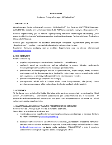 REGULAMIN Konkursu Fotograficznego „Mój ekodzień” 1. ORGANIZATOR Organizatorem Konkursu Fotograficznego pt. „Mój ekodzień” jest Centrum UNEP/GRID-Warszawa, Zakład NFOŚ z siedzibą przy ul. Sobieszyńskiej 8, 00-764 Warszawa (dalej zwanym: „Organizatorem”). Konkurs organizowany jest w ramach ogólnopolskiej kampanii informacyjno-edukacyjnej „Zrób prezent sobie i środowisku” dofinansowanej ze środków Narodowego Funduszu Ochrony Środowiska i Gospodarki Wodnej. Konkurs jest organizowany na zasadach określonych niniejszym regulaminem (dalej zwanym: „Regulaminem”) i zgodnie z powszechnie obowiązującymi przepisami prawa. Regulamin Konkursu dostępny jest w siedzibie Organizatora oraz na stronie internetowej www.ekoprezent.org 2. CELE KONKURSU Celami Konkursu są: popularyzacja wiedzy na temat ochrony środowiska i zmian klimatu; zwrócenie uwagi na ograniczenia wpływu człowieka na zmiany klimatu, zmniejszenia niekorzystnego wpływu człowieka na otaczające go środowisko; promowanie pro-ekologicznych postaw w społeczeństwie, dzięki którym, każdy uczestnik może przyczynić się do poprawy stanu środowiska naturalnego poprzez zmniejszenie emisji zanieczyszczeń, co przełoży się bezpośrednio na zrównoważony rozwój ; poznanie indywidualnego spojrzenia na ekologię; propagowanie, wśród osób w każdym wieku, sztuki fotografowania, jako jednej z form artystycznego wyrazu, a także znakomitego środka komunikacji międzyludzkiej. 3. UCZESTNICY W Konkursie może wziąć udział każdy, kto fotografuje, zarówno amator, jak i profesjonalista (dalej zwany: „Uczestnikiem”). Warunkiem uczestnictwa jest zarejestrowanie się w Konkursie. W przypadku osób niepełnoletnich – wymagana jest zgoda opiekuna prawnego na zgłoszenie się i udział w Konkursie osoby niepełnoletniej. 4. CZAS TRWANIA KONKURSU I WARUNKI PRZYSTĄPIENIA DO KONKURSU Konkurs trwa od 17 lutego 2014 roku do 25 kwietnia 2014 roku. Warunkiem uczestnictwa w Konkursie jest: a) rejestracja poprzez wypełnienie formularza zgłoszeniowego dostępnego w zakładce Konkurs na stronie internetowej www.ekoprezent.org b) zaakceptowanie warunków uczestnictwa w Konkursie („Oświadczenie Uczestnika Konkursu” zamieszczone na stronie Konkursu) i wysłanie skanu podpisanego Oświadczenia na adres: [email protected] (w tytule maila wpisując: OŚWIADCZENIE + imię i nazwisko uczestnika Konkursu) lub oryginału pocztą tradycyjną na adres: Centrum UNEP/GRID-Warszawa ul. Sobieszyńska 8, 00-764 Warszawa z dopiskiem: KONKURS FOTOGRAFICZNY MÓJ EKODZIEŃ Prace konkursowe może przesyłać jedynie Uczestnik, który dopełni wszystkich wyżej wskazanych czynności formalnych. W Konkursie wezmą udział prace fotograficzne, które spełnią wymogi techniczne opisane w Regulaminie i w terminie wskazanym w Regulaminie zostaną przesłane do Organizatora, tj. najpóźniej do 25 kwietnia 2014 roku (włącznie) znajdą się w posiadaniu Organizatora. Przesłanie zdjęć możliwe jest poprzez maila, na adres: [email protected] W tytule maila należy wpisać: imię + nazwisko + zdjęcie nr 1/2/3 Poprzez przesłanie zdjęcia (lub zdjęć) na Konkurs, Uczestnik potwierdza, że zapoznał się z Regulaminem oraz akceptuje jego postanowienia. 5. WYMAGANIA DOTYCZĄCE PRAC KONKURSOWYCH Zdjęcia nadesłane do Konkursu muszą spełniać następujące warunki: a) nawiązywać do celów Konkursu; b) zostać nadesłane jako pliki cyfrowe w formacie JPG kompresja 10, kolor (RGB) lub czarno-biały (greyscale), krótszy bok zdjęcia musi mieć nie mniej niż 2000 pikseli; c) dodatkowo istnieje możliwość przesłania, na własną odpowiedzialność, zdjęcia/zdjęć wykonanych dowolnym telefonem komórkowym. Warunkiem jest spełnienie przez powyższe prace wymogów technicznych określonych w Regulaminie. Jeden Uczestnik może nadesłać łącznie do 3 zdjęć. W przypadku nadesłania większej liczby zdjęć przez jednego Uczestnika, Organizator zastrzega sobie prawo do wyboru 3 zdjęć metodą losową, bez uwzględnienia w Konkursie pozostałych prac tego Uczestnika. 6. FINAŁ I ROZSTRZYGNIĘCIE KONKURSU Rozstrzygnięcie Konkursu nastąpi do dnia 8 maja 2014 roku. Prace konkursowe zostaną ocenione przez jury Konkursu, które zostanie powołane najpóźniej do dnia 25 kwietnia 2014 roku. Ogłoszenie składu jury Konkursu nastąpi najpóźniej do dnia 25 kwietnia 2014 w zakładce Konkurs na stronie internetowej www.ekoprezent.org. Werdykt jury jest ostateczny. Ogłoszenie wyników odbędzie się w dniu 8 maja 2014 roku, poprzez umieszczenie ich na stronie internetowej www.ekoprezent.org w zakładce Konkurs. Laureaci Konkursu zostaną powiadomieni o wygranej drogą e-mailową w ciągu 5 dni od daty rozstrzygnięcia Konkursu. Wiadomość zostanie wysłana na adres wskazany w treści formularza zgłoszeniowego. W przypadku, gdy laureat Konkursu nie poda danych kontaktowych, jury ma prawo – według własnego uznania – albo dokonać kolejnego wyboru, albo wezwać laureata do podania danych, publikując na stronie internetowej www.ekoprezent.org nagrodzone zdjęcie i wzywając autora do kontaktu z Organizatorem. W przypadku niezgłoszenia się autora tak opublikowanego zdjęcia w ciągu kolejnych 2 dni roboczych od daty internetowej publikacji, Organizator wybierze kolejnego laureata. Organizator zastrzega sobie prawo do wykorzystania nagrodzonych zdjęć w swojej działalności promocyjnej bez obowiązku wynagrodzenia dla autora zdjęć, jednakże Organizator nie ma obowiązku wykorzystania zdjęć. 7. NAGRODY Prace zwycięzców Konkursu zostaną zaprezentowane na pokonkursowych wystawach organizowanych na terenie całego kraju. Nagrodą specjalną dla laureatów Konkursu za I i II miejsce będzie sprzęt multimedialny: tablety, za zajęcie III miejsca odtwarzacz mp3. Prace wyróżnione otrzymają nagrody pocieszenia: ekotorby filcowe. 8. POSTANOWIENIA DODATKOWE Organizator nie zwraca Uczestnikom żadnych kosztów związany