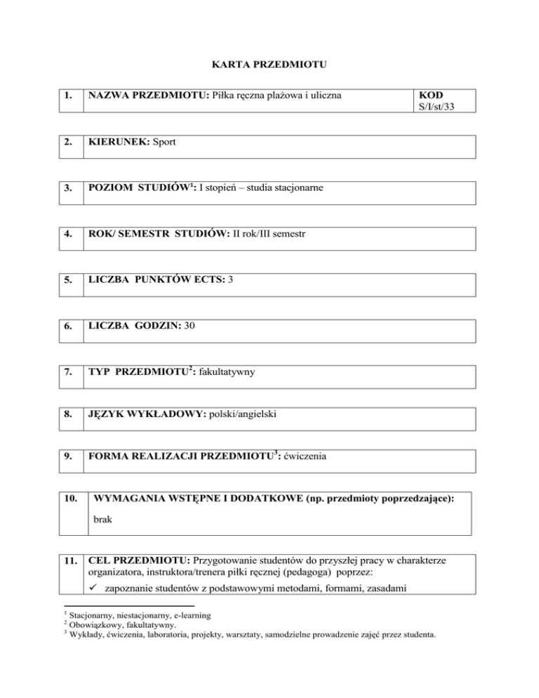 KARTA PRZEDMIOTU 1. NAZWA PRZEDMIOTU: Piłka ręczna plażowa i uliczna 2. KIERUNEK: Sport 3. POZIOM STUDIÓW1: I stopień – studia stacjonarne 4. ROK/ SEMESTR STUDIÓW: II rok/III semestr 5. LICZBA PUNKTÓW ECTS: 3 6. LICZBA GODZIN: 30 7. TYP PRZEDMIOTU2: fakultatywny 8. JĘZYK WYKŁADOWY: polski/angielski 9. FORMA REALIZACJI PRZEDMIOTU3: ćwiczenia 10. KOD S/I/st/33 WYMAGANIA WSTĘPNE I DODATKOWE (np. przedmioty poprzedzające): brak 11. CEL PRZEDMIOTU: Przygotowanie studentów do przyszłej pracy w charakterze organizatora, instruktora/trenera piłki ręcznej (pedagoga) poprzez: zapoznanie studentów z podstawowymi metodami, formami, zasadami 1 Stacjonarny, niestacjonarny, e-learning Obowiązkowy, fakultatywny. 3 Wykłady, ćwiczenia, laboratoria, projekty, warsztaty, samodzielne prowadzenie zajęć przez studenta. 2 i środkami treningowymi wykorzystywanymi w nauczaniu piłki ręcznej plażowej i street handballu; opanowanie podstawowej wiedzy o sportowej technice i taktyce gry oraz o podstawowych zagadnieniach treningu sportowego w piłce ręcznej plażowej i street handballu; zapoznanie z przepisami gry i mechaniką sędziowania piłki ręcznej plażowej i street handballu; opanowanie umiejętności planowania i organizacji zawodów sportowych w piłce ręcznej plażowej i street handballu ; samodzielne prowadzenie jednostki treningowej z piłki ręcznej plażowej i street handballu. 12. PRZEDMIOTOWE EFEKTY KSZTAŁCENIA4 Odniesienie do kierunkowych efektów kształcenia (symbol) P_W01. Potrafi wyjaśnić podstawowe pojęcia z K_W10 zakresu treningu, techniki i taktyki gry w piłce Odniesienie do obszarowych efektów kształcenia (symbol) M1_W09 M1_W10 ręcznej plażowej i w street handballu, oraz zna podstawowe metody, formy, zasady i środki treningowe. P_W02. Zna sposób wykonania i systematykę ćwiczeń w nauczaniu podstawowych i doskonaleniu umiejętności techniczno- K_W07 K_W10 M1_W04 M1_W06 M1_W08 M1_W09 M1_W10 K_W15 M1_W08 K_W07 K_W10 M1_W04 M1_W06 M1_W08 M1_W09 M1_W10 K_U15 K_U16 M1_U01 M1_U11 taktycznych w piłce ręcznej plażowej i w street handballu. P_W03. Posiada wiedzę z zakresu przepisów gry, mechaniki sędziowania oraz planowania i organizacji zawodów sportowych w piłkę ręczną plażową i w street handball. P_W04. Posiada wiedzę nieprawidłowościach podstawowych w o błędach strukturze umiejętności oraz ruchu techniczno- taktycznych. P_U01. Posiada odpowiedni poziom sprawności 4 Efekty kształcenia w zakresie wiedzy (P_W), umiejętności (P_U) i kompetencji społecznych (P_K). wszechstronnej, ukierunkowanej i specjalnej w zakresie podstawowych umiejętności technicznotaktycznych z piłki ręcznej plażowej i street handballu. Potrafi dobierać strategie i metody P_U02. nauczania umiejętności techniczno-taktycznych, zaplanować i przeprowadzić (wybraną część) jednostki treningowej z piłki ręcznej plażowej i street handballu. P_U03. Potrafi planować, organizować zawody sportowe w piłce ręcznej plażowej i w street handballu, rejestrować ich przebieg, pełnić rolę K_U01 K_U03 K_U04 K_U05 K_U10 K_U13 K_U15 K_U16 K_U17 K_U18 K_U10 K_U13 K_U17 K_U20 sędziego głównego, sekretarza i mierzącego czas. P_U04. Potrafi wykonać pokaz podstawowych umiejętności techniczno-taktycznych wykorzystywanych w piłce ręcznej plażowej i w K_U01 K_U07 K_U13 K_U15 K_U16 M1_U01 M1_U02 M1_U03 M1_U08 M1_U10 M1_U11 M1_U13 K_K04 K_K06 K_K07 K_K10 M1_K01 M1_K02 M1_K04 M1_K05 M1_K06 K_K10 M1_K02 M1_K04 M1_K05 M1_K06 K_K07 M1_K01 street handballu. Rozumie P_K01. samokształcenia wykonania się potrzebę ustawicznego w prawidłowego celu powierzonych mu zadań M1_U01 M1_U02 M1_U03 M1_U04 M1_U05 M1_U07 M1_U08 M1_U09 M1_U10 M1_U11 M1_U13 M1_U12 M1_U03 M1_U04 M1_U05 M1_U09 M1_U10 M1_U13 z zakresu nauczania i doskonalenia podstawowych umiejętności techniczno-taktycznych z piłki ręcznej plażowej i street handballu. P_K02. Realizuje zadania w sposób zapewniający bezpieczeństwo własne i otoczenia, przestrzega zasad bezpieczeństwa pracy. P_K03. Posiada umiejętność samooceny zakresie poziomu sprawności specjalnej. w 13. METODY OCENY EFEKTÓW KSZTAŁCENIA Symbol przedmiotowego efektu kształcenia P_W01 Metody (sposoby) oceny5 Typ oceny6 Forma dokumentacji ocenianie ciągłe formująca P_W02 zaliczenie pisemne podsumowująca dziennik zajęć nauczyciela konspekt zajęć P_W03 zaliczenie pisemne podsumowująca test z przepisów P_W04 ocenianie ciągłe formująca P_U01 ocenianie ciągłe formująca dziennik zajęć nauczyciela dziennik zajęć nauczyciela P_U02 zaliczenie pisemne podsumowująca konspekt zajęć P_U03 podsumowująca dziennik zajęć nauczyciela dziennik zajęć nauczyciela P_K01 ocena umiejętności sędziowania w sprawdzianie praktycznym ocena poziomu podstawowych umiejętności technicznych za pomocą sprawdzianu praktycznego kontrola obecności P_K02 ocenianie ciągłe podsumowująca P_K03 ocenianie ciągłe podsumowująca P_U04 podsumowująca formująca dziennik zajęć nauczyciela dziennik zajęć nauczyciela dziennik zajęć nauczyciela 14. TREŚCI PROGRAMOWE Forma zajęć7 Treść zajęć (liczba godz.) 1. Wprowadzenie do przedmiotu – zapoznanie z treściami programowymi, wymogami zaliczeniowymi oraz sprawami organizacyjnymi. Historia ćwiczenia (2) Symbol przedmiotowych efektów kształcenia P_W01 i charakterystyka gry w piłkę ręczną plażową i street handball w aspekcie sportowym, rekreacyjnym i 5 Ocenianie ciągłe (bieżące przygotowanie do zajęć), śródsemestralne zaliczenie pisemne, śródsemestralne zaliczenie ustne, końcowe zaliczenia pisemne, końcowe zaliczenia ustne, egzamin pisemny, egzamin ustny, praca semestralna, ocena umiejętności ruchowych, praca dyplomowa, projekt, kontrola obecności 6 Formująca, podsumowująca. 7 Wykłady, ćwiczenia, laboratoria, samodzielne prowadzenie zajęć przez studenta. zdrowotnym. Rozgrzewka indywidualna z piłkami. Gra szkolna – sprawdzenie umiejętności. 2. Metody, fo