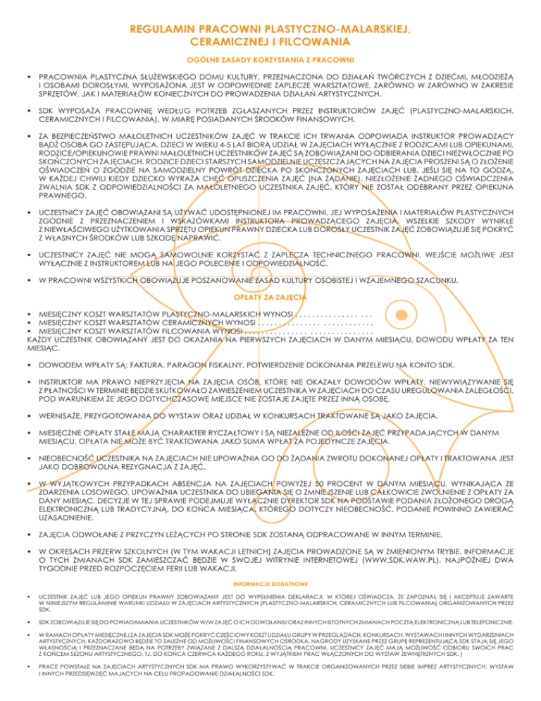 REGULAMIN PRACOWNI PLASTYCZNO-MALARSKIEJ, CERAMICZNEJ I FILCOWANIA OGÓLNE ZASADY KORZYSTANIA Z PRACOWNI § PRACOWNIA PLASTYCZNA SŁUŻEWSKIEGO DOMU KULTURY, PRZEZNACZONA DO DZIAŁAŃ TWÓRCZYCH Z DZIEĆMI, MŁODZIEŻĄ I OSOBAMI DOROSŁYMI, WYPOSAŻONA JEST W ODPOWIEDNIE ZAPLECZE WARSZTATOWE, ZARÓWNO W ZARÓWNO W ZAKRESIE SPRZĘTÓW, JAK I MATERIAŁÓW KONIECZNYCH DO PROWADZENIA DZIAŁAŃ ARTYSTYCZNYCH. § SDK WYPOSAŻA PRACOWNIĘ WEDŁUG POTRZEB ZGŁASZANYCH PRZEZ INSTRUKTORÓW ZAJĘĆ (PLASTYCZNO-MALARSKICH, CERAMICZNYCH I FILCOWANIA), W MIARĘ POSIADANYCH ŚRODKÓW FINANSOWYCH. § ZA BEZPIECZEŃSTWO MAŁOLETNICH UCZESTNIKÓW ZAJĘĆ W TRAKCIE ICH TRWANIA ODPOWIADA INSTRUKTOR PROWADZĄCY BĄDŹ OSOBA GO ZASTĘPUJĄCA. DZIECI W WIEKU 4-5 LAT BIORĄ UDZIAŁ W ZAJĘCIACH WYŁĄCZNIE Z RODZICAMI LUB OPIEKUNAMI. RODZICE/OPIEKUNOWIE PRAWNI MAŁOLETNICH UCZESTNIKÓW ZAJĘĆ SĄ ZOBOWIĄZANI DO ODBIERANIA DZIECI NIEZWŁOCZNIE PO SKOŃCZONYCH ZAJĘCIACH. RODZICE DZIECI STARSZYCH SAMODZIELNIE UCZĘSZCZAJĄCYCH NA ZAJĘCIA PROSZENI SĄ O ZŁOŻENIE OŚWIADCZEŃ O ZGODZIE NA SAMODZIELNY POWRÓT DZIECKA PO SKOŃCZONYCH ZAJĘCIACH LUB, JEŚLI SIĘ NA TO GODZĄ, W KAŻDEJ CHWILI KIEDY DZIECKO WYRAŻA CHĘĆ OPUSZCZENIA ZAJĘĆ (NA ŻĄDANIE). NIEZŁOŻENIE ŻADNEGO OŚWIADCZENIA ZWALNIA SDK Z ODPOWIEDZIALNOŚCI ZA MAŁOLETNIEGO UCZESTNIKA ZAJĘĆ, KTÓRY NIE ZOSTAŁ ODEBRANY PRZEZ OPIEKUNA PRAWNEGO. § UCZESTNICY ZAJĘĆ OBOWIĄZANI SĄ UŻYWAĆ UDOSTĘPNIONEJ IM PRACOWNI, JEJ WYPOSAŻENIA I MATERIAŁÓW PLASTYCZNYCH ZGODNIE Z PRZEZNACZENIEM I WSKAZÓWKAMI INSTRUKTORA PROWADZĄCEGO ZAJĘCIA. WSZELKIE SZKODY WYNIKŁE Z NIEWŁAŚCIWEGO UŻYTKOWANIA SPRZĘTU OPIEKUN PRAWNY DZIECKA LUB DOROSŁY UCZESTNIK ZAJĘĆ ZOBOWIĄZUJE SIĘ POKRYĆ Z WŁASNYCH ŚRODKÓW LUB SZKODĘ NAPRAWIĆ. § UCZESTNICY ZAJĘĆ NIE MOGĄ SAMOWOLNIE KORZYSTAĆ Z ZAPLECZA TECHNICZNEGO PRACOWNI. WEJŚCIE MOŻLIWE JEST WYŁĄCZNIE Z INSTRUKTOREM LUB NA JEGO POLECENIE I ODPOWIEDZIALNOŚĆ. § W PRACOWNI WSZYSTKICH OBOWIĄZUJE POSZANOWANIE ZASAD KULTURY OSOBISTEJ I WZAJEMNEGO SZACUNKU. OPŁATY ZA ZAJĘCIA § MIESIĘCZNY KOSZT WARSZTATÓW PLASTYCZNO-MALARSKICH WYNOSI . . . . . . . . . . . . . . . . . . § MIESIĘCZNY KOSZT WARSZTATÓW CERAMICZNYCH WYNOSI . . . . . . . . . . . . . . . . . . . . . . . . . . . § MIESIĘCZNY KOSZT WARSZTATÓW FILCOWANIA WYNOSI . . . . . . . . . . . . . . . . . . . . . . . . . . . . . . KAŻDY UCZESTNIK OBOWIĄZANY JEST DO OKAZANIA NA PIERWSZYCH ZAJĘCIACH W DANYM MIESIĄCU, DOWODU WPŁATY ZA TEN MIESIĄC. § DOWODEM WPŁATY SĄ: FAKTURA, PARAGON FISKALNY, POTWIERDZENIE DOKONANIA PRZELEWU NA KONTO SDK. § INSTRUKTOR MA PRAWO NIEPRZYJĘCIA NA ZAJĘCIA OSÓB, KTÓRE NIE OKAZAŁY DOWODÓW WPŁATY. NIEWYWIĄZYWANIE SIĘ Z PŁATNOŚCI W TERMINIE BĘDZIE SKUTKOWAŁO ZAWIESZENIEM UCZESTNIKA W ZAJĘCIACH DO CZASU UREGULOWANIA ZALEGŁOŚCI, POD WARUNKIEM ŻE JEGO DOTYCHCZASOWE MIEJSCE NIE ZOSTAJE ZAJĘTE PRZEZ INNĄ OSOBĘ. § WERNISAŻE, PRZYGOTOWANIA DO WYSTAW ORAZ UDZIAŁ W KONKURSACH TRAKTOWANE SĄ JAKO ZAJĘCIA. § MIESIĘCZNE OPŁATY STAŁE MAJĄ CHARAKTER RYCZAŁTOWY I SĄ NIEZALEŻNE OD ILOŚCI ZAJĘĆ PRZYPADAJĄCYCH W DANYM MIESIĄCU. OPŁATA NIE MOŻE BYĆ TRAKTOWANA JAKO SUMA WPŁAT ZA POJEDYNCZE ZAJĘCIA. § NIEOBECNOŚĆ UCZESTNIKA NA ZAJĘCIACH NIE UPOWAŻNIA GO DO ŻĄDANIA ZWROTU DOKONANEJ OPŁATY I TRAKTOWANA JEST JAKO DOBROWOLNA REZYGNACJA Z ZAJĘĆ. § W WYJĄTKOWYCH PRZYPADKACH ABSENCJA NA ZAJĘCIACH POWYŻEJ 50 PROCENT W DANYM MIESIĄCU, WYNIKAJĄCA ZE ZDARZENIA LOSOWEGO, UPOWAŻNIA UCZESTNIKA DO UBIEGANIA SIĘ O ZMNIEJSZENIE LUB CAŁKOWICIE ZWOLNIENIE Z OPŁATY ZA DANY MIESIĄC. DECYZJE W TEJ SPRAWIE PODEJMUJE WYŁĄCZNIE DYREKTOR SDK NA PODSTAWIE PODANIA ZŁOŻONEGO DROGĄ ELEKTRONICZNĄ LUB TRADYCYJNĄ, DO KOŃCA MIESIĄCA, KTÓREGO DOTYCZY NIEOBECNOŚĆ. PODANIE POWINNO ZAWIERAĆ UZASADNIENIE. § ZAJĘCIA ODWOŁANE Z PRZYCZYN LEŻĄCYCH PO STRONIE SDK ZOSTANĄ ODPRACOWANE W INNYM TERMINIE. § W OKRESACH PRZERW SZKOLNYCH (W TYM WAKACJI LETNICH) ZAJĘCIA PROWADZONE SĄ W ZMIENIONYM TRYBIE. INFORMACJE O TYCH ZMIANACH SDK ZAMIESZCZAĆ BĘDZIE W SWOJEJ WITRYNIE INTERNETOWEJ (WWW.SDK.WAW.PL), NAJPÓŹNIEJ DWA TYGODNIE PRZED ROZPOCZĘCIEM FERII LUB WAKACJI. INFORMACJE DODATKOWE § UCZESTNIK ZAJĘĆ LUB JEGO OPIEKUN PRAWNY ZOBOWIĄZANY JEST DO WYPEŁNIENIA DEKLARACJI, W KTÓREJ OŚWIADCZA, ŻE ZAPOZNAŁ SIĘ I AKCEPTUJE ZAWARTE W NINIEJSZYM REGULAMINIE WARUNKI UDZIAŁU W ZAJĘCIACH ARTYSTYCZNYCH (PLASTYCZNO-MALARSKICH, CERAMICZNYCH LUB FILCOWANIA) ORGANIZOWANYCH PRZEZ SDK. § SDK ZOBOWIĄZUJE SIĘ DO POWIADAMIANIA UCZESTNIKÓW W/W ZAJĘĆ O ICH ODWOŁANIU ORAZ INNYCH ISTOTNYCH ZMIANACH POCZTĄ ELEKTRONICZNĄ LUB TELEFONICZNIE. § W RAMACH OPŁATY MIESIĘCZNEJ ZA ZAJĘCIA SDK MOŻE POKRYĆ CZĘŚCIOWY KOSZT UDZIAŁU GRUPY W PRZEGLĄDACH, KONKURSACH, WYSTAWACH I INNYCH WYDARZENIACH ARTYSTYCZNYCH. KAŻDORAZOWO BĘDZIE TO ZALEŻNE OD MOŻLIWOŚCI FINANSOWYCH OŚRODKA. NAGRODY UZYSKANE PRZEZ GRUPĘ REPREZENTUJĄCĄ SDK STAJĄ SIĘ JEGO WŁASNOŚCIĄ I PRZEZNACZANE BĘDĄ NA POTRZEBY ZWIĄZANE Z DALSZĄ DZIAŁALNOŚCIĄ PRACOWNI. UCZESTNICY ZAJĘĆ MAJĄ MOŻLIWOŚĆ ODBIORU SWOICH PRAC Z KOŃCEM SEZONU ARTYSTYCZNEGO, TJ. DO KOŃCA CZERWCA KAŻDEGO ROKU, Z WYJĄTKIEM PRAC WŁĄCZONYCH DO WYSTAW ZEWNĘTRZNYCH SDK. ] § PRACE POWSTAŁE NA ZAJĘCIACH ARTYSTYCZNYCH SDK MA PRAWO WYKORZYSTYWAĆ W TRAKCIE ORGANIZOWANYCH PRZEZ SIEBIE IMPREZ ARTYSTYCZNYCH, WYSTAW I INNYCH PRZEDSIĘWZIĘĆ MAJĄCYCH NA CELU PROPAGOWANIE DZIAŁALNOŚCI SDK.