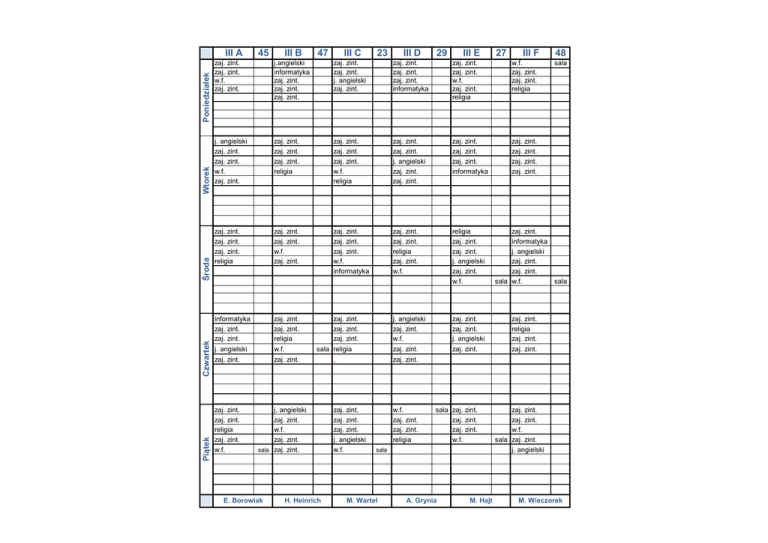 Piątek Czwartek Środa Wtorek Poniedziałek III A 45 III B 47 III C 23 III D 29 III E 27 III F zaj. zint. zaj. zint. w.f. zaj. zint. j.angielski informatyka zaj. zint. zaj. zint. zaj. zint. zaj. zint. zaj. zint. j. angielski zaj. zint. zaj. zint. zaj. zint. zaj. zint. informatyka zaj. zint. zaj. zint. w.f. zaj. zint. religia w.f. zaj. zint. zaj. zint. religia j. angielski zaj. zint. zaj. zint. w.f. zaj. zint. zaj. zint. zaj. zint. zaj. zint. religia zaj. zint. zaj. zint. zaj. zint. w.f. religia zaj. zint. zaj. zint. j. angielski zaj. zint. zaj. zint. zaj. zint. zaj. zint. zaj. zint. informatyka zaj. zint. zaj. zint. zaj. zint. zaj. zint. zaj. zint. zaj. zint. zaj. zint. religia zaj. zint. zaj. zint. w.f. zaj. zint. zaj. zint. zaj. zint. zaj. zint. w.f. informatyka zaj. zint. zaj. zint. religia zaj. zint. w.f. religia zaj. zint. zaj. zint. j. angielski zaj. zint. w.f. informatyka zaj. zint. zaj. zint. zaj. zint. zaj. zint. religia zaj. zint. zaj. zint. zaj. zint. j. angielski zaj. zint. w.f. zaj. zint. zaj. zint. j. angielski zaj. zint. religia zaj. zint. j. angielski w.f. sala religia zaj. zint. zaj. zint. zaj. zint. zaj. zint. zaj. zint. , zaj. zint. zaj. zint. zaj. zint. zaj. zint. j. angielski w.f. w.f. zaj. zint. zaj. zint. religia zaj. zint. zaj. zint. religia zaj. zint. w.f. j. angielski zaj. zint. w.f. zaj. zint. sala zaj. zint. E. Borowiak H. Heinrich sala zaj. zint. zaj. zint. zaj. zint. w.f. sala M. Wartel A. Grynia M. Hajt 48 sala zaj. zint. informatyka j. angielski zaj. zint. zaj. zint. sala w.f. sala zaj. zint. zaj. zint. w.f. sala zaj. zint. j. angielski M. Wieczorek