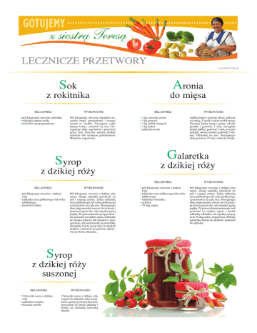 Sok Aronia z rokitnika SKŁADNIKI: do mięsa SKŁADNIKI: WYKONANIE: pół kilograma owoców rokitnika szklanka zimnej wody l miód lub syrop gruszkowy l l Pół kilograma owoców rokitnika starannie umyć, przepołowić i usunąć ziarna ze środka. Następnie zalać zimną wodą i zostawić na noc. Następnego dnia zagotować i przetrzeć przez sito. Przecier można słodzić miodem lub syropem gruszkowym. Wszystko zagotować. 1 kg owoców aronii 1 kg gruszek l 1 kg jabłek winnych l 1 kg cukru l szklanka wody l l Syrop WYKONANIE: pół kilograma owoców z dzikiej róży l szklanka octu jabłkowego lub soku jabłkowego l miód lub cukier l Pół kilograma owoców z dzikiej róży umyć, odciąć szypułki, przekroić na pół i usunąć ziarna. Zalać szklanką octu jabłkowego lub soku jabłkowego i pozostawić na całą noc. Następnego dnia doprowadzić owoce do wrzenia i przetrzeć przez sito, aby uzyskać gęstą papkę. Po przecedzeniu syrop ponownie postawić na małym ogniu, dosłodzić do smaku cukrem lub miodem i podgotować, aby wymieszały się wszystkie składniki. Gęsty syrop wlać do małych słoików i odstawić do spiżarni. Spożywać po łyżce dziennie. Syrop z dzikiej róży suszonej SKŁADNIKI: 2 łyżeczki suszu z dzikiej róży l szklanka wrzątku l łyżeczka miodu l WYKONANIE: 2 łyżeczki suszu z dzikiej róży wsypać do szklanki, zalać wrzątkiem i parzyć pod przykryciem, przecedzić do innej szklanki i dodać na szklankę łyżeczkę miodu. WYKONANIE: Jabłka winne i gruszki obrać, pokroić w kostkę. Z wody i cukru zrobić syrop. Oczyścić łyżką syrop z piany, włożyć gruszki i gotować 5 min, następnie dodać jabłka i gotować 5 min, po czym dołożyć owoce aronii i gotować 5 minut. Odstawić na noc. Następnego dnia gotować 25 min i wlać do słoika. Galaretka z dzikiej róży z dzikiej róży SKŁADNIKI: naszdziennik.pl SKŁADNIKI: pół kilograma owoców z dzikiej róży l szklanka octu jabłkowego lub soku jabłkowego l szklanka rokitnika l cytryna l 70 dag cukru l WYKONANIE: Pół kilograma owoców z dzikiej róży umyć, odciąć szypułki, przekroić na pół i usunąć ziarna. Zalać szklanką octu jabłkowego lub soku jabłkowego i pozostawić na całą noc. Następnego dnia doprowadzić owoce do wrzenia i przetrzeć przez sito, aby uzyskać gęstą papkę. Po przecedzeniu ponownie sok postawić na małym ogniu i dodać szklankę rokitnika, sok z jednej cytryny oraz 70 dag cukru. Zagotować. Później galaretkę włożyć do słoików i odstawić do spiżarni.