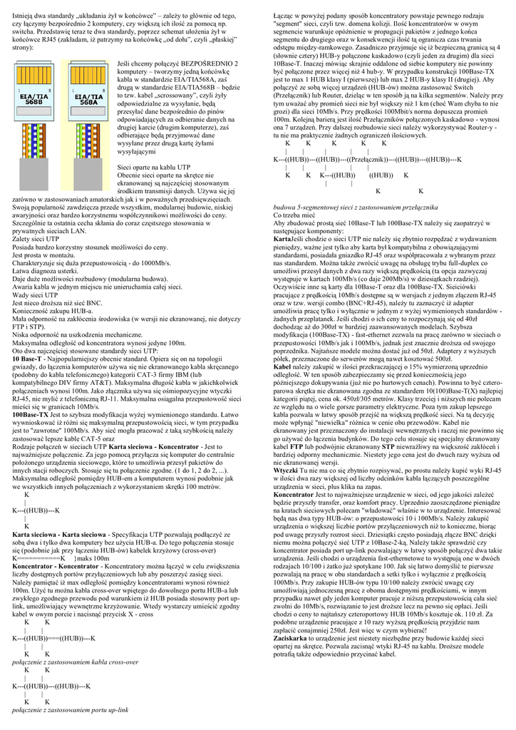 Istnieją dwa standardy „układania żył w końcówce” – zależy to głównie od tego, czy łączymy bezpośrednio 2 komputery, czy większą ich ilość za pomocą np. switcha. Przedstawię teraz te dwa standardy, poprzez schemat ułożenia żył w końcówce RJ45 (zakładam, iż patrzymy na końcówkę „od dołu”, czyli „płaskiej” strony): Jeśli chcemy połączyć BEZPOŚREDNIO 2 komputery – tworzymy jedną końcówkę kabla w standardzie EIA/TIA568A, zaś drugą w standardzie EIA/TIA568B – będzie to tzw. kabel „scrossowany”, czyli żyły odpowiedzialne za wysyłanie, będą przesyłać dane bezpośrednio do pinów odpowiadających za odbieranie danych na drugiej karcie (drugim komputerze), zaś odbierające będą przyjmować dane wysyłane przez drugą kartę żyłami wysyłającymi Sieci oparte na kablu UTP Obecnie sieci oparte na skrętce nie ekranowanej są najczęściej stosowanym środkiem transmisji danych. Używa się jej zarówno w zastosowaniach amatorskich jak i w poważnych przedsięwzięciach. Swoją popularność zawdzięcza przede wszystkim, modularnej budowie, niskiej awaryjności oraz bardzo korzystnemu współczynnikowi możliwości do ceny. Szczególnie ta ostatnia cecha skłania do coraz częstszego stosowania w prywatnych sieciach LAN. Zalety sieci UTP Posiada bardzo korzystny stosunek możliwości do ceny. Jest prosta w montażu. Charakteryzuje się duża przepustowością - do 1000Mb/s. Łatwa diagnoza usterki. Daje duże możliwości rozbudowy (modularna budowa). Awaria kabla w jednym miejscu nie unieruchamia całej sieci. Wady sieci UTP Jest nieco droższa niż sieć BNC. Konieczność zakupu HUB-a. Mała odporność na zakłócenia środowiska (w wersji nie ekranowanej, nie dotyczy FTP i STP). Niska odporność na uszkodzenia mechaniczne. Maksymalna odległość od koncentratora wynosi jedyne 100m. Oto dwa najczęściej stosowane standardy sieci UTP: 10 Base-T - Najpopularniejszy obecnie standard. Opiera się on na topologii gwiazdy, do łączenia komputerów używa się nie ekranowanego kabla skręcanego (podobny do kabla telefonicznego) kategorii CAT-3 firmy IBM (lub kompatybilnego DIV firmy AT&T). Maksymalna długość kabla w jakichkolwiek połączeniach wynosi 100m. Jako złącznika używa się ośmiopozycyjne wtyczki RJ-45, nie mylić z telefoniczną RJ-11. Maksymalna osiągalna przepustowość sieci mieści się w granicach 10Mb/s. 100Base-TX Jest to szybsza modyfikacja wyżej wymienionego standardu. Łatwo wywnioskować iż różni się maksymalną przepustowością sieci, w tym przypadku jest to "zawrotne" 100Mb/s. Aby sieć mogła pracować z taką szybkością należy zastosować lepsze kable CAT-5 oraz Rodzaje połączeń w sieciach UTP Karta sieciowa - Koncentrator - Jest to najważniejsze połączenie. Za jego pomocą przyłącza się komputer do centralnie położonego urządzenia sieciowego, które to umożliwia przesył pakietów do innych stacji roboczych. Stosuje się tu połączenie zgodne. (1 do 1, 2 do 2, ...). Maksymalna odległość pomiędzy HUB-em a komputerem wynosi podobnie jak we wszystkich innych połączeniach z wykorzystaniem skrętki 100 metrów. K | K---((HUB))---K | K Karta sieciowa - Karta sieciowa - Specyfikacja UTP pozwalają podłączyć ze sobą dwa i tylko dwa komputery bez użycia HUB-a. Do tego połączenia stosuje się (podobnie jak przy łączeniu HUB-ów) kabelek krzyżowy (cross-over) K===========K }maks 100m Koncentrator - Koncentrator - Koncentratory można łączyć w celu zwiększenia liczby dostępnych portów przyłączeniowych lub aby poszerzyć zasięg sieci. Należy pamiętać iż max odległość pomiędzy koncentratorami wynosi również 100m. Użyć tu można kabla cross-over wpiętego do dowolnego portu HUB-a lub zwykłego zgodnego przewodu pod warunkiem iż HUB posiada stosowny port uplink, umożliwiający wewnętrzne krzyżowanie. Wtedy wystarczy umieścić zgodny kabel w owym porcie i nacisnąć przycisk X - cross K K | | K---((HUB))===((HUB))---K | | K K połączenie z zastosowaniem kabla cross-over K K | | K---((HUB))---((HUB))---K | | K K połączenie z zastosowaniem portu up-link Łącząc w powyżej podany sposób koncentratory powstaje pewnego rodzaju "segment" sieci, czyli tzw. domena kolizji. Ilość koncentratorów w owym segmencie warunkuje opóźnienie w propagacji pakietów z jednego końca segmentu do drugiego oraz w konsekwencji ilość tą ogranicza czas trwania odstępu między-ramkowego. Zasadniczo przyjmuje się iż bezpieczną granicą są 4 (słownie cztery) HUB-y połączone kaskadowo (czyli jeden za drugim) dla sieci 10Base-T. Inaczej mówiąc skrajnie oddalone od siebie komputery nie powinny być połączone przez więcej niż 4 hub-y. W przypadku konstrukcji 100Base-TX jest to max 1 HUB klasy I (pierwszej) lub max 2 HUB-y klasy II (drugiej). Aby połączyć ze sobą więcej urządzeń (HUB-ów) można zastosować Switch (Przełącznik) lub Router, dzieląc w ten sposób ją na kilka segmentów. Należy przy tym uważać aby promień sieci nie był większy niż 1 km (choć Wam chyba to nie grozi) dla sieci 10Mb/s. Przy prędkości 100Mbit/s norma dopuszcza promień 100m. Kolejną barierą jest ilość Przełączników połączonych kaskadowo - wynosi ona 7 urządzeń. Przy dalszej rozbudowie sieci należy wykorzystywać Router-y tu nie ma praktycznie żadnych ograniczeń ilościowych. K K K K K | | | | | K---((HUB))---((HUB))---((Przełącznik))---((HUB))---((HUB))---K | | | | | K K K---((HUB)) ((HUB)) K | | K K budowa 5-segmentowej sieci z zastosowaniem przełącznika Co trzeba mieć Aby zbudować prostą sieć 10Base-T lub 100Base-TX należy się zaopatrzyć w następujące komponenty: KartaJeśli chodzie o sieci UTP nie należy się zbytnio rozpędzać z wydawaniem pieniędzy, ważne jest tylko aby karta był kompatybilna z obowiązującymi standardami, posiadała gniazdko RJ-45 oraz współpracowała z wybranym przez nas standardem. Można tak