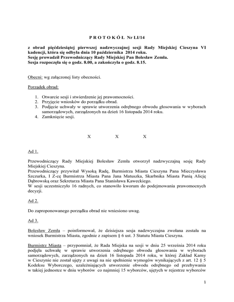 P R O T O K Ó Ł Nr LI/14 z obrad pięćdziesiątej pierwszej nadzwyczajnej sesji Rady Miejskiej Cieszyna VI kadencji, która się odbyła dnia 10 października 2014 roku. Sesję prowadził Przewodniczący Rady Miejskiej Pan Bolesław Zemła. Sesja rozpoczęła się o godz. 8.00, a zakończyła o godz. 8.15. Obecni: wg załączonej listy obecności. Porządek obrad: 1. Otwarcie sesji i stwierdzenie jej prawomocności. 2. Przyjęcie wniosków do porządku obrad. 3. Podjęcie uchwały w sprawie utworzenia odrębnego obwodu głosowania w wyborach samorządowych, zarządzonych na dzień 16 listopada 2014 roku. 4. Zamknięcie sesji. X X X Ad 1. Przewodniczący Rady Miejskiej Bolesław Zemła otworzył nadzwyczajną sesję Rady Miejskiej Cieszyna. Przewodniczący przywitał Wysoką Radę, Burmistrza Miasta Cieszyna Pana Mieczysława Szczurka, I Z-cę Burmistrza Miasta Pana Jana Matuszka, Skarbnika Miasta Panią Alicję Dąbrowską oraz Sekretarza Miasta Pana Stanisława Kaweckiego. W sesji uczestniczyło 16 radnych, co stanowiło kworum do podejmowania prawomocnych decyzji. Ad 2. Do zaproponowanego porządku obrad nie wniesiono uwag. Ad 3. Bolesław Zemła – poinformował, że dzisiejsza sesja nadzwyczajna zwołana została na wniosek Burmistrza Miasta, zgodnie z zapisem § 6 ust. 3 Statutu Miasta Cieszyna. Burmistrz Miasta – przypomniał, że Rada Miejska na sesji w dniu 25 września 2014 roku podjęła uchwałę w sprawie utworzenia odrębnego obwodu głosowania w wyborach samorządowych, zarządzonych na dzień 16 listopada 2014 roku, w której Zakład Karny w Cieszynie nie został ujęty z uwagi na nie spełnienie wymogów wynikających z art. 12 § 5 Kodeksu Wyborczego, uzależniających utworzenie obwodu odrębnego od przebywania w takiej jednostce w dniu wyborów co najmniej 15 wyborców, ujętych w rejestrze wyborców 1 prowadzonym w gminie, na terenie której położona jest dana jednostka. Powiedział, że wcześniej poczynione konsultacje z Dyrektorem Zakładu Karnego w Cieszynie wykazały, że w/w warunek nie zostanie spełniony. Jednakże w dniu 8 października br. Dyrektor złożył wniosek o utworzenie odrębnego obwodu głosowania argumentując, że w Zakładzie Karnym przebywa aktualnie 358 osób z terenu województwa śląskiego, które zostałyby pozbawione możliwości głosowania w wyborach do Sejmiku Województwa Śląskiego. Termin utworzenia odrębnych obwodów głosowania w wyborach samorządowych zarządzonych na dzień 16 listopada br. mija 12 października, stąd podjęcie uchwały w tej sprawie wymaga rozstrzygnięcia przez Rade Miejską w trybie pilnym. Eugeniusz Raabe – wspomniał, że na sesji we wrześniu padały pytania od radnych o odrębny obwód głosowania w Zakładzie Karnym. Stwierdził, iż smutne to i przykre, że Zakład Karny naprowadza Panów na to, jak interpretować przepisy prawa. Pyta – co robi radca prawny, co robi Sekretarz Miasta. Jak można było do tego dopuścić. Powiedział, że dla niego jest to kolejny skandal i kolejna „niedoróbka”. Burmistrz Miasta – odpowiedział, że nikt nie musi ich naprowadzać na prawidłowe normy prawne. Poinformował, że są dwa niespójne paragrafy w Kodeksie Wyborczym, który wszedł w życie od obecnej kadencji. Po piśmie Dyrektora Zakładu Karnego, Pan Sekretarz natychmiast udał się do Delegatury Krajowego Biura Wyborczego w Bielsku-Białej. Powiedział, że nawet Pan Adamek, który jest szefem ds. wyborów na naszym terenie, miał wątpliwości co do stworzenia tego obwodu. Podkreślił, że nie trzeba tworzyć tego obwodu do głosowania, ale można. Ponieważ więźniowie nie są ludźmi gorszej kategorii, zwrócił się z wnioskiem o umożliwienie im głosowania, tworząc w Zakładzie Karnym odrębny obwód głosowania. Eugeniusz Raabe – zapytał, co by było, gdyby 358 osób z terenu województwa śląskiego pozbawiono możliwości głosowania do sejmiku - na przykład. Stwierdził, że jest to zadziwiające. Powiedział, że gorszą byłaby sytuacja, gdyby zaczęli się oni odwoływać, że pozbawiono ich prawa głosu. Wspomniał, że emerytowany już Sekretarz Miasta Pan Ryszard Mazur osobiście chodził do Zakładu Karnego i innych placówek, stąd nie przyjmuje do wiadomości żadnych tłumaczeń. Burmistrz Miasta – powiedział, że nowy Kodeks Wyborczy diametralnie zmienił pewne rzeczy. Odczytał treść § 5 „W wyborach do organów stanowiących jednostek samorządu terytorialnego oraz w wyborach wójta, odrębny obwód głosowania w jednostce tworzy się, jeżeli w dniu wyborów będzie w nim przebywać co najmniej 15 wyborców ujętych w rejestrze wyborców…”. Z pisma Dyrektora Zakładu Karnego wynika, że jest tam 14 skazanych z naszego terenu, czyli wg zapisu tego paragrafu, nie powinno się tam tworzyć obwodu głosowania. Przytoczył brzmienie § 6 Kodeksu Wyborczego „Jeżeli w dniu wyborów w jednostce będzie przebywać mniej niż 15 wyborców, można w niej utworzyć odrębny obwód głosowania, po zasięgnięciu opinii kierującej daną jednostką”. Adam Wójtowicz – zapytał przedstawicielkę Kancelarii Prawnej, czy Sejmik Województwa Śląskiego jest również jednostką samorządu terytorialnego. Anna Jurczyk – odpowiedziała, że nie, gdyż jest nim Województwo Śląskie. Dodała, że przepis jest jasny. Dodatkowy obwód głosowania należy utworzyć wtedy, gdy jest 15 i więcej wyborców ujętych w naszym gminnym rejestrze wyborców. Wtedy jest nakaz, aby utworzyć ten dodatkowy obwód wyborczy. Jeżeli jest mniej, wtedy można utworzyć. 2 Adam Wójtowicz – wspomniał, że na ostatniej sesji mówił o tym, że jeżeli będzie 10 skazanych wpisanych do rejestru wyborców Cieszyna, a 5 z Ustronia, 5 z Wisły i 5 z Zebrzydowic, to razem tworzą grupę kwalifikującą się do głosowania do Rady Powiatu Cieszyńskiego. Krzysztof Herok – stwierdził, że gdyby Koreks Wyborczy został przeanalizowany dogłębnie, to takich sytuacji by nie by