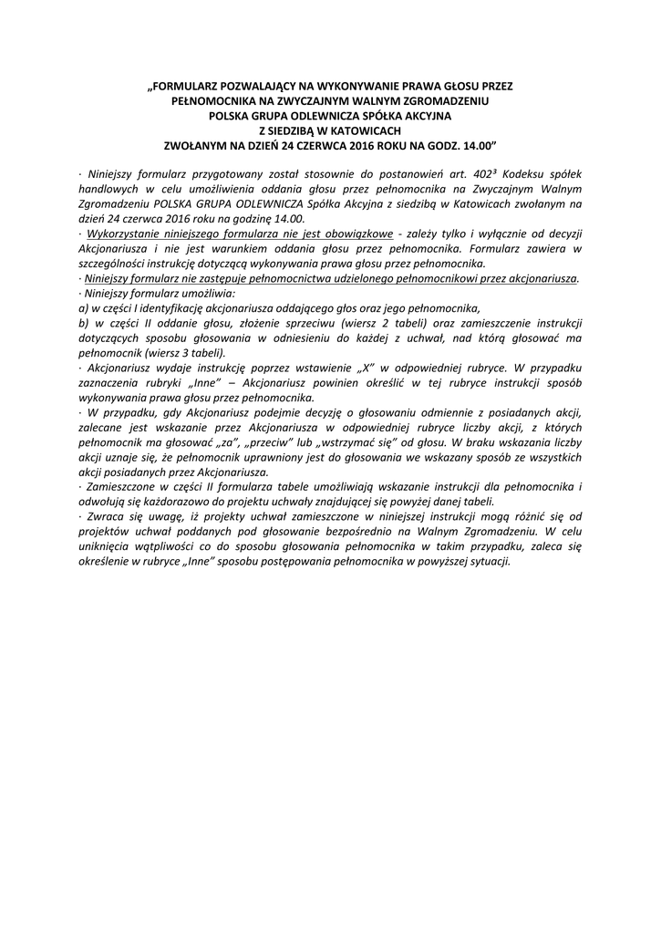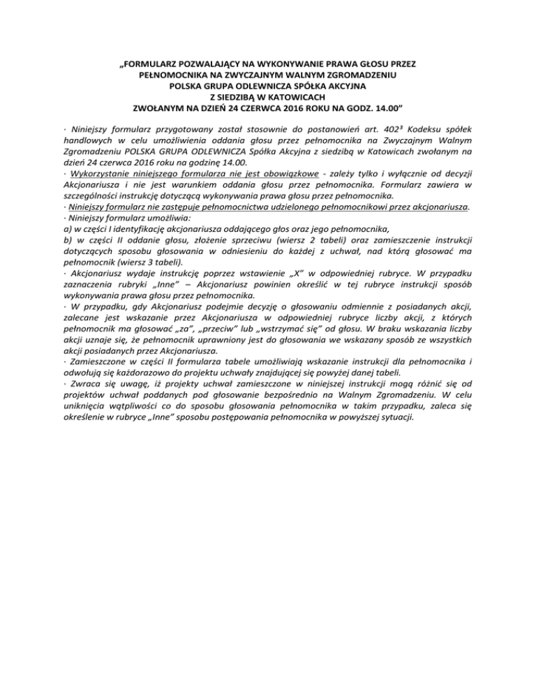 „FORMULARZ POZWALAJĄCY NA WYKONYWANIE PRAWA GŁOSU PRZEZ PEŁNOMOCNIKA NA ZWYCZAJNYM WALNYM ZGROMADZENIU POLSKA GRUPA ODLEWNICZA SPÓŁKA AKCYJNA Z SIEDZIBĄ W KATOWICACH ZWOŁANYM NA DZIEŃ 24 CZERWCA 2016 ROKU NA GODZ. 14.00” · Niniejszy formularz przygotowany został stosownie do postanowień art. 402³ Kodeksu spółek handlowych w celu umożliwienia oddania głosu przez pełnomocnika na Zwyczajnym Walnym Zgromadzeniu POLSKA GRUPA ODLEWNICZA Spółka Akcyjna z siedzibą w Katowicach zwołanym na dzień 24 czerwca 2016 roku na godzinę 14.00. · Wykorzystanie niniejszego formularza nie jest obowiązkowe - zależy tylko i wyłącznie od decyzji Akcjonariusza i nie jest warunkiem oddania głosu przez pełnomocnika. Formularz zawiera w szczególności instrukcję dotyczącą wykonywania prawa głosu przez pełnomocnika. · Niniejszy formularz nie zastępuje pełnomocnictwa udzielonego pełnomocnikowi przez akcjonariusza. · Niniejszy formularz umożliwia: a) w części I identyfikację akcjonariusza oddającego głos oraz jego pełnomocnika, b) w części II oddanie głosu, złożenie sprzeciwu (wiersz 2 tabeli) oraz zamieszczenie instrukcji dotyczących sposobu głosowania w odniesieniu do każdej z uchwał, nad którą głosować ma pełnomocnik (wiersz 3 tabeli). · Akcjonariusz wydaje instrukcję poprzez wstawienie „X” w odpowiedniej rubryce. W przypadku zaznaczenia rubryki „Inne” – Akcjonariusz powinien określić w tej rubryce instrukcji sposób wykonywania prawa głosu przez pełnomocnika. · W przypadku, gdy Akcjonariusz podejmie decyzję o głosowaniu odmiennie z posiadanych akcji, zalecane jest wskazanie przez Akcjonariusza w odpowiedniej rubryce liczby akcji, z których pełnomocnik ma głosować „za”, „przeciw” lub „wstrzymać się” od głosu. W braku wskazania liczby akcji uznaje się, że pełnomocnik uprawniony jest do głosowania we wskazany sposób ze wszystkich akcji posiadanych przez Akcjonariusza. · Zamieszczone w części II formularza tabele umożliwiają wskazanie instrukcji dla pełnomocnika i odwołują się każdorazowo do projektu uchwały znajdującej się powyżej danej tabeli. · Zwraca się uwagę, iż projekty uchwał zamieszczone w niniejszej instrukcji mogą różnić się od projektów uchwał poddanych pod głosowanie bezpośrednio na Walnym Zgromadzeniu. W celu uniknięcia wątpliwości co do sposobu głosowania pełnomocnika w takim przypadku, zaleca się określenie w rubryce „Inne” sposobu postępowania pełnomocnika w powyższej sytuacji. CZĘŚĆ I. IDENTYFIKACJA AKCJONARIUSZA I PEŁNOMOCNIKA PEŁNOMOCNIK: ____________________________________________________________________________ (imię i nazwisko / firma Pełnomocnika) __________________________________________________________________________________________ (adres zamieszkania/ siedziba, nr telefonu, adres e mail) __________________________________________________________________________________________ (NIP, PESEL/ REGON) AKCJONARIUSZ: ___________________________________________________________________________ (imię i nazwisko / firma Akcjonariusza) __________________________________________________________________________________________ (adres zamieszkania/ siedziba, nr telefonu, adres e mail) __________________________________________________________________________________________ (NIP, PESEL/ REGON) __________________________________________________________________________________________ (liczba i rodzaj akcji z których wykonywane będzie prawo głosu) CZĘŚĆ II. INSTRUKCJA DOTYCZĄCA WYKONYWANIA PRAWA GŁOSU PRZEZ PEŁNOMOCNIKA NA ZWYCZAJNYM WALNYM ZGROMADZENIU POLSKA GRUPA ODLEWNICZA SPÓŁKA AKCYJNA Z SIEDZIBĄ W KATOWICACH ZWOŁANYM NA DZIEŃ 24 CZERWCA 2016 ROKU, NA GODZ. 14.00 UCHWAŁA NR ……. Zwyczajnego Walnego Zgromadzenia POLSKA GRUPA ODLEWNICZA S.A. z dnia 24 czerwca 2016 roku w sprawie: wyboru Przewodniczącego Zwyczajnego Walnego Zgromadzenia 1. Działając na podstawie art. 409 §1 k.s.h. Zwyczajne Walne Zgromadzenie POLSKA GRUPA ODLEWNICZA S.A. z siedzibą w Katowicach wybiera Pana/Panią ……………… na Przewodniczącego Walnego Zgromadzenia 2. Uchwała wchodzi w życie z dniem podjęcia. Projekt uchwały nr ………… Zwyczajnego Walnego Zgromadzenia POLSKA GRUPA ODLEWNICZA S.A. z dnia 24 czerwca 2016 roku w sprawie: wyboru Przewodniczącego Zwyczajnego Walnego Zgromadzenia za przeciw wstrzymujące się zgłoszenie Sprzeciwu Liczba akcji: _______________ Liczba akcji: _______________ Liczba akcji: _______________ według uznania pełnomocnika Liczba akcji: _______________ inne: Podpis Akcjonariusza ________________________________________ (data, miejscowość, podpis) UCHWAŁA NR ……. Zwyczajnego Walnego Zgromadzenia POLSKA GRUPA ODLEWNICZA S.A. z dnia 24 czerwca 2016 roku w sprawie: wyboru Komisji Skrutacyjnej 1. Zwyczajne Walne Zgromadzenie POLSKA GRUPA ODLEWNICZA S.A. z siedzibą w Katowicach wybiera Komisję Skrutacyjną w następującym składzie: …………… 2. Uchwała wchodzi w życie z dniem podjęcia. Projekt uchwały nr ………… Zwyczajnego Walnego Zgromadzenia POLSKA GRUPA ODLEWNICZA S.A. z dnia 24 czerwca 2016 roku w sprawie: wyboru Komisji Skrutacyjnej za przeciw wstrzymujące się zgłoszenie Sprzeciwu Liczba akcji: _______________ Liczba akcji: _______________ Liczba akcji: _______________ według uznania pełnomocnika Liczba akcji: _______________ inne: Podpis Akcjonariusza ________________________________________ (data, miejscowość, podpis) UCHWAŁA NR ……. Zwyczajnego Walnego Zgromadzenia POLSKA GRUPA ODLEWNICZA S.A. z dnia 24 czerwca 2016 roku w sprawie: przyjęcia porządku obrad 1. Zwyczajne Walne Zgromadzenie POLSKA GRUPA ODLEWNICZA S.A. z siedzibą w Katowicach przyjmuje porządek obrad w brzmieniu: 1) Otwarcie obrad Zgromadzenia 2) Wybór Przewodniczącego Zgromadzenia 3) Stwierdzenie prawidłowości zwołania Zgromadzenia oraz jego zdolności do podejmowania uchwał 4) Wybór Komi
