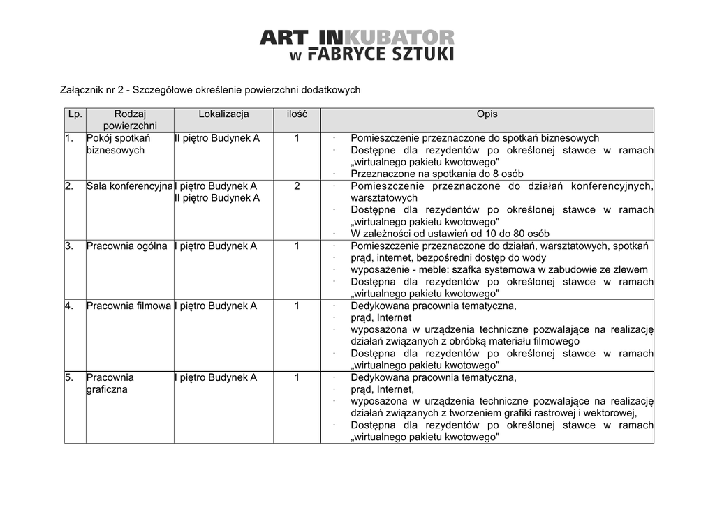 Załącznik nr 2 - Szczegółowe określenie powierzchni dodatkowych Lp. 1. 2. Rodzaj powierzchni Pokój spotkań biznesowych Lokalizacja ilość II piętro Budynek A 1 Sala konferencyjna I piętro Budynek A II piętro Budynek A 2 Opis · · · · · 3. Pracownia ogólna I piętro Budynek A 1 4. Pracownia filmowa I piętro Budynek A 1 · · · · · · · · · 5. Pracownia graficzna I piętro Budynek A 1 · · · · Pomieszczenie przeznaczone do spotkań biznesowych Dostępne dla rezydentów po określonej stawce w ramach „wirtualnego pakietu kwotowego" Przeznaczone na spotkania do 8 osób Pomieszczenie przeznaczone do działań konferencyjnych, warsztatowych Dostępne dla rezydentów po określonej stawce w ramach „wirtualnego pakietu kwotowego" W zależności od ustawień od 10 do 80 osób Pomieszczenie przeznaczone do działań, warsztatowych, spotkań prąd, internet, bezpośredni dostęp do wody wyposażenie - meble: szafka systemowa w zabudowie ze zlewem Dostępna dla rezydentów po określonej stawce w ramach „wirtualnego pakietu kwotowego" Dedykowana pracownia tematyczna, prąd, Internet wyposażona w urządzenia techniczne pozwalające na realizację działań związanych z obróbką materiału filmowego Dostępna dla rezydentów po określonej stawce w ramach „wirtualnego pakietu kwotowego" Dedykowana pracownia tematyczna, prąd, Internet, wyposażona w urządzenia techniczne pozwalające na realizację działań związanych z tworzeniem grafiki rastrowej i wektorowej, Dostępna dla rezydentów po określonej stawce w ramach „wirtualnego pakietu kwotowego" 6. Atelier fotograficzne I piętro Budynek A 1 · · · 7. Sala widowiskowa Parter Budynek C 1 · · · 8. Foyer Parter Budynek C 1 · · · · 9. Sale wielofunkcyjne I piętro Budynek B i C II piętro Budynek B i C 4 · · · Dedykowana pracownia tematyczna, wyposażona w urządzenia techniczne funkcjonujące jako podstawowe studio fotograficzne, Dostępne dla rezydentów po określonej stawce w ramach „wirtualnego pakietu kwotowego" Wielofunkcyjna sala przeznaczona do działań teatralnych, koncertowych, itp. Wyposażona w system oświetleniowy i nagłośnieniowy, oraz w mobilny system podestów do budowy widowni czy sceny Dostępna dla rezydentów po określonej stawce w ramach „wirtualnego pakietu kwotowego" Wielofunkcyjna sala przylegająca do sali widowiskowej przeznaczona do działań wystawienniczych, konferencyjnych, artystycznych, itp. Wyposażona w podstawowy system oświetleniowy i nagłośnieniowy Dostępna dla rezydentów po określonej stawce w ramach „wirtualnego pakietu kwotowego" Wielofunkcyjna sale przeznaczona do działań wystawienniczych, konferencyjnych, artystycznych, itp. Wyposażona w podstawowy system oświetleniowy i nagłośnieniowy Dostępne dla rezydentów po określonej stawce w ramach „wirtualnego pakietu kwotowego"