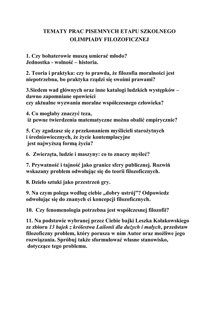 TEMATY PRAC PISEMNYCH ETAPU SZKOLNEGO OLIMPIADY FILOZOFICZNEJ 1. Czy bohaterowie muszą umierać młodo? Jednostka - wolność – historia. 2. Teoria i praktyka: czy to prawda, że filozofia moralności jest niepotrzebna, bo praktyka rządzi się swoimi prawami? 3.Siedem wad głównych oraz inne katalogi ludzkich występków – dawno zapomniane opowieści czy aktualne wyzwania moralne współczesnego człowieka? 4. Co mogłaby znaczyć teza, iż pewne twierdzenia matematyczne można obalić empirycznie? 5. Czy zgadzasz się z przekonaniem myślicieli starożytnych i średniowiecznych, że życie kontemplacyjne jest najwyższą formą życia? 6. Zwierzęta, ludzie i maszyny: co to znaczy myśleć? 7. Prywatność i tajność jako granice sfery publicznej. Rozwiń wskazany problem odwołując się do teorii filozoficznych. 8. Dzieło sztuki jako przestrzeń gry. 9. Na czym polega według ciebie „dobry ustrój”? Odpowiedz odwołując się do znanych ci koncepcji filozoficznych. 10. Czy fenomenologia potrzebna jest współczesnej filozofii? 11. Na podstawie wybranej przez Ciebie bajki Leszka Kołakowskiego ze zbioru 13 bajek z królestwa Lailonii dla dużych i małych, przedstaw filozoficzny problem, który porusza w nim Autor oraz możliwe jego rozwiązania. Spróbuj także sformułować własne stanowisko, dotyczące tego problemu.