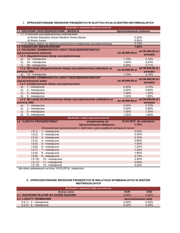 I. OPROCENTOWANIE ŚRODKÓW PIENIĘŻNYCH W ZŁOTYCH (PLN) KLIENTÓW INDYWIDUALNYCH Rachunki o zmiennej stopie procentowej I.1. RACHUNKI OSZCZĘDNOŚCIOWE - BIEŻĄCE Oprocentowanie zmienne I.1.1) rachunki oszczędnościowo-rozliczeniowe a) Konto Standard; Konto Student; Konto Senior 0,20% b) Konto Junior 0,50% 0,10% I.1.2) wkłady płatne na żądanie potwierdzone książeczką oszczędnościową I.2. KSIĄŻECZKI MIESZKANIOWE 1,00% I.3. RACHUNKI TERMINOWYCH LOKAT OSZCZĘDNOŚCOWYCH od 50.000,00 zł i do 49.999,99 zł (oprocentowanie zmienne) powyżej I.3.1. długoterminowe lokaty oszczędnościowe a) 12 - miesięczne 1,79% 2,16% b) 24 - miesięczne 1,94% 2,43% c) 36 - miesięczne 2,28% 2,71% od 50.000,00 zł i I.3.2. IB-Lokata (długoterminowe lokaty oszczędnościowe zakładane za do 49.999,99 zł pomocą SBI) powyżej a) 12 - miesięczne 1,79% 2,16% I.4. RACHUNKI TERMINOWYCH LOKAT OSZCZĘDNOŚCOWYCH* od 50.000,00 zł i do 49.999,99 zł (oprocentowanie stałe) powyżej I.4.1. krótkterminowe lokaty oszczędnościowe a) 1 - miesięczne 0,30% 0,70% b) 2 - miesięczne 0,50% 0,80% c) 3 - miesięczne 1,00% 1,30% d) 6 - miesięczne 1,30% 1,80% od 50.000,00 zł i I.4.2. IB-Lokata (krótkoterminowe lokaty oszczędnościowe zakładane za do 49.999,99 zł pomocą SBI) powyżej a) 1 - miesięczne 0,30% 0,70% b) 2 - miesięczne 0,50% 0,80% c) 3 - miesięczne 1,00% 1,30% d) 6 - miesięczne 1,30% 1,80% Rachunki o stałej stopie procentowej 10.03.2015 do odwołania I.4. "LOKATA PROGRESYWNA" przyjmowana od 1,70% Oprocentowanie efektywne: Gwarantowane oprocentowanie w skali roku w poszczególnych miesiącach wynosi 0,20% I.5.1) 1 - miesięczne 0,40% I.5.2) 2 - miesięczne 0,70% I.5.3) 3 - miesięczne 0,80% I.5.4) 4 - miesięczne 1,00% I.5.5) 5 - miesięczne 1,20% I.5.6) 6 - miesięczne 1,50% I.5.7) 7 - miesięczne 1,80% I.5.8) 8 - miesięczne 2,10% I.5.9) 9 - miesięczne 2,50% I.5.10) 10 - miesięczne 3,00% I.5.11) 11 - miesięczne I.5.12) 12 - miesięczne 5,20% * dla lokat zakładanych od dnia 10.03.2015r. (włącznie) II. OPROCENTOWANIE ŚRODKÓW PIENIĘŻNYCH W WALUTACH WYMIENIALNYCH KLIENTÓW INDYWIDUALNYCH Rachunki o zmiennej stopie procentowej Rodzaj waluty II.1. RACHUNKI PŁATNE NA KAŻDE ŻĄDANIE EUR 0,00% II.2. LOKATY TERMINOWE II.2.1) 3 - miesięczne II.2.2) 6 - miesięczne oprocentowanie stałe 0,25% 0,25% 0,30% 0,30% USD 0,00%
