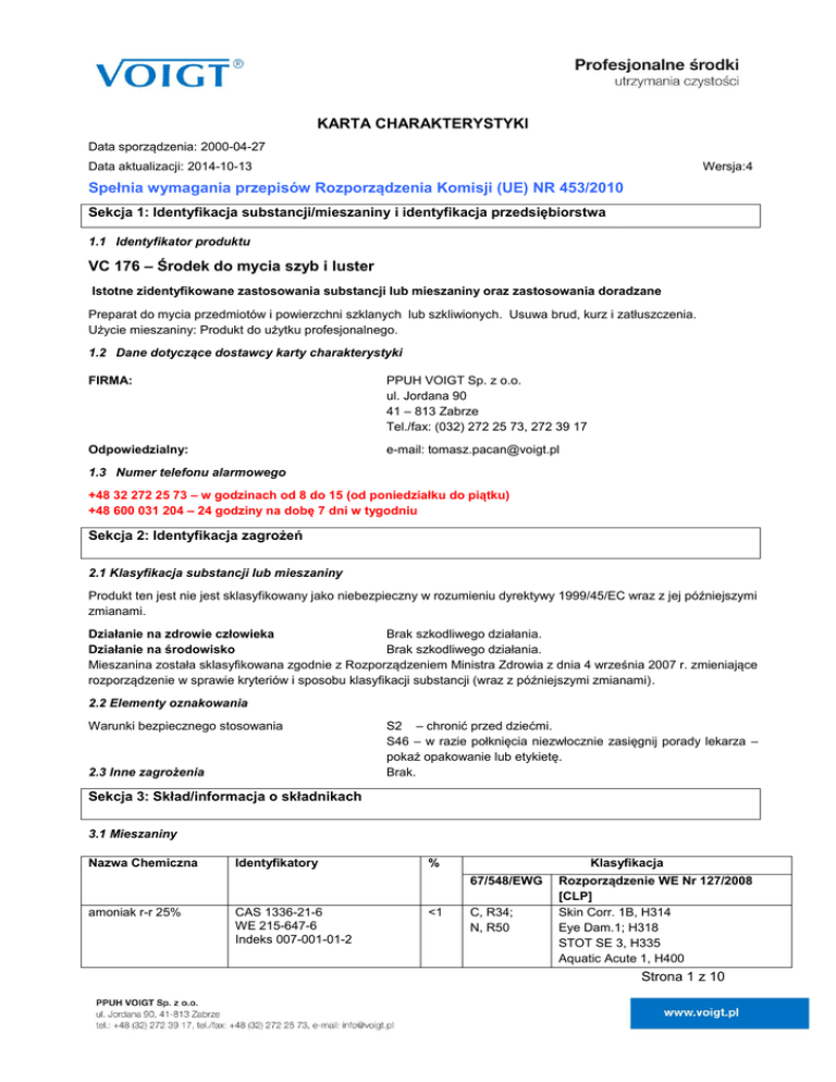 KARTA CHARAKTERYSTYKI Data sporządzenia: 2000-04-27 Data aktualizacji: 2014-10-13 Wersja:4 Spełnia wymagania przepisów Rozporządzenia Komisji (UE) NR 453/2010 Sekcja 1: Identyfikacja substancji/mieszaniny i identyfikacja przedsiębiorstwa 1.1 Identyfikator produktu VC 176 – Środek do mycia szyb i luster Istotne zidentyfikowane zastosowania substancji lub mieszaniny oraz zastosowania doradzane Preparat do mycia przedmiotów i powierzchni szklanych lub szkliwionych. Usuwa brud, kurz i zatłuszczenia. Użycie mieszaniny: Produkt do użytku profesjonalnego. 1.2 Dane dotyczące dostawcy karty charakterystyki FIRMA: PPUH VOIGT Sp. z o.o. ul. Jordana 90 41 – 813 Zabrze Tel./fax: (032) 272 25 73, 272 39 17 Odpowiedzialny: e-mail: [email protected] 1.3 Numer telefonu alarmowego +48 32 272 25 73 – w godzinach od 8 do 15 (od poniedziałku do piątku) +48 600 031 204 – 24 godziny na dobę 7 dni w tygodniu Sekcja 2: Identyfikacja zagrożeń 2.1 Klasyfikacja substancji lub mieszaniny Produkt ten jest nie jest sklasyfikowany jako niebezpieczny w rozumieniu dyrektywy 1999/45/EC wraz z jej późniejszymi zmianami. Działanie na zdrowie człowieka Brak szkodliwego działania. Działanie na środowisko Brak szkodliwego działania. Mieszanina została sklasyfikowana zgodnie z Rozporządzeniem Ministra Zdrowia z dnia 4 września 2007 r. zmieniające rozporządzenie w sprawie kryteriów i sposobu klasyfikacji substancji (wraz z późniejszymi zmianami). 2.2 Elementy oznakowania Warunki bezpiecznego stosowania 2.3 Inne zagrożenia S2 – chronić przed dziećmi. S46 – w razie połknięcia niezwłocznie zasięgnij porady lekarza – pokaż opakowanie lub etykietę. Brak. Sekcja 3: Skład/informacja o składnikach 3.1 Mieszaniny Nazwa Chemiczna Identyfikatory % Klasyfikacja 67/548/EWG amoniak r-r 25% CAS 1336-21-6 WE 215-647-6 Indeks 007-001-01-2 <1 C, R34; N, R50 Rozporządzenie WE Nr 127/2008 [CLP] Skin Corr. 1B, H314 Eye Dam.1; H318 STOT SE 3, H335 Aquatic Acute 1, H400 Strona 1 z 10 2-butoksyetanol izopropanol 1-metoksypropan-2-ol CAS: 111-76-2 Nr WE:203-905-0 Nr indeksowy: 603-014-00-0 Nr rejestracji: 01-2119475108-36-xxxxx CAS: 67-63-0 Nr WE: 200-661-7 Nr indeksowy: 603-117-00-0 Nr rejestracji: 01-2119457558-25-xxxx CAS 107-98-2 WE 203-539-1 Indeks 603-064-00-3 Nr rejestracji: 01-2119457435-35-xxxx <5 Xn; R20/21/22 Xi; R36/38 Acute Tox.4; H332 ; H312; H302 Eye Irrit.2; H319 Skin Irrit.2; H315 <5 F; R11 Xi; R36, R67 Flam. Liq.2; H225 Eye Irrit.2; H319 STOT SE3; H336 <5 R10 Flam. Liq.2; H226 Komentarz części składowych: Pełna treść przytoczonych wskazówek dotyczących zagrożeń znajduje się w sekcji 16. Sekcja 4: Środki pierwszej pomocy 4.1 Opis środków pierwszej pomocy W razie dostania się do dróg oddechowych: Zapewnić dopływ świeżego powietrza. W przypadku nie ustąpienia objawów, wezwać pomoc medyczną Kontakt ze skórą: Spłukać skażoną skórę dużą ilością wody, zdjąć odzież, skontaktować się z lekarzem. Kontakt z oczami: Płukać przez kilka minut pod bieżącą wodą przy otwartych powiekach, nałożyć jałowy opatrunek, skontaktować się z lekarzem. Droga pokarmowa: Popić dużą ilością wody, nie wywoływać wymiotów, natychmiast skontaktować się z lekarzem. 4.2 Najważniejsze ostre i opóźnione objawy oraz skutki narażenia Brak 4.3 Wskazania dotyczące wszelkiej natychmiastowej pomocy lekarskiej i szczególne postępowania z poszkodowanym Wskazówki dla lekarza: Leczenie objawowe. Sekcja 5: Postępowanie w przypadku pożaru 5.1 Środki gaśnicze Stosowany środek gaszący: Niewłaściwe środki gaśnicze: Użyć środka gaśniczego odpowiedniego dla ognia i otoczenia. Nie znane. 5.2 Szczególne zagrożenia związane z substancją lub mieszaniną W wyniku pożaru mogą tworzyć się szkodliwe dla zdrowia opary – stosować środki ochrony dróg oddechowych. 5.3 Informacje dla straży pożarnej Specjalny sprzęt ochronny dla strażaków: Podstawowy sprzęt ochrony osobistej oraz indywidualne aparaty oddechowe. Podstawowy poziom ochrony podczas wypadków chemicznych zapewnia odzież stosowana przez strażaków (włączając hełmy, buty ochronne i rękawice). Dodatkowe wskazówki: Pozostałości po pożarze i zanieczyszczoną wodę używaną do gaszenia ognia, muszą być usunięte zgodnie z przepisami. Strona 2 z 10 Sekcja 6: Postępowanie w przypadku niezamierzonego uwolnienia do środowiska 6.1 Indywidualne środki ostrożności, wyposażenie ochronne i procedury w sytuacjach awaryjnych Dla osób nienależących do personelu udzielającego pomocy: Dla osób udzielających pomocy: Nie należy podejmować żadnych działań, które stwarzałyby ryzyko dla kogokolwiek chyba, że jest się odpowiednio przeszkolonym. Nie dotykać, ani nie przechodzić po rozlanym materiale. Stosować środki ochrony indywidualnej. Unikać zanieczyszczenia oczu i skóry. Zapewnić odpowiednią wentylację. Dopilnować, aby usuwanie awarii i jej skutków przeprowadzał wyłącznie przeszkolony personel. Stosować środki ochrony indywidualnej. 6.2 Środki ostrożności w zakresie ochrony środowiska W przypadku uwolnienia większych ilości preparatu należy nie dopuścić do rozprzestrzenienia się w środowisku naturalnym. Powiadomić odpowiednie służby ratownicze. 6.3 Metody i materiały zapobiegające rozprzestrzenianiu się skażenia i służące do usuwania skażenia Metody zapobiegające rozprzestrzenianiu się wycieku: Metody likwidacji wycieku: O ile to możliwe zlikwidować wyciek, uszczelnić, uszkodzone opakowania umieścić w pojemniku ochronnym. Miejsca gromadzenia się cieczy obwałować, zebraną ciecz odpompować. Zebrać za pomocą materiałów wchłaniających ciecze (piasek, żwir, ziemia okrzemkowa, trociny itp.). Następnie umieścić w pojemnikach na odpady i usunąć zgodnie z przepisami dotyczącymi odpadów. 6.4 Odniesienie do innych sekcji Informacje dotyczące kontaktu w sytuacji awaryjnej podano w sekcji 1. Informacje dotyczące odpow