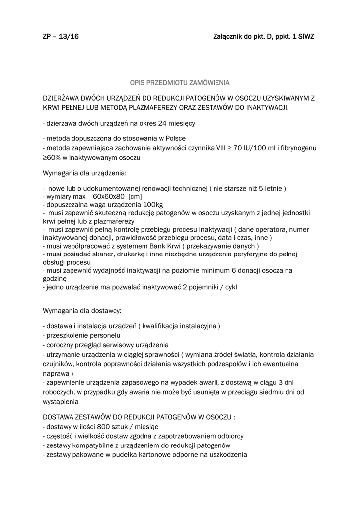 ZP – 13/16 Załącznik do pkt. D, ppkt. 1 SIWZ OPIS PRZEDMIOTU ZAMÓWIENIA DZIERŻAWA DWÓCH URZĄDZEŃ DO REDUKCJI PATOGENÓW W OSOCZU UZYSKIWANYM Z KRWI PEŁNEJ LUB METODĄ PLAZMAFEREZY ORAZ ZESTAWÓW DO INAKTYWACJI. - dzierżawa dwóch urządzeń na okres 24 miesięcy - metoda dopuszczona do stosowania w Polsce - metoda zapewniająca zachowanie aktywności czynnika VIII ≥ 70 IU/100 ml i fibrynogenu ≥60% w inaktywowanym osoczu Wymagania dla urządzenia: - nowe lub o udokumentowanej renowacji technicznej ( nie starsze niż 5-letnie ) - wymiary max 60x60x80 [cm] - dopuszczalna waga urządzenia 100kg - musi zapewnić skuteczną redukcję patogenów w osoczu uzyskanym z jednej jednostki krwi pełnej lub z plazmaferezy - musi zapewnić pełną kontrolę przebiegu procesu inaktywacji ( dane operatora, numer inaktywowanej donacji, prawidłowość przebiegu procesu, data i czas, inne ) - musi współpracować z systemem Bank Krwi ( przekazywanie danych ) - musi posiadać skaner, drukarkę i inne niezbędne urządzenia peryferyjne do pełnej obsługi procesu - musi zapewnić wydajność inaktywacji na poziomie minimum 6 donacji osocza na godzinę - jedno urządzenie ma pozwalać inaktywować 2 pojemniki / cykl Wymagania dla dostawcy: - dostawa i instalacja urządzeń ( kwalifikacja instalacyjna ) - przeszkolenie personelu - coroczny przegląd serwisowy urządzenia - utrzymanie urządzenia w ciągłej sprawności ( wymiana źródeł światła, kontrola działania czujników, kontrola poprawności działania wszystkich podzespołów i ich ewentualna naprawa ) - zapewnienie urządzenia zapasowego na wypadek awarii, z dostawą w ciągu 3 dni roboczych, w przypadku gdy awaria nie może być usunięta w przeciągu siedmiu dni od wystąpienia DOSTAWA ZESTAWÓW DO REDUKCJI PATOGENÓW W OSOCZU : - dostawy w ilości 800 sztuk / miesiąc - częstość i wielkość dostaw zgodna z zapotrzebowaniem odbiorcy - zestawy kompatybilne z urządzeniem do redukcji patogenów - zestawy pakowane w pudełka kartonowe odporne na uszkodzenia - w jednej dostawie zestawy o tej samej serii, ma być dołączona pełna dokumentacja umożliwiająca stosowanie ( certyfikat ) - każdy zestaw do inaktywacji ma być zapakowany indywidualnie, ewentualnie w jednym opakowaniu mogą być dwa zestawy. Po otwarciu opakowania zestaw może być użyty do 7 dni. Wymagania szczegółowe: - zestaw musi być jałowy i apirogenny - zestaw musi zapewniać możliwość redukcji patogenów w jednostce osocza otrzymanego z jednej jednostki krwi pełnej - zestaw ma zapewniać minimalne straty osocza w czasie inaktywacji ( < 15% ) - wszystkie pojemniki zestawu muszą być przejrzyste i muszą zapewniać możliwość oceny wizualnej pojemnika i osocza poddawanego inaktywacji oraz identyfikację serii i nr REF - dreny zestawu muszą umożliwiać stosowanie metody jałowego łączenia - pojemnik końcowy ( na osocze po inaktywacji ) ma być zaopatrzony w etykietę z informacjami o producencie, numerze serii ( literowo-cyfrowy i kod kreskowy ), dacie ważności, numerze REF - pojemnik do przechowywania osocza powinien zapewniać możliwość zamrażania osocza w temperaturze -600C - pojemnik do przechowywania osocza powinien posiadać dwa odpowiednio zabezpieczone porty umożliwiające podłączenie zestawu do przetaczania oraz odpowiednie nacięcia na brzegu pojemnika umożliwiające jego zawieszenie na statywie transfuzyjnym