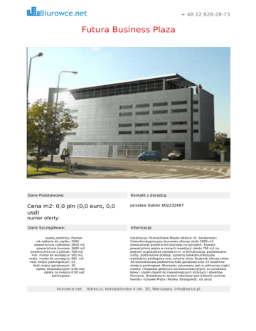 + 48 22 828-28-73 Futura Business Plaza Dane Podstawowe: Kontakt z doradcą: Cena m2: 0,0 pln (0,0 euro, 0,0 usd) Jarosław Gabler 602232667 numer oferty: Dane Szczegółowe: nazwa_dzielnicy: Poznań rok oddania do użytku: 2002 powierzchnia całkowita: 2816 m2 powierzchnia biurowa: 2800 m2 powierzchnia na 1 piętrze: 700 m2 min. moduł do wynajęcia: 561 m2 maks. moduł do wynajęcia: 561 m2 ilość miejsc parkingowych: 23 ilość miejsc garażowych: 30 opłaty eksploatacyjne: 0.00 usd opłaty za miejsce 0.00 usd parkingowe: biurowce.net Informacje: Lokalizacja: Poznań/Stare Miasto Okolice: Al. Solidarności Czterokondygnacyjny biurowiec oferuje około 2800 m2 nowoczesnej powierzchni biurowej na wynajem. Typowa powierzchnia piętra w ramach inwestycji (około 700 m2 na piętrze) wyposażona została m.in. w klimatyzację, podwieszane sufity, podnoszone podłogi, systemy telekomunikacyjne, wykładziny podłogowe oraz uchylne okna. Budynek oferuje także 30-stanowiskową podziemną halę garażową oraz 23 naziemne miejsca parkingowe. Biurowiec sytuowany jest w północnej części miasta, nieopodal głównych osi komunikacyjnych, co umożliwia łatwy i szybki dojazd do najważniejszych instytucji i obiektów Poznania. Dodatkowym atutem lokalizacji jest bliskość centrów handlu i rozrywki Plaza i Pestka. Dostępność: od zaraz Adres:ul. Konduktorska 4 lok. 30, Warszawa, [email protected]