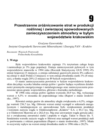 9 Przestrzenne zróŜnicowanie strat w produkcji roślinnej i zwierzęcej spowodowanych zanieczyszczeniem atmosfery w byłym województwie krakowskim GraŜyna Gawrońska Instytut Gospodarki Surowcami Mineralnymi i Energią PAN - Kraków Recenzent: Wojciech Piotrowski Politechnika Koszalińska 1. Wstęp Byłe województwo krakowskie zajmuje 1% terytorium całego kraju i zamieszkuje je 3% jego populacji. Emisja zanieczyszczeń pyłowych w tym województwie stanowiła w 1994 roku (Rocznik Statystyczny GUS 1995) 4% emisji krajowej (5 miejsce), a emisja substancji gazowych prawie 8% całkowitej emisji w skali Polski (3 miejsce); w tym emisja dwutlenku siarki 3% (8 miejsce), a tlenku węgla 28% (2 miejsce na 49 byłych województw). O stanie zanieczyszczenia powietrza w byłym województwie krakowskim decyduje wysoka lokalna emisja pyłów i gazów będąca wynikiem działalności przemysłu energetycznego i metalurgicznego oraz zanieczyszczenia przenoszone spoza granic województwa, głównie z kierunku zachodniego. W 1996 roku emisja pyłów ogółem wyniosła 20,9 tys. Mg, wykazując wzrost o 4,5% w stosunku do poprzedniego roku (Raport o stanie środowiska...1997). RównieŜ emisja gazów do atmosfery uległa zwiększeniu o 6,5%, osiągając wartość 236,7 tys. Mg. Głównie wzrost emisji wystąpił w sektorach energetycznym i metalurgicznym co spowodowane było zwiększeniem produkcji i wzrostem zuŜycia węgla w Elektrociepłowni „Kraków” S.A. o 85,3 tys. Mg, a w Elektrowni Skawina aŜ o 262,4 tys. Mg oraz uŜywaniem węgla gorszej jakości o zwiększonej zawartości siarki i popiołu w węglu. TakŜe w Hucie im. T. Sendzimira wzrosło zuŜycie węgla w Siłowni oraz nastąpił wzrost produkcji stali w porównaniu z rokiem poprzednim (Raport o stanie środowiska...1997). Miało to oczywisty wpływ na wzrost emisji dwutlenku siarki w 1996 roku o 20,2%. GraŜyna Gawrońska Głównymi źródłami zanieczyszczenia powietrza podobnie jak w latach ubiegłych były: Huta im. T. Sendzimira, która wyemitowała w 1996 roku 45% bilansowanej ilości pyłów i 64% ogólnej ilości gazów, w tym 22% stanowiła emisja dwutlenku siarki, następnie Elektrownia Skawina z bilansem 18% pyłów i 14% gazów, w tym 42% dwutlenku siarki oraz Elektrociepłownia „Kraków” S.A. z emisją 17% globalnej ilości pyłów i 12% substancji gazowych, w tym 28% emisji dwutlenku siarki. W niniejszym artykule zaprezentowano badania dotyczące poziomu strat w produkcji roślinnej i zwierzęcej w byłym województwie krakowskim w układzie gmin, spowodowanych zanieczyszczeniem atmosfery. Badania wykonano dla 1996r, poniewaŜ nie są dostępne bardziej aktualne dane o imisjach dwutlenku siarki, będące podstawą zastosowanej metody. 2. Materiał i metoda badań Na skutek negatywnego wpływu działalności przemysłu wzrost produkcji roślinnej i zwierzęcej jest systematycznie ograniczany. Straty stanowią róŜnicę między wielkością produkcji jaką rolnictwo mogłoby uzyskać w warunkach nie skaŜonego środowiska, a jaką uzyskuje faktycznie w istniejących warunkach glebowych, klimatycznych, postępu technicznego. Straty w produkcji roślinnej obliczono na podstawie wzoru (Gawrońska G. 1998): S r = Pr ⋅ Dr ⋅ Br ⋅ K r gdzie: Sr - straty w plonach roślin uprawnych [tys. zł], Pr - powierzchnia gruntów ornych w województwie [km2], Dr - średni plon 3 ziemiopłodów (ziemniaki, buraki cukrowe i 4 zboŜa) wyraŜony plonem przeliczeniowym wg T. Witka (Rolnicza przestrzeń..., 1974) [Mg/km2], Br - wskaźnik spadku plonu przeliczeniowego według BIGLEB, Kr - wartość 1 Mg zbioru - średnia cena ziemniaków, buraków cukrowych i 4 zbóŜ według GUS w badanym roku. Zespół specjalistów opracował dla potrzeb systemu BIGLEB wskaźnik spadku plonu przeliczeniowego w zaleŜności od strefy zagroŜenia obszarów na podstawie imisji dwutlenku siarki (tabela 1). Straty w produkcji zwierzęcej mogą wynikać zarówno z bezpośredniego oddziaływania zanieczyszczeń powietrza na zdrowie, kondycję zwierząt i przyrost masy mięsnej, jak równieŜ pośredniego, poprzez pasze. 206 Środkowo-Pomorskie Towarzystwo Naukowe Ochrony Środowiska Przestrzenne zróŜnicowanie strat w produkcji roślinnej i zwierzęcej ... Tabela 1. Wskaźniki spadku średniego plonu przeliczeniowego w zaleŜności od strefy zagroŜenia Table 1. Decrease indicators of mean conversion yield with regard to the risk zone Strefy I II III IV Średnioroczne stęŜenie SO2 [mg/m3] <0,020 0,021÷0,050 0,051÷0,100 >0,100 Wskaźnik spadku średniego plonu przeliczeniowego wg BIGLEB _ 0,10 0,15 0,25 źródło: Truszkowska R., Rejman-Czajkowska M. 1986 Do wyznaczenia strat w hodowli zwierząt wykorzystano wskaźnik padnięć zwierząt opracowany przez BIGLEB w przeliczeniu na 10000 szt. zwierząt w zaleŜności od strefy zagroŜenia obszarów na podstawie imisji dwutlenku siarki (tabela 2). Tabela 2..Wskaźniki padnięć zwierząt w zaleŜności od strefy zagroŜenia Table 2. Animal death indicators with regard to the risk zone Strefy I II III IV Średnioroczne stęŜenie SO2 [mg/m3] <0,020 0,021÷0,050 0,051÷0,100 >0,100 Wskaźniki padnięć zwierząt wg BIGLEB [szt.] 24 60 119 176 źródło: Truszkowska R., Rejman - Czajkowska M. 1986 Straty w produkcji zwierzęcej obliczono według formuły (Gawrońska G. 1998): S z = L z ⋅ 10 −4 ⋅ B z ⋅ K z gdzie: Sz - straty w hodowli zwierząt [tys. zł], Lz - liczba sztuk zwierząt w gminie obejmująca bydło, trzodę chlewną i owce, Bz - wskaźnik padnięć zwierząt według BIGLEB, Kz - wartość zwierzęcia ustalona jako średniowaŜona na podstawie masy i ceny uwzględnionych zwierząt według danych GUS w badanym roku. Środkowo-Pomorskie Towarzystwo Naukowe Ochrony Środowiska 207 GraŜyna Gawrońska 3. Wyniki badań W wyniku zastosowania przedstawionych wcześniej procedur uzyskano straty globalne w produkcji roślinnej i zwierzęcej dla byłego województwa krakowskiego w układzie gmin za 1
