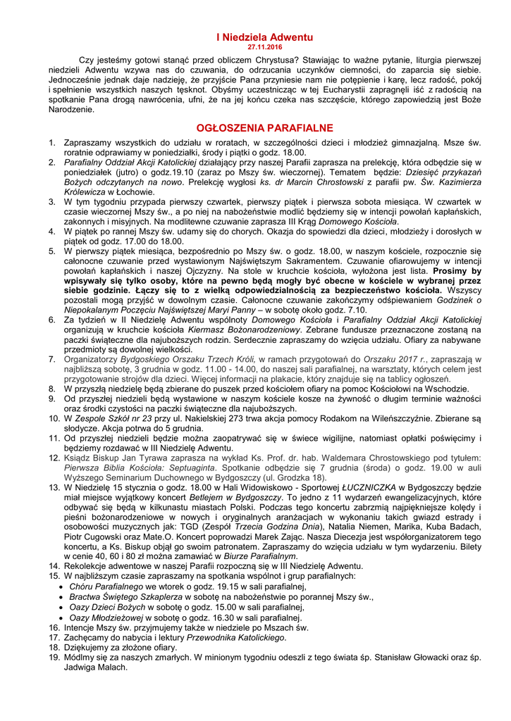 I Niedziela Adwentu 27.11.2016 Czy jesteśmy gotowi stanąć przed obliczem Chrystusa? Stawiając to ważne pytanie, liturgia pierwszej niedzieli Adwentu wzywa nas do czuwania, do odrzucania uczynków ciemności, do zaparcia się siebie. Jednocześnie jednak daje nadzieję, że przyjście Pana przyniesie nam nie potępienie i karę, lecz radość, pokój i spełnienie wszystkich naszych tęsknot. Obyśmy uczestnicząc w tej Eucharystii zapragnęli iść z radością na spotkanie Pana drogą nawrócenia, ufni, że na jej końcu czeka nas szczęście, którego zapowiedzią jest Boże Narodzenie. OGŁOSZENIA PARAFIALNE 1. Zapraszamy wszystkich do udziału w roratach, w szczególności dzieci i młodzież gimnazjalną. Msze św. roratnie odprawiamy w poniedziałki, środy i piątki o godz. 18.00. 2. Parafialny Oddział Akcji Katolickiej działający przy naszej Parafii zaprasza na prelekcję, która odbędzie się w poniedziałek (jutro) o godz.19.10 (zaraz po Mszy św. wieczornej). Tematem będzie: Dziesięć przykazań Bożych odczytanych na nowo. Prelekcję wygłosi ks. dr Marcin Chrostowski z parafii pw. Św. Kazimierza Królewicza w Łochowie. 3. W tym tygodniu przypada pierwszy czwartek, pierwszy piątek i pierwsza sobota miesiąca. W czwartek w czasie wieczornej Mszy św., a po niej na nabożeństwie modlić będziemy się w intencji powołań kapłańskich, zakonnych i misyjnych. Na modlitewne czuwanie zaprasza III Krąg Domowego Kościoła. 4. W piątek po rannej Mszy św. udamy się do chorych. Okazja do spowiedzi dla dzieci, młodzieży i dorosłych w piątek od godz. 17.00 do 18.00. 5. W pierwszy piątek miesiąca, bezpośrednio po Mszy św. o godz. 18.00, w naszym kościele, rozpocznie się całonocne czuwanie przed wystawionym Najświętszym Sakramentem. Czuwanie ofiarowujemy w intencji powołań kapłańskich i naszej Ojczyzny. Na stole w kruchcie kościoła, wyłożona jest lista. Prosimy by wpisywały się tylko osoby, które na pewno będą mogły być obecne w kościele w wybranej przez siebie godzinie. Łączy się to z wielką odpowiedzialnością za bezpieczeństwo kościoła. Wszyscy pozostali mogą przyjść w dowolnym czasie. Całonocne czuwanie zakończymy odśpiewaniem Godzinek o Niepokalanym Poczęciu Najświętszej Maryi Panny – w sobotę około godz. 7.10. 6. Za tydzień w II Niedzielę Adwentu wspólnoty Domowego Kościoła i Parafialny Oddział Akcji Katolickiej organizują w kruchcie kościoła Kiermasz Bożonarodzeniowy. Zebrane fundusze przeznaczone zostaną na paczki świąteczne dla najuboższych rodzin. Serdecznie zapraszamy do wzięcia udziału. Ofiary za nabywane przedmioty są dowolnej wielkości. 7. Organizatorzy Bydgoskiego Orszaku Trzech Króli, w ramach przygotowań do Orszaku 2017 r., zapraszają w najbliższą sobotę, 3 grudnia w godz. 11.00 - 14.00, do naszej sali parafialnej, na warsztaty, których celem jest przygotowanie strojów dla dzieci. Więcej informacji na plakacie, który znajduje się na tablicy ogłoszeń. 8. W przyszłą niedzielę będą zbierane do puszek przed kościołem ofiary na pomoc Kościołowi na Wschodzie. 9. Od przyszłej niedzieli będą wystawione w naszym kościele kosze na żywność o długim terminie ważności oraz środki czystości na paczki świąteczne dla najuboższych. 10. W Zespole Szkół nr 23 przy ul. Nakielskiej 273 trwa akcja pomocy Rodakom na Wileńszczyźnie. Zbierane są słodycze. Akcja potrwa do 5 grudnia. 11. Od przyszłej niedzieli będzie można zaopatrywać się w świece wigilijne, natomiast opłatki poświęcimy i będziemy rozdawać w III Niedzielę Adwentu. 12. Ksiądz Biskup Jan Tyrawa zaprasza na wykład Ks. Prof. dr. hab. Waldemara Chrostowskiego pod tytułem: Pierwsza Biblia Kościoła: Septuaginta. Spotkanie odbędzie się 7 grudnia (środa) o godz. 19.00 w auli Wyższego Seminarium Duchownego w Bydgoszczy (ul. Grodzka 18). 13. W Niedzielę 15 stycznia o godz. 18.00 w Hali Widowiskowo - Sportowej ŁUCZNICZKA w Bydgoszczy będzie miał miejsce wyjątkowy koncert Betlejem w Bydgoszczy. To jedno z 11 wydarzeń ewangelizacyjnych, które odbywać się będą w kilkunastu miastach Polski. Podczas tego koncertu zabrzmią najpiękniejsze kolędy i pieśni bożonarodzeniowe w nowych i oryginalnych aranżacjach w wykonaniu takich gwiazd estrady i osobowości muzycznych jak: TGD (Zespół Trzecia Godzina Dnia), Natalia Niemen, Marika, Kuba Badach, Piotr Cugowski oraz Mate.O. Koncert poprowadzi Marek Zając. Nasza Diecezja jest współorganizatorem tego koncertu, a Ks. Biskup objął go swoim patronatem. Zapraszamy do wzięcia udziału w tym wydarzeniu. Bilety w cenie 40, 60 i 80 zł można zamawiać w Biurze Parafialnym. 14. Rekolekcje adwentowe w naszej Parafii rozpoczną się w III Niedzielę Adwentu. 15. W najbliższym czasie zapraszamy na spotkania wspólnot i grup parafialnych:  Chóru Parafialnego we wtorek o godz. 19.15 w sali parafialnej,  Bractwa Świętego Szkaplerza w sobotę na nabożeństwie po porannej Mszy św.,  Oazy Dzieci Bożych w sobotę o godz. 15.00 w sali parafialnej,  Oazy Młodzieżowej w sobotę o godz. 16.30 w sali parafialnej. 16. Intencje Mszy św. przyjmujemy także w niedziele po Mszach św. 17. Zachęcamy do nabycia i lektury Przewodnika Katolickiego. 18. Dziękujemy za złożone ofiary. 19. Módlmy się za naszych zmarłych. W minionym tygodniu odeszli z tego świata śp. Stanisław Głowacki oraz śp. Jadwiga Malach.