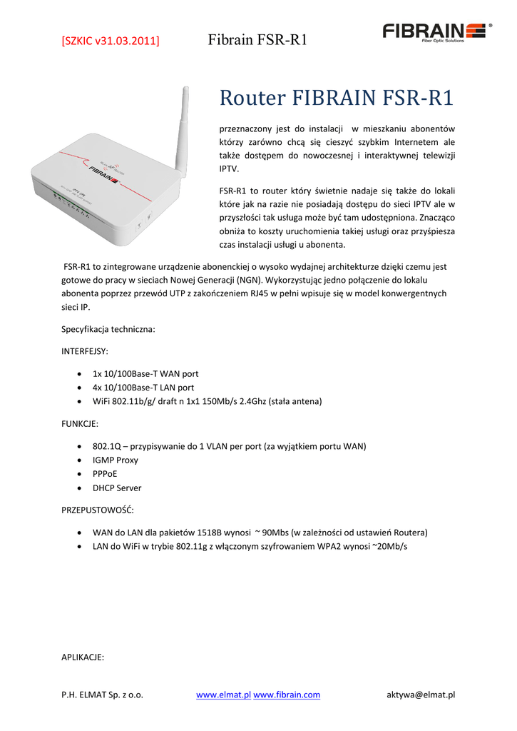 [SZKIC v31.03.2011] Fibrain FSR-R1 Router FIBRAIN FSR-R1 przeznaczony jest do instalacji w mieszkaniu abonentów którzy zarówno chcą się cieszyd szybkim Internetem ale także dostępem do nowoczesnej i interaktywnej telewizji IPTV. FSR-R1 to router który świetnie nadaje się także do lokali które jak na razie nie posiadają dostępu do sieci IPTV ale w przyszłości tak usługa może byd tam udostępniona. Znacząco obniża to koszty uruchomienia takiej usługi oraz przyśpiesza czas instalacji usługi u abonenta. FSR-R1 to zintegrowane urządzenie abonenckiej o wysoko wydajnej architekturze dzięki czemu jest gotowe do pracy w sieciach Nowej Generacji (NGN). Wykorzystując jedno połączenie do lokalu abonenta poprzez przewód UTP z zakooczeniem RJ45 w pełni wpisuje się w model konwergentnych sieci IP. Specyfikacja techniczna: INTERFEJSY: 1x 10/100Base-T WAN port 4x 10/100Base-T LAN port WiFi 802.11b/g/ draft n 1x1 150Mb/s 2.4Ghz (stała antena) FUNKCJE: 802.1Q – przypisywanie do 1 VLAN per port (za wyjątkiem portu WAN) IGMP Proxy PPPoE DHCP Server PRZEPUSTOWOŚĆ: WAN do LAN dla pakietów 1518B wynosi ~ 90Mbs (w zależności od ustawieo Routera) LAN do WiFi w trybie 802.11g z włączonym szyfrowaniem WPA2 wynosi ~20Mb/s APLIKACJE: P.H. ELMAT Sp. z o.o. www.elmat.pl www.fibrain.com [email protected] [SZKIC v31.03.2011] Fibrain FSR-R1 1. Sied ETTH z przełącznikiem zarządzanym wspierającym VLAN-y. 2. Sied GEPON lub GPON z ONT np. 1port FE: KONFIGURACJA VLAN: P.H. ELMAT Sp. z o.o. www.elmat.pl www.fibrain.com [email protected] [SZKIC v31.03.2011] Fibrain FSR-R1 ROUTER WYGLĄD: P.H. ELMAT Sp. z o.o. www.elmat.pl www.fibrain.com [email protected]