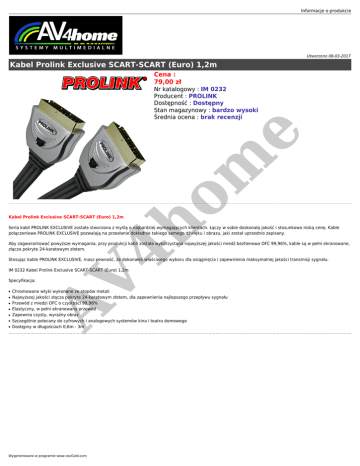 Informacje o produkcie Utworzono 08-03-2017 Kabel Prolink Exclusive SCART-SCART (Euro) 1,2m Cena : 79,00 zł 4h Kabel Prolink Exclusive SCART-SCART (Euro) 1,2m om e Nr katalogowy : IM 0232 Producent : PROLINK Dostępność : Dostępny Stan magazynowy : bardzo wysoki Średnia ocena : brak recenzji Seria kabli PROLINK EXCLUSIVE została stworzona z myślą o najbardziej wymagających klientach. Łączy w sobie doskonałą jakość i stosunkowo niską cenę. Kable połączeniowe PROLINK EXCLUSIVE pozwalają na przesłanie dokładnie takiego samego dźwięku i obrazu, jaki został uprzednio zapisany. Aby zagwarantować powyższe wymagania, przy produkcji kabli została wykorzystana najwyższej jakości miedź beztlenowa OFC 99,96%, kable są w pełni ekranowane, złącza pokryte 24-karatowym złotem. Stosując kable PROLINK EXCLUSIVE, masz pewność, że dokonałeś właściwego wyboru dla osiągnięcia i zapewnienia maksymalnej jakości transmisji sygnału. AV IM 0232 Kabel Prolink Exclusive SCART-SCART (Euro) 1,2m Specyfikacja: ● ● ● ● ● ● ● Chromowane wtyki wykonane ze stopów metali Najwyższej jakości złącza pokryte 24-karatowym złotem, dla zapewnienia najlepszego przepływu sygnału Przewód z miedzi OFC o czystości 99,96% Elastyczny, w pełni ekranowany przewód Zapewnia czysty, wyraźny obraz Szczególnie polecany do cyfrowych i analogowych systemów kina i teatru domowego Dostępny w długościach 0,6m - 3m Wygenerowano w programie www.oscGold.com