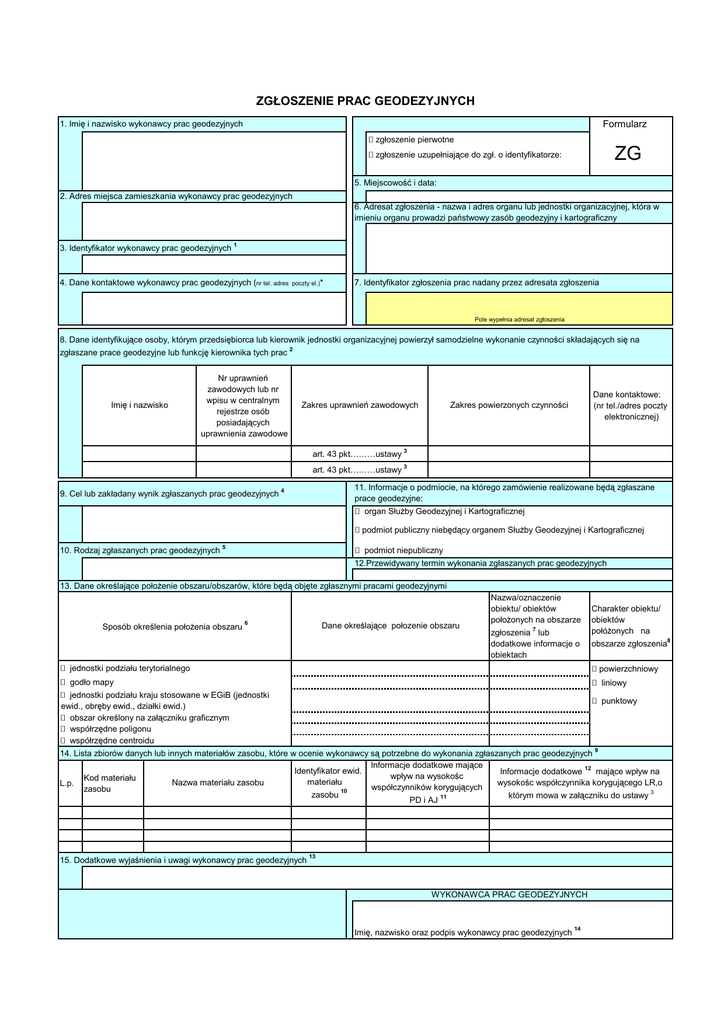 ZGŁOSZENIE PRAC GEODEZYJNYCH 1. Imię i nazwisko wykonawcy prac geodezyjnych Formularz zgłoszenie pierwotne ZG zgłoszenie uzupełniające do zgł. o identyfikatorze: 5. Miejscowość i data: 2. Adres miejsca zamieszkania wykonawcy prac geodezyjnych 6. Adresat zgłoszenia - nazwa i adres organu lub jednostki organizacyjnej, która w imieniu organu prowadzi państwowy zasób geodezyjny i kartograficzny 3. Identyfikator wykonawcy prac geodezyjnych 1 4. Dane kontaktowe wykonawcy prac geodezyjnych (nr tel. adres poczty el.)* 7. Identyfikator zgłoszenia prac nadany przez adresata zgłoszenia Pole wypełnia adresat zgłoszenia 8. Dane identyfikujące osoby, którym przedsiębiorca lub kierownik jednostki organizacyjnej powierzył samodzielne wykonanie czynności składających się na zgłaszane prace geodezyjne lub funkcję kierownika tych prac 2 Imię i nazwisko Nr uprawnień zawodowych lub nr wpisu w centralnym rejestrze osób posiadających uprawnienia zawodowe Zakres uprawnień zawodowych Dane kontaktowe: (nr tel./adres poczty elektronicznej) Zakres powierzonych czynności art. 43 pkt………ustawy 3 art. 43 pkt………ustawy 3 9. Cel lub zakładany wynik zgłaszanych prac geodezyjnych 4 11. Informacje o podmiocie, na którego zamówienie realizowane będą zgłaszane prace geodezyjne: organ Służby Geodezyjnej i Kartograficznej podmiot publiczny niebędący organem Służby Geodezyjnej i Kartograficznej 10. Rodzaj zgłaszanych prac geodezyjnych 5 podmiot niepubliczny 12.Przewidywany termin wykonania zgłaszanych prac geodezyjnych 13. Dane określające położenie obszaru/obszarów, które będą objęte zgłasznymi pracami geodezyjnymi Sposób określenia położenia obszaru 6 Dane określające połozenie obszaru Nazwa/oznaczenie obiektu/ obiektów położonych na obszarze 7 zgłoszenia lub dodatkowe informacje o obiektach jednostki podziału terytorialnego Charakter obiektu/ obiektów połóżonych na obszarze zgłoszenia8 powierzchniowy godło mapy jednostki podziału kraju stosowane w EGiB (jednostki ewid., obręby ewid., działki ewid.) obszar określony na załączniku graficznym współrzędne poligonu współrzędne centroidu liniowy punktowy 14. Lista zbiorów danych lub innych materiałów zasobu, które w ocenie wykonawcy są potrzebne do wykonania zgłaszanych prac geodezyjnych 9 Informacje dodatkowe mające Identyfikator ewid. Informacje dodatkowe 12 mające wpływ na wpływ na wysokośc Kod materiału materiału Nazwa materiału zasobu wysokośc współczynnika korygującego LR,o L.p. współczynników korygujących zasobu zasobu 10 którym mowa w załączniku do ustawy 3 PD i AJ 11 15. Dodatkowe wyjaśnienia i uwagi wykonawcy prac geodezyjnych 13 WYKONAWCA PRAC GEODEZYJNYCH Imię, nazwisko oraz podpis wykonawcy prac geodezyjnych 14 Przypisy 1. Identyfikatorem wykonawcy jest: - w przypadku gdy wykonawcą jest przedsiębiorca lub jednostka organizacyjna - nr REGON; - w przypadku gdy wykonawcą jest biegły sądowy - nr uprawnień zawodowych lub nr wpisu w centralnym rejestrze osób posiadających uprawnienia zawodowe; - w przypadku gdy wykonawcą jest mierniczy górniczy (asystent mierniczego górniczego) - nr świadectwa wydanego przez Prezesa Wyższego Urzędu Górniczego o stwierdzeniu kwalifikacji do wykonywania czynności mierniczego górniczego; - w przypadku wykonawcy będącego podmiotem zagranicznym - nr identyfikacyjny stosowany w kraju, w którym ma siedzibę wykonawca. 2. Należy wypełnić w przypadku, gdy wykonawcą zgłaszanych prac geodezyjnych jest przedsiębiorca lub jednostka organizacyjna. 3. Ustawa z dnia 17 maja 1989 r. - Prawo geodezyjne i kartograficzne (Dz. U. z 2010 r. Nr 193, poz. 1287, z późn. zm.). 4. Należy wpisać cel/cele lub zakładany wynik/zakładane wyniki pracy wybrany/wybrane z listy stanowiącej załącznik nr 1 do niniejszego wzoru. 5. Należy wpisać rodzaj pracy wybrany z listy stanowiącej załącznik nr 2 do niniejszego wzoru. 6. Należy wybrać jeden sposób określenia obszaru. 7. Nazwa/nazwy lub oznaczenie/oznaczenia obiektu/obiektów nadane przez wykonawcę prac geodezyjnych - informacja nieobowiązkowa. 8. Dla konkretnego obiektu można wybrać tylko jeden atrybut opisujący jego charakter. 9. Kod materiału zasobu oraz nazwę materiału zasobu należy wpisać z listy stanowiącej załącznik nr 3 do niniejszego wzoru. 10.Informacja obowiązkowa w przypadku udostępniania materiałów zasobu za pomocą systemu teleinformatycznego, o którym mowa w przepisach wydanych na podstawie 11. Należy wskazać informacje mające wpływ na wysokość współczynników korygujących PD i AJ określonych w załączniku do ustawy, takie jak: wydruk czarno-bialy/koloro 12. W kolumnie tej można w szczególności określić żądaną lub przybliżoną (oczekiwaną) liczbę jednostek rozliczeniowych związanych z określonym rodzajem materiału zas 13. W przypadku biegłych sądowych należy wskazać sygnaturę akt sprawy, w której wykonawca został ustanowiony biegłym sądowym. W polu tym można również ć 14. Podpis odręczny, podpis elektroniczny, o którym mowa w art. 3 pkt 1 ustawy z dnia 18 września 2001 r. o podpisie elektronicznym (Dz. U. z 2013 r. poz. 262), bezpieczny identyfikator umożliwiający weryfikację wykonawcy w tym systemie. * Informacja nieobowiązkowa. Wyjaśnienia: 1. Formularze drukowane nie muszą uwzględniać oznaczeń kolorystycznych. 2. Pola formularza można rozszerzać w zależności od potrzeb. W przypadku wypełniania formularza w postaci papierowej formularz może być uzupełniany załącznikami zawierającymi informacje, których nie można było zamieścić w formularzu. Załącznik nr 1 do formularza zgłoszenia prac geodezyjnych Cel lub zakładany wynik pracy Powiatowy zasób geodezyjny i kartograficzny 1) założenie ewidencji gruntów i budynków (EGiB) 2) modernizacja ewidencji gruntów i budynków (EGiB) 3) aktualizacja ewidencji gruntów i budynków (EGiB) 4) utworzenie bazy danych ge