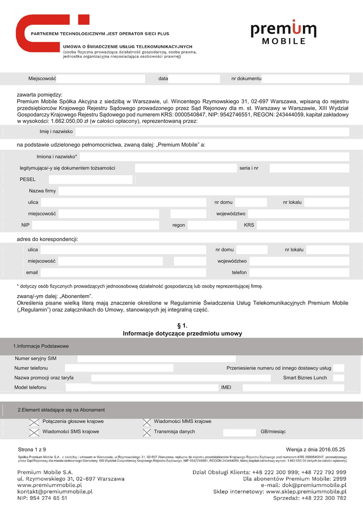 Miejscowość data nr dokumentu zawarta pomiędzy: Premium Mobile Spółka Akcyjna z siedzibą w Warszawie, ul. Wincentego Rzymowskiego 31, 02-697 Warszawa, wpisaną do rejestru przedsiębiorców Krajowego Rejestru Sądowego prowadzonego przez Sąd Rejonowy dla m. st. Warszawy w Warszawie, XIII Wydział Gospodarczy Krajowego Rejestru Sądowego pod numerem KRS: 0000540847, NIP: 9542746551, REGON: 243444059, kapitał zakładowy w wysokości: 1.662.050,00 zł (w całości opłacony), reprezentowaną przez: Imię i nazwisko na podstawie udzielonego pełnomocnictwa, zwaną dalej: „Premium Mobile” a: Imiona i nazwisko* legitymująca/-y się dokumentem tożsamości seria i nr PESEL Nazwa firmy ulica nr domu województwo miejscowość NIP nr lokalu regon KRS adres do korespondencji: ulica nr domu nr lokalu województwo miejscowość email telefon * dotyczy osób fizycznych prowadzących jednoosobową działalność gospodarczą lub osoby reprezentującej firmę. zwaną/-ym dalej: „Abonentem”. Określenia pisane wielką literą mają znaczenie określone w Regulaminie Świadczenia Usług Telekomunikacyjnych Premium Mobile („Regulamin”) oraz załącznikach do Umowy, stanowiących jej integralną część. § 1. Informacje dotyczące przedmiotu umowy 1.Informacje Podstawowe Numer seryjny SIM Przeniesienie numeru od innego dostawcy usług Numer telefonu Nazwa promocji oraz taryfa Smart Biznes Lunch Model telefonu IMEI 2.Element składające się na Abonament Połączenia głosowe krajowe Wiadomości MMS krajowe Wiadomości SMS krajowe Transmisja danych Strona 1 z 9 GB/miesiąc Wersja z dnia 2016.05.25 3.Umowa zostaje zawarta na czas Oznaczony miesięcy na okres Nieoznaczony 4.Abonament, rabaty, opusty i inne opłaty Kwota bez VAT Kwota z VAT Abonament podstawowy (miesięcznie) Rabat podstawowy na Abonament (miesięcznie) Opust za E-Rachunek (miesięcznie) Opust za zgody marketingowe (miesięcznie) Wysokość Abonamentu po uwzględnieniu rabatu podstawowego oraz opustu/ów Smart Biznes Lunch (opłata jednorazowa) Opłata Aktywacyjna po rabacie zł brutto Łączna wysokość udzielonych Ulg oraz Benefitów zł W tym: Ulga na Opłatę Aktywacyjną zł Wartość otrzymanych Benefitów zł zł Ulga na Abonament Abonament, inne opłaty, w tym za usługi dodatkowe aktywowane przez Abonenta, a także Ulgi i opusty podane są w Cenniku oraz Regulaminie Promocji, które stanowią Załączniki do Umowy. limit kredytowy zł / słownie: kaucja zł / słownie: 5.Okres rozliczeniowy od rozpoczyna się dnia miesiąca do dnia miesiąca, przy czym pierwszy Okres Rozliczeniowy i kończy się w dniu § 2. PRZEDMIOT UMOWY Na podstawie Umowy Premium Mobile zobowiązuje się do świadczenia na rzecz Abonenta Usług Premium Mobile wskazanych w § 1 pkt 2 powyżej, a Abonent zobowiązuje się do uiszczania opłat za te usługi. §3 TERMIN ROZPOCZĘCIA ŚWIADCZENIA USŁUG PREMIUM MOBILE ORAZ MINIMALNY OKRES WYMAGANY DO SKORZYSTANIA Z WARUNKÓW PROMOCYJNYCH 1. Premium Mobile zobowiązuje się rozpocząć świadczenie Usług Premium Mobile, w tym dokonać przyłączenia do Sieci Operatora, w terminie 15 dni od dnia zawarcia Umowy. 2. W przypadku Umowy zawartej na czas oznaczony, czas oznaczony, na jaki została zawarta Umowa, wskazany w § 1 pkt 3 powyżej, jest minimalnym okresem wymaganym do skorzystania z warunków promocyjnych. Powyższe nie zmienia warunków płatności określonych w Umowie, Regulaminie i innych załącznikach do Umowy. Strona 2 z 9 Wersja z dnia 2016.05.25 1. 2. 3. 4. a) b) c) d) 5. §4 OBOWIĄZYWANIE UMOWY Okres obowiązywania Umowy wskazany jest w § 1 pkt 3 powyżej. Jeżeli Umowa została zawarta na czas określony, po upływie czasu, na jaki została ona zawarta, Umowa ulega przedłużeniu na czas nieokreślony, chyba że Abonent nie później niż na 30 dni przed upływem czasu określonego, na jaki została zawarta Umowa, zawiadomi Premium Mobile na piśmie, że nie zamierza korzystać z Usług Premium Mobile. W przypadku, o którym mowa w ust. 2 powyżej, Umowa przedłuża się zgodnie z warunkami obowiązującymi w ostatnim Okresie Rozliczeniowym obowiązywania Umowy przed upływem terminu, na jaki została zawarta, a Abonent będzie zobowiązany do ponoszenia Abonamentu w wysokości obowiązującej w ostatnim Okresie Rozliczeniowym obowiązywania Umowy przed upływem terminu, na jaki została zawarta. Umowa wygasa: z upływem okresu, na jaki została zawarta, jeżeli nie została przedłużona zgodnie z ust. 2 powyżej, z chwilą śmierci Abonenta będącego osobą fizyczną, z chwilą ustania bytu prawnego Abonenta niebędącego osobą fizyczną, chyba że inny podmiot lub inne podmioty są sukcesorami uniwersalnymi Abonenta, w szczególności na skutek połączenia Abonenta z innym podmiotem, lub podziału Abonenta, z chwilą utraty przez Premium Mobile uprawnień do świadczenia Usług Premium Mobile lub zaprzestania prowadzenia działalności przez Premium Mobile. Z chwilą zaistnienia jednej z okoliczności wymienionych w ust. 4 powyżej, Premium Mobile ma prawo do zaprzestania świadczenia na rzecz Abonenta Usług Premium Mobile. §5 ROZWIĄZANIE UMOWY 1. Premium Mobile może rozwiązać Umowę: 1/ ze skutkiem natychmiastowym bez zachowania okresu wypowiedzenia: a. w przypadku zaistnienia Siły Wyższej lub innych nadzwyczajnych zdarzeń niezależnych od Premium Mobile, które uniemożliwiają świadczenie Usług Premium Mobile - bez dodatkowego wezwania Abonenta, b. w przypadku wykrycia na Karcie SIM Nadużycia Telekomunikacyjnego, w tym generowania Sztucznego Ruchu, podejmowania działań zakłócających lub powodujących nieprawidłowe funkcjonowanie Sieci Operatora, używania Adapterów lub Kart SIM aktywowanych w Adapterach, wykorzystywania Karty SIM do wykonywania masowych połączeń telefonicznych, w tym w ramach działalności tzw. „call center” lub do kierowania wiadomości SMS lub MMS o podobnej treści do wielu osób w celach związanych z zaspokajaniem zarob