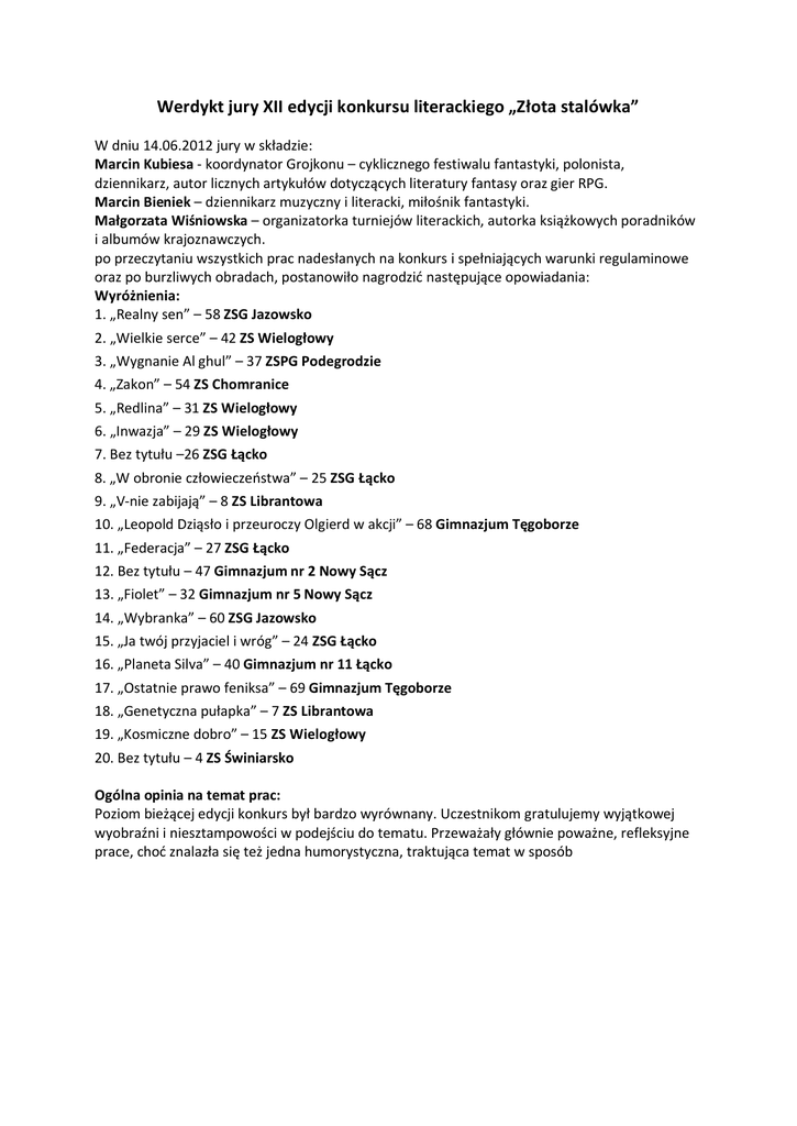 Werdykt jury XII edycji konkursu literackiego „Złota stalówka” W dniu 14.06.2012 jury w składzie: Marcin Kubiesa - koordynator Grojkonu – cyklicznego festiwalu fantastyki, polonista, dziennikarz, autor licznych artykułów dotyczących literatury fantasy oraz gier RPG. Marcin Bieniek – dziennikarz muzyczny i literacki, miłośnik fantastyki. Małgorzata Wiśniowska – organizatorka turniejów literackich, autorka książkowych poradników i albumów krajoznawczych. po przeczytaniu wszystkich prac nadesłanych na konkurs i spełniających warunki regulaminowe oraz po burzliwych obradach, postanowiło nagrodzić następujące opowiadania: Wyróżnienia: 1. „Realny sen” – 58 ZSG Jazowsko 2. „Wielkie serce” – 42 ZS Wielogłowy 3. „Wygnanie Al ghul” – 37 ZSPG Podegrodzie 4. „Zakon” – 54 ZS Chomranice 5. „Redlina” – 31 ZS Wielogłowy 6. „Inwazja” – 29 ZS Wielogłowy 7. Bez tytułu –26 ZSG Łącko 8. „W obronie człowieczeństwa” – 25 ZSG Łącko 9. „V-nie zabijają” – 8 ZS Librantowa 10. „Leopold Dziąsło i przeuroczy Olgierd w akcji” – 68 Gimnazjum Tęgoborze 11. „Federacja” – 27 ZSG Łącko 12. Bez tytułu – 47 Gimnazjum nr 2 Nowy Sącz 13. „Fiolet” – 32 Gimnazjum nr 5 Nowy Sącz 14. „Wybranka” – 60 ZSG Jazowsko 15. „Ja twój przyjaciel i wróg” – 24 ZSG Łącko 16. „Planeta Silva” – 40 Gimnazjum nr 11 Łącko 17. „Ostatnie prawo feniksa” – 69 Gimnazjum Tęgoborze 18. „Genetyczna pułapka” – 7 ZS Librantowa 19. „Kosmiczne dobro” – 15 ZS Wielogłowy 20. Bez tytułu – 4 ZS Świniarsko Ogólna opinia na temat prac: Poziom bieżącej edycji konkurs był bardzo wyrównany. Uczestnikom gratulujemy wyjątkowej wyobraźni i niesztampowości w podejściu do tematu. Przeważały głównie poważne, refleksyjne prace, choć znalazła się też jedna humorystyczna, traktująca temat w sposób karykaturalny. Jury chciałoby przekazać jedną sugestię do wszystkich uczestników konkursu: po napisaniu opowiadania czy wiersza warto go poprawiać, poprawiać i jeszcze raz poprawiać. Żadna dobra praca nie rodzi się tylko z natchnienia. Dobre pisarstwo wymaga nie tylko wyjątkowej wyobraźni, ale też ciężkiej pracy. Główne nagrody: 1. Nagroda „Ostatni świadomy” 16 ZS Wielogłowy Doskonały koncept, bogaty język, wyjątkowo spójne prowadzenie narracji, liczne naukowe szczegóły, czynią „Ostatniego świadomego” nieoszlifowanym diamentem wśród prac. Nieoszlifowanym, bo należałoby jeszcze dopracować dialogi. Już od początku opowiadanie trzyma w napięciu, a jego dynamika utrzymuje się do ostatniego zdania, które nie pozostawia wątpliwości: „Wystrzeliłem”. 2. Nagroda „Równoległy świat?” 39 Gimnazjum nr 11 Nowy Sącz W opowiadaniu „Równoległy świat?” urzekła nas pomysłowość z jaką autor opisuje swoją historię. Autor dobrze radzi sobie ze spójnym konstruowaniem fabuły, która trzyma w napięciu od początku do końca. Najciekawszym punktem opowiadania są dialogi – zarówno narracja jak i rozmowy między bohaterami ciekawie wzajemnie się uzupełniały. 3. Nagroda „O chłopcu, który ocalił pół Wszechświata” 17 ZS Wielogłowy W przypadku tego opowiadania zaskoczyła nas bogata wyobraźnia autora, który nie tylko wymyślił interesującą historię, ale także stworzył do niej własny odrębny świat. I chociaż opowiadanie rządzi się swoimi prawami i nie pozwala na zbytnie rozpisywanie się w szczegółach, autor tego tekstu zdołał nas zaciekawić swoim obrazem wszechświata.
