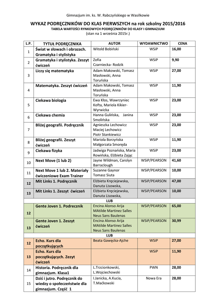 Gimnazjum im. ks. W. Rabczyńskiego w Wasilkowie WYKAZ PODRĘCZNIKÓW DO KLAS PIERWSZYCH na rok szkolny 2015/2016 TABELA WARTOŚCI RYNKOWYCH PODRĘCZNIKÓW DO KLASY I GIMNAZJUM (stan na 1 września 2015r.) L.P. 1 2 TYTUŁ PODRĘCZNIKA Świat w słowach i obrazach. Gramatyka i stylistyka Gramatyka i stylistyka. Zeszyt ćwiczeń Liczy się matematyka 3 Matematyka. Zeszyt ćwiczeń 4 Ciekawa biologia 5 6 Ciekawa chemia Bliżej geografii. Podręcznik 7 9 Bliżej geografii. Zeszyt ćwiczeń Ciekawa fizyka 10 Next Move (1 lub 2) 8 12 Next Move 1 lub 2. Materiały ćwiczeniowe Exam Trainer Mit Links 1. Podręcznik 13 Mit Links 1. Zeszyt ćwiczeń 11 Gente Joven 1. Podrecznik 12 13 12 13 14 15 Gente Joven 1. Zeszyt ćwiczeń Echo. Kurs dla początkujących Echo. Kurs dla początkujących. Zezyt ćwiczeń Historia. Podręcznik dla gimnazjum. Klasa1 Dziś i jutro. Podręcznik do wiedzy o społeczeństwie dla gimnazjum. Część 1 AUTOR Witold Bobiński Zofia Czarniecka- Rodzik Adam Makowski, Tomasz Masłowski, Anna Toruńska Adam Makowski, Tomasz Masłowski, Anna Toruńska Ewa Kłos, Wawrzyniec Kofta, Mariola KikierWyrwicka Hanna Gulińska, Janina Smolińska Agnieszka Lechowicz Maciej Lechowicz Piotr Stankiewicz Mariola Borzyńska Małgorzata Smoręda Jadwiga Poznańska, Maria Rowińska, Elżbieta Zając Jayne Wildman, Carolyn Barraclough Suzanne Gaynor Tomasz Siuta Elżbieta Kręciejewska, Danuta Lisowska, Elżbieta Kręciejewska, Danuta Lisowska, LUB Encina Alonso Arija MAtilde Martinez Salles Neus Sans Baulenas Encina Alonso Arija MAtilde Martinez Salles Neus Sans Baulenas LUB Beata Gawęcka-Ajche L.Trzcionkowski, L.Wojciechowski I.Janicka, A.Kucia, T.Maćkowski WYDAWNICTWO CENA WSiP 16,00 WSiP 9,90 WSiP 27,00 WSiP 11,90 WSiP 23,00 WSiP 23,00 WSiP 23,00 WSiP 11,90 WSiP 23,00 WSiP/PEARSON 41,60 WSiP/PEARSON 10,00 WSiP/PEARSON 47,00 WSiP/PEARSON 10,00 WSiP/PEARSON 65,00 WSiP/PEARSON 30,99 WSiP 27,00 WSiP 11,90 PWN 28,00 Nowa Era 28,00