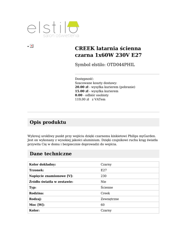 CREEK latarnia ścienna czarna 1x60W 230V E27 ● Symbol elstilo: OTD044PHIL Dostępność: Szacowane koszty dostawy: 20.00 zł - wysyłka kurierem (pobranie) 15.00 zł - wysyłka kurierem 0.00 - odbiór osobisty 119,00 zł z VATem Opis produktu Wykreuj urokliwy punkt przy wejściu dzięki czarnemu kinkietowi Philips myGarden. Jest on wykonany z wysokiej jakości aluminium. Dzięki czujnikowi ruchu krąg światła przywita Cię w domu i bezpiecznie doprowadzi do wejścia. Dane techniczne Kolor dokładny: Czarny Trzonek: E27 Napięcie znamionowe [V]: 230 Źródło światła w zestawie: Nie Typ: Ścienne Rodzina: Creek Rodzaj: Zewnętrzne Moc [W]: 60 Kolor: Czarny