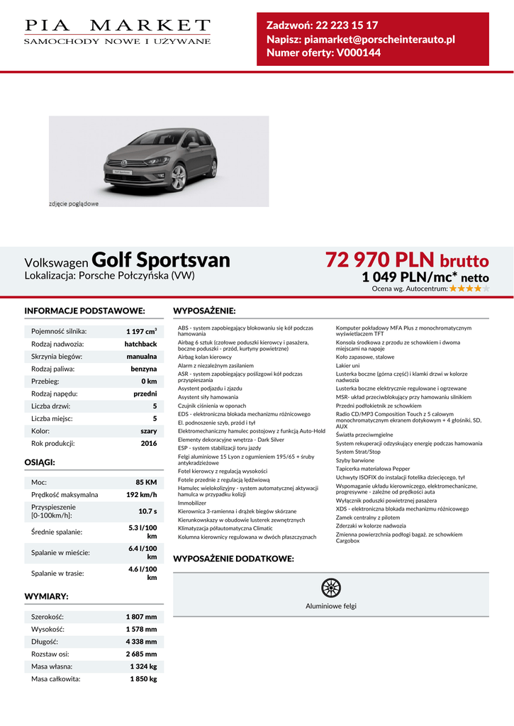 Zadzwoń: 22 223 15 17 Napisz: [email protected] Numer oferty: V000144 Volkswagen Golf Sportsvan 72 970 PLN brutto 1 049 PLN/mc* netto Lokalizacja: Porsche Połczyńska (VW) Ocena wg. Autocentrum: INFORMACJE PODSTAWOWE: WYPOSAŻENIE: Pojemność silnika: 1 197 cm3 ABS - system zapobiegający blokowaniu się kół podczas hamowania Komputer pokładowy MFA Plus z monochromatycznym wyświetlaczem TFT Rodzaj nadwozia: hatchback Airbag 6 sztuk (czołowe poduszki kierowcy i pasażera, boczne poduszki - przód, kurtyny powietrzne) Konsola środkowa z przodu ze schowkiem i dwoma miejscami na napoje Skrzynia biegów: manualna Airbag kolan kierowcy Koło zapasowe, stalowe Alarm z niezależnym zasilaniem Lakier uni ASR - system zapobiegający poślizgowi kół podczas przyspieszania Lusterka boczne (górna część) i klamki drzwi w kolorze nadwozia Asystent podjazdu i zjazdu Lusterka boczne elektrycznie regulowane i ogrzewane Asystent siły hamowania MSR- układ przeciwblokujący przy hamowaniu silnikiem Czujnik ciśnienia w oponach Przedni podłokietnik ze schowkiem EDS - elektroniczna blokada mechanizmu różnicowego Radio CD/MP3 Composition Touch z 5 calowym monochromatycznym ekranem dotykowym + 4 głośniki, SD, AUX Rodzaj paliwa: Przebieg: Rodzaj napędu: Liczba drzwi: Liczba miejsc: benzyna 0 km przedni 5 5 Kolor: szary Rok produkcji: 2016 Prędkość maksymalna Przyspieszenie [0-100km/h]: Elektromechaniczny hamulec postojowy z funkcją Auto-Hold Elementy dekoracyjne wnętrza - Dark Silver 85 KM 192 km/h 10.7 s Średnie spalanie: 5.3 l/100 km Spalanie w mieście: 6.4 l/100 km Spalanie w trasie: 4.6 l/100 km Światła przeciwmgielne System rekuperacji odzyskujący energię podczas hamowania ESP - system stabilizacji toru jazdy Felgi aluminiowe 15 Lyon z ogumieniem 195/65 + śruby antykradzieżowe OSIĄGI: Moc: El. podnoszenie szyb, przód i tył System Strat/Stop Szyby barwione Fotel kierowcy z regulacją wysokości Tapicerka materiałowa Pepper Fotele przednie z regulacją lędźwiową Uchwyty ISOFIX do instalacji fotelika dziecięcego, tył Hamulec wielokolizyjny - system automatycznej aktywacji hamulca w przypadku kolizji Wspomaganie układu kierowniczego, elektromechaniczne, progresywne - zależne od prędkości auta Immobilizer Wyłącznik poduszki powietrznej pasażera Kierownica 3-ramienna i drążek biegów skórzane XDS - elektroniczna blokada mechanizmu różnicowego Kierunkowskazy w obudowie lusterek zewnętrznych Zamek centralny z pilotem Klimatyzacja półautomatyczna Climatic Zderzaki w kolorze nadwozia Kolumna kierownicy regulowana w dwóch płaszczyznach Zmienna powierzchnia podłogi bagaż. ze schowkiem Cargobox WYPOSAŻENIE DODATKOWE: WYMIARY: Aluminiowe felgi Szerokość: 1 807 mm Wysokość: 1 578 mm Długość: 4 338 mm Rozstaw osi: 2 685 mm Masa własna: 1 324 kg Masa całkowita: 1 850 kg BEZPIECZEŃSTWO: ABS - system zapobiegający blokowaniu się kół podczas hamowania Airbag 6 sztuk (czołowe poduszki kierowcy i pasażera, boczne poduszki przód, kurtyny powietrzne) Airbag kolan kierowcy ESP - system stabilizacji toru jazdy Wyłącznik poduszki powietrznej pasażera *Rata leasingu Niniejsza informacja oraz kalkulacja dotyczy produktów Porsche Inter Auto Polska Sp. z o.o. Niniejsza informacja nie stanowi oferty w rozumieniu kodeksu cywilnego. Kalkulacja ma jedynie charakter poglądowy i szacunkowy, oparta jest na wskazanych powyżej założeniach; zarówno wskazana cena produktu, jak i wyliczona rata leasingowa mogą ulec zmianie. Informacja nie stanowi gwarancji dostępności produktu. Ostateczne warunki, w tym cenę i wysokość raty leasingowej, określa umowa. Oferta ma charakter informacyjny, nie stanowi oferty handlowej w rozumieniu Art. 66. § 1 Kodeksu Cywilnego.