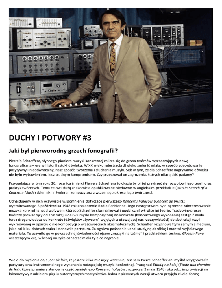DUCHY I POTWORY #3 Jaki był pierworodny grzech fonografii? Pierre'a Schaeffera, słynnego pioniera muzyki konkretnej zalicza się do grona twórców wyznaczających nową – fonograficzną – erę w historii sztuki dźwięku. W XX wieku rejestracja dźwięku zmienić miała, w sposób zdecydowanie pozytywny i nieodwracalny, nasz sposób tworzenia i słuchania muzyki. Sęk w tym, że dla Schaeffera nagrywanie dźwięku nie było wybawieniem, lecz trudnym kompromisem. Czy przeczuwał on zagrożenia, których ofiarą dziś padamy? Przypadająca w tym roku 20. rocznica śmierci Pierre'a Schaeffera to okazja by bliżej przyjrzeć się rozwojowi jego teorii oraz praktyk twórczych. Temu celowi służą znakomicie opublikowane niedawno w angielskim przekładzie (jako In Search of a Concrete Music) dzienniki inżyniera i kompozytora z wczesnego okresu jego twórczości. Odnajdujemy w nich oczywiście wspomnienia dotyczące pierwszego Koncertu hałasów (Concert de bruits), wyemitowanego 5 października 1948 roku na antenie Radia Parisienne. Jego następstwem było ogromne zainteresowanie muzyką konkretną, pod wpływem którego Schaeffer sformalizował i upublicznił wkrótce jej teorię. Tradycyjny proces twórczy prowadzący od abstrakcji (idei w umyśle kompozytora) do konkretu (koncertowego wykonania) zastąpić miała teraz droga wiodąca od konkretu (dźwięków „żywcem” wyjętych z otaczającej nas rzeczywistości) do abstrakcji (czyli wykreowanej w oparciu o nie kompozycji o właściwościach akuzmatycznych). Schaeffer rezygnował tym samym z medium, jakie od kilku dobrych stuleci stanowiła partytura. Za ogniwo pośrednie uznał studyjną obróbkę i montaż wyjściowego materiału. To uczyniło go w powszechnej świadomości ojcem „muzyki na taśmę” i pradziadkiem techno. Głosem Pana wieszczącym erę, w której muzyka oznaczać miała tyle co nagranie. Wiele do myślenia daje jednak fakt, że jeszcze kilka miesięcy wcześniej ten sam Pierre Schaeffer ani myślał rezygnować z partytury oraz instrumentalnego wykonania rodzącej się muzyki konkretnej. Pracę nad Etiudą na kolej (Étude aux chemins de fer), której premiera stanowiła część pamiętnego Koncertu hałasów, rozpoczął 3 maja 1948 roku od... improwizacji na lokomotywy z udziałem pięciu autentycznych maszynistów. Jedna z pierwszych wersji utworu przyjęła z kolei formę graficznego zapisu z ośmioma niemal tradycyjnymi systemami. Istnieje oczywiście możliwość, że pomiędzy majem a październikiem przełomowego roku Schaeffer dokonał rewolucyjnego zwrotu w kierunku swoich poszukiwań. Niemniej prawdopodobne wydaje się jednak, że myślenie o kompozycji konkretnej jako o przeznaczonym do wielokrotnego odtwarzania, zamkniętym nagraniu zdeterminowała po prostu specyfika radiowego medium, lecz także, a może przede wszystkim, kapitulacja twórcy w kampanii o adekwatne narzędzie do koncertowego wykonywania muzyki konkretnej. W 1948 roku Pierre'owi Scahefferowi marzył się jeszcze najogólniejszy możliwy instrument lub po prostu najogólniejszy możliwy fortepian. Ten ostatni termin wynikał zapewne z fascynacji fortepianem preparowanym (wedle jego terminologii – konkretnym). Jeszcze 4 czerwca pisał: „Dotychczasowe zabiegi przekonały mnie w zasadzie, że ten instrument zastąpić może wszystkie studyjne efekty”. I dodawał z rozczarowaniem, że obciążeniem fortepianu pozostaje tradycyjny, rytmiczny i melodyczny, sposób gry. Jak zatem mógł wyglądać wymarzony instrument Schaeffera? Kompozytor przekonany był, że źródło dźwięku stanowiłyby w nim gramofony (jeszcze nie magnetofony), których liczba sięgać musiałaby nawet dwunastu tuzinów. Czy to możliwe? „Wyobraźmy sobie organy, których każdy klawisz powiązany jest z jednym gramofonem wyposażonym w odpowiednią płytę; załóżmy, że klawiatura tych organów uruchamiałaby gramofony jednocześnie lub po kolei, w konkretnym momencie i na określony odcinek czasu […] Na razie instrument istnieje tylko w mojej wyobraźni, ale w dużym stopniu ów projekt dałoby się zrealizować” - uważał Schaeffer jeszcze w kwietniu 1948 roku. Radiowy Koncert hałasów świadczyć może o tym, że następne pół roku eksperymentów kazało mu w to zwątpić. Pytaniem otwartym pozostaje, czy kolejnym pokoleniom muzyków, konstruktorów,inżynierów oraz informatyków udało się zbliżyć do ideału najogólniejszego możliwego instrumentu. Pewne jest natomiast, że Schaefferowski kompromis ukierunkował w znacznym stopniu rozwój muzyki artystycznej i użytkowej w nadchodzących dekadach, przenosząc świątynie muzyki z sal koncertowych do studiów nagraniowych. Prawie nikt już nie postrzegał nagrywania jako koniecznego, choć niedoskonałego narzędzia w procesie kreacji oraz odbioru muzyki. Uczyniono z niego istotę oraz główny fetysz nowych praktyk dźwiękowych. Listę nieporozumień, przesądów i życzeniowych przekonań, które narosły wokół mitologii nagrywania, trudno byłoby zmieścić w ramach publicystycznego tekstu. Najistotniejsza wydaje się dosyć powszechna – a osiągająca kuriozalny wymiar w kręgach audiofilskich – wiara, że fonografia umożliwia uchwycenie, przetrzymywanie i ożywienie każdego dźwięku w jego obiektywnej akustycznej naturze. Ułudę tego marzenia demaskuje efektowny proceder „wysyłania w kosmos” ziemskiej muzyki oraz innego rodzaju fenomenów akustycznych. Nawet jeśli miedziane płyty wystrzelone w przestrzeń pozaziemską w ramach programu Voyager trafiłyby w ręce inteligentnych istot, można powątpiewać, że tym ostatnim dane będzie kiedykolwiek usłyszeć II Koncert brandenburski Bacha, Mozartowską arię Królowej Nocy, jawajski gamelan czy Johnny B. Goode Chucka Berry'ego. I nie chodzi tylko o odpowiednie narzędzia do odtworzenia płyt, które może i dałoby się zrekonstruować w oparciu o załączone instrukcje. Dodatkowo nasi gwiezdni odbiorcy musi