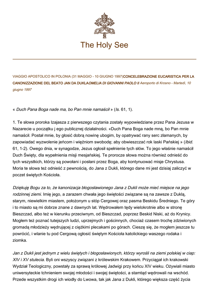 The Holy See VIAGGIO APOSTOLICO IN POLONIA (31 MAGGIO - 10 GIUGNO 1997)CONCELEBRAZIONE EUCARISTICA PER LA CANONIZZAZIONE DEL BEATO JAN DA DUKLAOMELIA DI GIOVANNI PAOLO II Aeroporto di Krosno - Martedì, 10 giugno 1997 « Duch Pana Boga nade ma, bo Pan mnie namaścił » (Is. 61, 1). 1. Te słowa proroka Izajasza z pierwszego czytania zostały wypowiedziane przez Pana Jezusa w Nazarecie u początku j ego publicznej działalności. «Duch Pana Boga nade mną, bo Pan mnie namaścił. Postał mnie, by głosić dobrą nowinę ubogim, by opatrywać rany serc złamanych, by zapowiadać wyzwolenie jeńcom i więźniom swobodę; aby obwieszczać rok laski Pańskiej » (Ibid. 61, 1-2). Owego dnia, w synagodze, Jezus ogłosił spełnienie tych słów. To jego właśnie namaścił Duch Święty, dla wypełnienia misji mesjańskiej. Te prorocze słowa można również odnieść do tych wszystkich, którzy są powołani i posłani przez Boga, aby kontynuować misje Chrystusa. Moria te słowa też odnieść z pewnością, do Jana z Dukli, którego dane mi jest dzisiaj zaliczyć w poczet świętych Kościoła. Dziękuję Bogu za to, że kanonizacja błogosławionego Jana z Dukli może mieć miejsce na jego rodzinnej ziemi. Imię jego, a zarazem chwała jego świętości związane są na zawsze z Duklą, starym, niewielkim miastem, położonym u stóp Cergowej oraz pasma Beskidu Średniego. Te góry i to miasto są mi dobrze znane z dawnych lat. Wędrowałem tędy wielokrotnie albo w stronę Bieszczad, albo też w kierunku przeciwnym, od Bieszczad, poprzez Beskid Niski, aż do Krynicy. Mogłem też poznać tutejszych ludzi, uprzejmych i gościnnych, chociaż czasem trochę zdziwionych gromadą młodzieży wędrującej z ciężkimi plecakami po górach. Cieszę się, że mogłem jeszcze tu powrócić, i wlanie tu pod Cergową ogłosić świętym Kościoła katolickiego waszego rodaka i ziomka. Jan z Dukli jest jednym z wielu świętych i błogosławionych, którzy wyrośli na ziemi polskiej w ciap: XIV i XV stulecia. Byli oni wszyscy związani z królewskim Krakowem. Przyciągał ich krakowski Wydział Teologiczny, powstały za sprawą królowej Jadwigi przy końcu XIV wieku. Ożywiali miasto uniwersyteckie tchnieniem swojej młodości i swojej świętości, a stamtąd wędrowali na wschód. Przede wszystkim drogi ich wiodły do Lwowa, tak jak Jana z Dukli, którego większa część życia 2 upłynęła w tym wielkim mieście i ośrodku złączonym z Polską bardzo bliskimi więzami zwłaszcza od czasów Kazimierza Wielkiego. Jest św. Jan z Dukli patronem miasta Lwowa i całej lwowskiej ziemi. Poprzez swoją kanonizację będzie już na zawsze związany nie tylko z miastem, gdzie ta kanonizacja się odbywa - z Krosnem nad Wisłokiem, ale także z Przemyślem i z archidiecezją przemyską, której pasterza, arcybiskupa Józefa Michalika, witam serdecznie. Wraz z nim witam jego poprzednika, arcybiskupa Ignacego Tokarczuka, którego imię wpisało się w sposób szczególny w dzieje współczesnego Kościoła w Polsce. Kościół w Polsce nie może zapomnieć jego wielkiej odwagi w okresie rządów komunistycznych, a przede wszystkim tej determinacji, jaką wykazał w zmaganiach się o wznoszenie potrzebnych Kościołowi w Polsce budowli sakralnych. Raduję się, że przy tej okazji dane mi jest raz jeszcze spotkać księdza arcybiskupa, z którym wiele runie łączyło w okresie, kiedy byłem metropolitą krakowskim. Serdecznie pozdrawiam długoletniego biskupa pomocniczego, dzisiaj 1486 seniora biskupa Bolesława, oraz obecnego biskupa pomocniczego metropolity przemyskiego biskupa Stefana. Cieszę się z obecności metropolity Iwana Martyniaka i biskupów obrządku greckokatolickiego. W szczególny sposób raduję się obecnością arcybiskupa Mariana Jaworskiego ze Lwowa, ze Lwowa, w którym sic urodził i wychował, a do którego powrócił jako pasterz odradzającego się Kościoła -- do tego miasta słusznie nazywanego semper fidelis. Pozdrawiam wszystkich biskupów metropolii przemyskiej i lwowskiej, a także obecnych licznie kapłanów diecezjalnych i zakonnych, siostry zakonne i was, umiłowani bracia i siostry, mieszkańcy tej ziemi, która mnie tak wiele razy gościła i którą kocham całym sercem. Wszyscy radujemy się z obecności biskupów-władyków Kościoła wschodniego, zarówno katolików, jak i prawosławnych, razem z ich kapłanami, zakonami i wiernymi. Radujemy się wreszcie z obecności gości zagranicznych, których już na początku arcybiskup przemyski pozdrowił. 2. Kiedy dziś dokonujemy kanonizacji Jana z Dukli, wypada nam spojrzeć na powołanie tego duchowego syna św. Franciszka i na jego posłannictwo w szerszym kontekście dziejów. Oto Polska już cztery wieki wcześniej przyjęła chrześcijaństwo. Prawie czterysta lat minęło od czasu, kiedy działał w Polsce św. Wojciech. Kolejne stulecia naznaczone byty męczeństwem św. Stanisława, dalszym postępem ewangelizacji i rozwojem Kościoła na naszych ziemiach. Było to związane w znacznej mierze z działalnością benedyktynów. Począwszy od XIII wieku przybywają do Polski synowie św. Franciszka z Asyżu. Ruch franciszkański znalazł ria naszych ziemiach bardzo podatny grunt, zaowocował też całym szeregiem świętych i błogosławionych, którzy czerpiąc ze wzoru Biedaczyny z Asyżu ożywiali polskie chrześcijaństwo duchem ubóstwa i braterskiej miłości. Z tradycją ewangelicznego ubóstwa i prostoty życia łączyli wiedzę i mądrość, co miało z kolei skutki w ich pracy duszpasterskiej. Można powiedzieć, iż dogłębnie przejęli się oni tymi słowami św. Pawła, które słyszeliśmy dzisiaj w drugim czytaniu z Listu do Tymoteusza. 3 Apostoł pisze: « Zaklinam 1487 cię wobec Boga i Chrystusa Jezusa, który będzie sądził żywych i umarłych, i na jego pojawienie się, i na Jego królestwo: głoś naukę, nastawaj w porę, nie w porę, wykaż błąd, poucz, podnieś na duchu z całą cier
