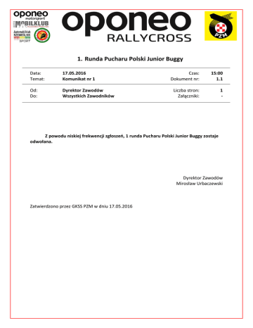 1. Runda Pucharu Polski Junior Buggy Data: Temat: 17.05.2016 Komunikat nr 1 Od: Do: Dyrektor Zawodów Wszystkich Zawodników Czas: Dokument nr: 15:00 1.1 Liczba stron: Załączniki: 1 - Z powodu niskiej frekwencji zgłoszeń, 1 runda Pucharu Polski Junior Buggy zostaje odwołana. Dyrektor Zawodów Mirosław Urbaczewski Zatwierdzono przez GKSS PZM w dniu 17.05.2016