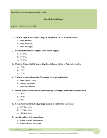 Egzamin dla kandydatów na przewodników miejskich Gdańsk, Gdynia i Sopot przykład — część pisemna (wersja B) 1. Twórcą zegara astronomicznego w bazylice N. M. P. w Gdańsku był: a. Hans Kramer, b. Hans Connath, c. Hans Düringer. 2. Powierzchnia miasta Sopotu to wielkość rzędu: a. 53 km2, b. 37 km2, c. 17 km2. 3. Obecna Akademia Morska w Gdyni została powołana w Tczewie w roku: a. 1920, b. 1923, c. 1918. 4. Twórcą projektu Pomnika Obrońców Poczty Polskiej jest: a. Wawrzyniec Samp, b. Robert Pepliński, c. Wincenty Kućma. 5. Wolne Miasto Gdańsk ukonstytuowało się jako organ administracyjny w roku: a. 1919, b. 1920, c. 1921. 6. Powierzchnia Morza Bałtyckiego łącznie z cieśninami to obszar: a. 365 tys. km2, b. 415 tys. km2, c. 480 tys. km2. 7. Jan Heweliusz był stypendystą; a. Króla Jana III Sobieskiego, b. Króla Stefana Batorego, Oddział Międzyuczelniany PTTK w Warszawie http://szkolenia.om.pttk.pl Opracowano na podstawie materiałów udostępnionych przez urzędy wojewódzkie 1 przykład Egzamin dla kandydatów na przewodników miejskich — Gdańsk, Gdynia i Sopot c. Króla Władysława IV. 8. Założycielem biblioteki w kościele N. M. P. w Gdańsku był: a. Andrzej Słomow, b. Henryk von Plauen, c. Jan Bernard Bonifacio. 9. Ustawa o budowie portu morskiego w Gdyni została przyjęta przez Sejm R. P. w roku: a. 1920, b. 1922, c. 1924. 10. Grand Cassino Hotel w Sopocie został oddany do użytku w roku: a. 1924, b. 1927, c. 1931. 11. Kościół św. Mikołaja został przekazany Dominikanom w roku 1227 przez: a. Świętopełka, b. Mściwoja, c. Subisława. 12. Dowódca obrony Westerplatte mjr Henryk Sucharski zmarł w roku 1946 w: a. Modenie, b. Neapolu, c. Bolonii. 13. Pierwszym polskim przedsiębiorstwem żeglugowym w Gdyni było: a. Gdynia American Line, b. „Żegluga Polska”, c. Polska Żegluga Wiślana. 14. Ostatnim wysokim komisarzem Ligi Narodów w WMG w l. 1937-1939 był: a. Karl Jakob Burckhardt, b. Lester Sean, c. Manfredo Grawina. 15. Do twórców Centrum miasta Gdyni, które zostało uznane za zabytek sztuki modernistycznej należeli: a. Witold Minkiewicz, Władysław Czerny, b. Włodzimierz Prochaska, Kazimierz Jakimowicz, c. Ryszard Gałczyński, Julian Rummel. 2 http://szkolenia.om.pttk.pl Oddział Międzyuczelniany PTTK w Warszawie Opracowano na podstawie materiałów udostępnionych przez urzędy wojewódzkie Egzamin dla kandydatów na przewodników miejskich — Gdańsk, Gdynia i Sopot przykład 16. Ratusz Staromiejski w Gdańsku zbudowany został w stylu: a. gotyckim, b. manieryzmu niderlandzkiego, c. neorenesansu. 17. Witraż w prezbiterium Katedry Oliwskiej, przedstawiający Trójcę Świętą powstał według projektu: a. Józefa Wnukowa b. Zofii Baudouin de Courtenay, c. Maria Korpalska. 18. Zbudowane w Sopocie w roku 1907 Łazienki Południowe służyły jako: a. miejsce kąpieli leczniczych, b. klub i restauracja dla kuracjuszy, c. przebieralnia dla plażowiczów. 19. Jerzy Afanasjew, którym mieszkał i tworzył w Sopocie to: a. malarz marynista, b. pisarz, poeta i reżyser, c. aktor Teatru Muzycznego w Gdyni. 20. Filharmonia Bałtycka w Gdańsku nosi imię: a. Stanisława Moniuszki, b. Fryderyka Chopina, c. Witolda Lutosławskiego. 21. Wieża Ratusza Głównomiejskiego w Gdańsku została zwieńczona hełmem, którego twórcą był: a. Dirk Daniels, b. Michał Marquardt, c. Henryk Ungeradin. 22. Opera Leśna w Sopocie rozpoczęła działalność w roku: a. 1909, b. 1919, c. 1929. 23. Bałtyk w okresie swojego powstawania przechodził różnie nazwane fazy rozwoju — obecna faza to: a. Morze Mya, b. Morze Yoldiowe, c. Jezioro Ancylusowe. Oddział Międzyuczelniany PTTK w Warszawie http://szkolenia.om.pttk.pl.pl Opracowano na podstawie materiałów udostępnionych przez urzędy wojewódzkie 3 przykład Egzamin dla kandydatów na przewodników miejskich — Gdańsk, Gdynia i Sopot 24. Św. Wojciech w roku 982 został biskupem: a. Pragi, b. Kolonii, c. Wiednia. 25. Najstarszą miejscowością w okolicach dawnej Gdyni jest wieś kościelna: a. Orłowo, b. Oksywie, c. Grabówe. 26. Port Północny w Gdańsku może przyjmować statki o ładowności do: a. 100 tys. ton, b. 150 tys. ton, c. 200 tys. ton. 27. Joachim Pastorius — lekarz, pedagog i historyk, po przeniesieniu się z Elbląga do Gdańska w 1655 roku został: a. założycielem pierwszej drukarni w Gdańsku, b. kaznodzieją w Kościele NMP, c. wykładowcą w gdańskim Gimnazjum Akademickim. 28. Twórcą Zegara Groblowego na kościele N. M. P. jest: a. Jan Antoni Horn, b. Hans Konnath, c. Henryk Kawecki. 29. Słowo „ława” w dawnym Gdańsku oznaczało: a. ciało ustrojowe średniowiecznego miasta, b. synonim kramu, c. specyficzną organizację cechową. 30. Rezerwat przyrody to: a. obszar zachowany w stanie naturalnym lub mało zmienionym, cenny ze względów przyrodniczych, naukowych i kulturowych objęty ochroną ścisłą, ochroną częściową lub krajobrazową, b. ciąg poszczególnych zespołów ekosystemów wynikających z ukształtowania terenu i naturalnych cech krajobrazu, c. miejsca, z którymi kojarzą się wydarzenia o charakterze historycznym lub patriotycznym, z zachowanymi obiektami kulturowymi. 4 http://szkolenia.om.pttk.pl Oddział Międzyuczelniany PTTK w Warszawie Opracowano na podstawie materiałów udostępnionych przez urzędy wojewódzkie